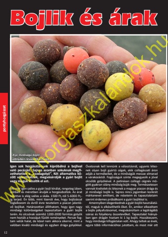 pontyhorg%u00e1szat12Igen sok horg%u00e1szt%u00e1rsunk kipr%u00f3b%u00e1ln%u00e1 a bojlival val%u00f3 pec%u00e1z%u00e1st. Sajnos azonban sokuknak megfizethetetlen a %u201ecsodagoly%u00f3%u201d. K%u00e9t alternat%u00edva k%u00f6z%u00f6tt v%u00e1laszthatnak, megv%u00e1s%u00e1rolj%u00e1k a gy%u00e1ri bojlit vagy maguk k%u00e9sz%u00edtik el azt.Ma m%u00e1r igen sz%u00e9les a gy%u00e1ri bojli k%u00edn%u00e1lat, rengeteg %u00edzben, sz%u00ednben %u00e9s m%u00e9retben %u00e1rulj%u00e1k a horg%u00e1szboltok. Az %u00e1rat tekintve is el%u00e9g sz%u00e9les a sk%u00e1la. 1500 Ft,-t%u00f3l 5-6000 Ft,- ig terjed. %u00c9n t%u00f6bb, mint tizen%u00f6t %u00e9ve, hogy bojliz%u00e1ssal foglalkozom %u00e9s %u00e9vr%u0151l %u00e9vre tesztelem a piacon jelenl%u00e9v%u0151 bojlikat. Hat%u00e1rozottan %u00e1ll%u00edthatom, hogy igen nagy min%u0151s%u00e9gi k%u00fcl%u00f6nbs%u00e9geket tapasztaltam a gy%u00e1ri bojlik ter%u00e9n. Az olcs%u00f3nak sz%u00e1m%u00edt%u00f3 1200-2000 forintos goly%u00f3k nem hozt%u00e1k a hozz%u00e1juk f%u0171z%u00f6tt rem%u00e9nyeket. Persze fogtam vel%u00fck halat, de k%u00f6zel nem akkora sikerrel, mint a val%u00f3ban kiv%u00e1l%u00f3 min%u0151s%u00e9g%u0171 %u00e9s egyben dr%u00e1ga goly%u00f3kkal. %u00d3vatosnak kell lenn%u00fcnk a v%u00e1laszt%u00e1sn%u00e1l, ugyanis l%u00e9teznek olyan bojli gy%u00e1rt%u00f3 c%u00e9gek, akik csillag%u00e1szati %u00e1ron adj%u00e1k a term%u00e9keiket, de a min%u0151s%u00e9g%u00fck messze elmarad a v%u00e1rakoz%u00e1st%u00f3l. Fog%u00f3ss%u00e1guk szinte megegyezik a j%u00f3val olcs%u00f3bb goly%u00f3k%u00e9val. A patin%u00e1san csillog%u00f3 c%u00e9gn%u00e9v m%u00f6g%u00f6tt gyakran sil%u00e1ny min%u0151s%u00e9g b%u00fajik meg. Term%u00e9szetesen vannak kiv%u00e9telek %u00e9s l%u00e9teznek a magyar piacon dr%u00e1ga %u00e9s j%u00f3 min%u0151s%u00e9g%u0171 bojlik is. Sajnos nincs jogomban konkr%u00e9t m%u00e1rkanevet eml%u00edteni, de n%u00e9zeteim %u00e9s tapasztalataim szerint %u00e9rdemes pr%u00f3b%u00e1lkozni a gy%u00e1ri bojlikkal is.Amennyiben idegenkednek a gy%u00e1ri bojlik haszn%u00e1lat%u00e1t%u00f3l, maguk is elk%u00e9sz%u00edthetik %u0151ket. %u00c9n, amikor elkezdtem a bojlis p%u00e1lyafut%u00e1somat, megv%u00e1s%u00e1roltam a legdr%u00e1g%u00e1bb sz%u00e1raz %u00e9s foly%u00e9kony %u00f6sszetev%u0151ket. Tapasztalat hi%u00e1ny%u00e1ban igen dr%u00e1g%u00e1n hoztam ki 1 kg bojlit. Hozz%u00e1teszem, hogy min%u0151s%u00e9ge kifog%u00e1stalan volt. Ahogy teltek az %u00e9vek, egyre t%u00f6bb inform%u00e1ci%u00f3hoz jutottam, %u00e9s most m%u00e1r ott Bojlik %u00e9s %u00e1rakA j%u00f3 min%u0151s%u00e9g%u0171 bojlitel%u0151nyben r%u00e9szes%u00edtik a halakwww.horgaszkalandok.hu