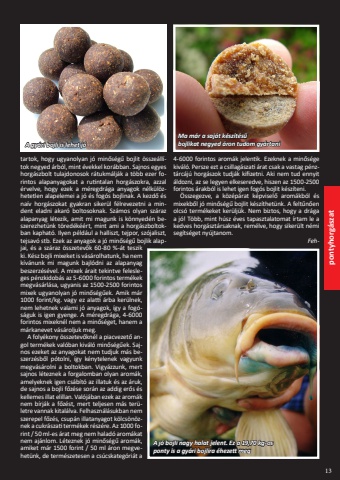 pontyhorg%u00e1szat13tartok, hogy ugyanolyan j%u00f3 min%u0151s%u00e9g%u0171 bojlit %u00f6ssze%u00e1ll%u00edtok negyed %u00e1rb%u00f3l, mint %u00e9vekkel kor%u00e1bban. Sajnos egyes horg%u00e1szbolt tulajdonosok r%u00e1tukm%u00e1lj%u00e1k a t%u00f6bb ezer forintos alapanyagokat a rutintalan horg%u00e1szokra, azzal %u00e9rvelve, hogy ezek a m%u00e9regdr%u00e1ga anyagok n%u00e9lk%u00fcl%u00f6zhetetlen alapelemei a j%u00f3 %u00e9s fog%u00f3s bojlinak. A kezd%u0151 %u00e9s na%u00edv horg%u00e1szokat gyakran siker%u00fcl f%u00e9lrevezetni a mindent eladni akar%u00f3 boltosoknak. Sz%u00e1mos olyan sz%u00e1raz alapanyag l%u00e9tezik, amit mi magunk is k%u00f6nnyed%u00e9n beszerezhet%u00fcnk t%u00f6red%u00e9k%u00e9%u00e9rt, mint ami a horg%u00e1szboltokban kaphat%u00f3. Ilyen p%u00e9ld%u00e1ul a halliszt, tejpor, sz%u00f3jaliszt, tejsav%u00f3 stb. Ezek az anyagok a j%u00f3 min%u0151s%u00e9g%u0171 bojlik alapjai, %u00e9s a sz%u00e1raz %u00f6sszetev%u0151k 60-80 %-%u00e1t teszik ki. K%u00e9sz bojli mixeket is v%u00e1s%u00e1rolhatunk, ha nem k%u00edv%u00e1nunk mi magunk bajl%u00f3dni az alapanyag beszerz%u00e9s%u00e9vel. A mixek %u00e1rait tekintve felesleges p%u00e9nzkidob%u00e1s az 5-6000 forintos term%u00e9kek megv%u00e1s%u00e1rl%u00e1sa, ugyanis az 1500-2500 forintos mixek ugyanolyan j%u00f3 min%u0151s%u00e9g%u0171ek. Amik m%u00e1r 1000 forint/kg. vagy ez alatti %u00e1rba ker%u00fclnek, nem lehetnek valami j%u00f3 anyagok, %u00edgy a fog%u00f3s%u00e1guk is igen gyenge. A m%u00e9regdr%u00e1ga, 4-6000 forintos mixekn%u00e9l nem a min%u0151s%u00e9get, hanem a m%u00e1rkanevet v%u00e1s%u00e1roljuk meg. A foly%u00e9kony %u00f6sszetev%u0151kn%u00e9l a piacvezet%u0151 angol term%u00e9kek val%u00f3ban kiv%u00e1l%u00f3 min%u0151s%u00e9g%u0171ek. Sajnos ezeket az anyagokat nem tudjuk m%u00e1s beszerz%u00e9sb%u0151l p%u00f3tolni, %u00edgy k%u00e9nytelenek vagyunk megv%u00e1s%u00e1rolni a boltokban. Vigy%u00e1zzunk, mert sajnos l%u00e9teznek a forgalomban olyan arom%u00e1k, amelyeknek igen cs%u00e1b%u00edt%u00f3 az illatuk %u00e9s az %u00e1ruk, de sajnos a bojli f%u0151z%u00e9se sor%u00e1n az addig er%u0151s %u00e9s kellemes illat elillan. Val%u00f3j%u00e1ban ezek az arom%u00e1k nem b%u00edrj%u00e1k a f%u0151z%u00e9st, mert teljesen m%u00e1s ter%u00fcletre vannak kital%u00e1lva. Felhaszn%u00e1l%u00e1sukban nem szerepel f%u0151z%u00e9s, csup%u00e1n illatanyagot k%u00f6lcs%u00f6n%u00f6znek a cukr%u00e1szati term%u00e9kek r%u00e9sz%u00e9re. Az 1000 forint / 50 ml-es %u00e1rat meg nem halad%u00f3 arom%u00e1kat nem aj%u00e1nlom. L%u00e9teznek j%u00f3 min%u0151s%u00e9g%u0171 arom%u00e1k, amiket m%u00e1r 1500 forint / 50 ml %u00e1ron megvehet%u00fcnk, de term%u00e9szetesen a cs%u00facskateg%u00f3ri%u00e1t a 4-6000 forintos arom%u00e1k jelentik. Ezeknek a min%u0151s%u00e9ge kiv%u00e1l%u00f3. Persze ezt a csillag%u00e1szati %u00e1rat csak a vastag p%u00e9nzt%u00e1rc%u00e1j%u00fa horg%u00e1szok tudj%u00e1k kifizetni. Aki nem tud ennyit %u00e1ldozni, az se legyen elkeseredve, hiszen az 1500-2500 forintos %u00e1rakb%u00f3l is lehet igen fog%u00f3s bojlit k%u00e9sz%u00edteni. %u00d6sszegezve, a k%u00f6z%u00e9p%u00e1rat k%u00e9pvisel%u0151 arom%u00e1kb%u00f3l %u00e9s mixekb%u0151l j%u00f3 min%u0151s%u00e9g%u0171 bojlit k%u00e9sz%u00edthet%u00fcnk. A felt%u0171n%u0151en olcs%u00f3 term%u00e9keket ker%u00fclj%u00fck. Nem biztos, hogy a dr%u00e1ga a j%u00f3! T%u00f6bb, mint h%u00fasz %u00e9ves tapasztalatomat %u00edrtam le a kedves horg%u00e1szt%u00e1rsaknak, rem%u00e9lve, hogy siker%u00fclt n%u00e9mi seg%u00edts%u00e9get ny%u00fajtanom.FehA gy%u00e1ri bojli is lehet j%u00f3Ma m%u00e1r a saj%u00e1t k%u00e9sz%u00edt%u00e9s%u0171bojlikat negyed %u00e1ron tudom gy%u00e1rtaniA j%u00f3 bojli nagy halat jelent. Ez a 19,70 kg-os ponty is a gy%u00e1ri bojlira %u00e9hezett meg