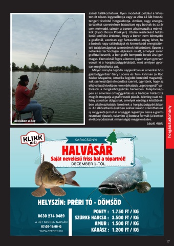 horg%u00e1sztudom%u00e1ny17sz%u00e9n%u00e9l tal%u00e1lkozhatunk. Ilyen modellek p%u00e9ld%u00e1ul a Winston %u00f6t r%u00e9szes legyez%u0151botja vagy az Abu 12 l%u00e1b hossz%u00fa, tengeri t%u00e1vdob%u00f3 horg%u00e1szbotja. Amikor, nagy energiatartal%u00e9kot szeretn%u00e9nek biztos%u00edtani egy botnak %u00e9s az %u00e1r sem m%u00e9rvad%u00f3, szint%u00e9n a boront alkalmazz%u00e1k a m%u00e9rn%u00f6k%u00f6k (Ryobi Boron Proskyer). Utols%u00f3 r%u00e9szletk%u00e9nt felt%u00e9tlen%u00fcl eml%u00edt%u00e9st %u00e9rdemel, hogy a boron nem k%u00f6nnyebb a grafitn%u00e1l, azonban egy fantasztikus anyag lehet, ha a botnak nagy szil%u00e1rds%u00e1got %u00e9s kiemelked%u0151 energia%u00e1tviteli tulajdons%u00e1gokat szeretn%u00e9nek k%u00f6lcs%u00f6n%u00f6zni. %u00c9ppen a neh%u00e9zkes technol%u00f3giai elj%u00e1r%u00e1sok miatt, amelyek sor%u00e1n grafittal keverik, a bor-grafit kompozit botok %u00e1ra igen magas. Ezen okn%u00e1l fogva a boron %u00e9ppen olyan gyorsan vonult ki a horg%u00e1szbotgy%u00e1rt%u00e1sb%u00f3l, mint amilyen gyorsan megh%u00f3d%u00edtotta azt.Milyen ir%u00e1nyba fejl%u0151dik napjainkban az amerikai horg%u00e1szbotgy%u00e1rt%u00e1s? Gary Loomis %u00e9s Tom Kirkman (a Rod Maker Magazine, Amerika legjobb bot%u00e9p%u00edt%u0151 magazinj%u00e1nak szerkeszt%u0151je) elmond%u00e1sa szerint, %u00fagy t%u0171nik, hogy az elk%u00f6vetkez%u0151 %u00e9vekben nem v%u00e1rhat%u00f3ak %u201eegetrenget%u0151%u201d v%u00e1ltoz%u00e1sok a horg%u00e1szbotgy%u00e1rt%u00e1s berkeiben. Tulajdonk%u00e9ppen az amerikai %u0171rhaj%u00f3gy%u00e1rt%u00e1s %u00e9s a hadiipar hat%u00e1rozza meg %u00e9s mozgatja a grafitrostok piac%u00e1t. Jelenleg csak n%u00e9h%u00e1ny %u00faj roston dolgoznak, amelyek esetleg a k%u00e9s%u0151bbiekben alkalmazhat%u00f3ak lenn%u00e9nek a horg%u00e1szbotgy%u00e1rt%u00e1sban is. Az elk%u00f6vetkez%u0151 %u00e9vekben sokkal ink%u00e1bb sz%u00e1m%u00edthatunk %u00faj m%u0171gyanta (ezzel az anyaggal ragasztj%u00e1k %u00f6ssze a grafitrostokat) t%u00edpusok, valamint %u00faj bottest form%u00e1k (a bottest elv%u00e9konyod%u00e1s%u00e1nak milyens%u00e9ge) megjelen%u00e9s%u00e9re.L%u00e1szl%u00f3 Attila Akci%u00f3ban a bot