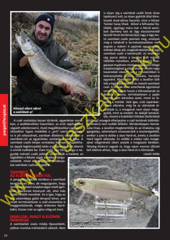 perget%u0151horg%u00e1szat24A csali vontat%u00e1sa lassan t%u00f6rt%u00e9nik, egyenletes vonalban, a wobblerekhez hasonl%u00f3an, az ors%u00f3 seg%u00edts%u00e9g%u00e9vel v%u00e9gzett v%u00e9letlenszer%u0171, r%u00f6vid meg%u00e1ll%u00edt%u00e1sokkal vagy gyors%u00edt%u00e1sokkal. Egyes modellek a %u201ejerk%u201d-szer%u0171 mozg%u00e1sokra is j%u00f3l v%u00e1laszolnak, azonban %u00e1ltal%u00e1nos szab%u00e1lyk%u00e9nt a swimbait-n%u00e9l az egyenletes vontat%u00e1s a siker titka. A swimbait csalik helyes vontat%u00e1sa k%u00f6nnyen elsaj%u00e1t%u00edthat%u00f3, (egyik legk%u00f6nnyebb) tal%u00e1n a vil%u00e1gszerte el%u00e9rt siker%u00fck is ennek tudhat%u00f3 be. Ezen k%u00edv%u00fcl, %u00fagy t%u0171nik, hogy a nagyobb m%u00e9ret%u0171 csalik jobban szelekt%u00e1lj%u00e1k a halakat, ez legal%u00e1bbis a fekete s%u00fcg%u00e9r eset%u00e9ben beigazol%u00f3dott, mivel a legnagyobb p%u00e9ld%u00e1nyokat swimbait csalival fogt%u00e1k ki.SWIMBAIT,AZ EL%u0150%u00cdT%u00c9LETEKEN T%u00daLA perget%u0151horg%u00e1szok k%u00f6r%u00e9ben a swimbait kev%u00e9sb%u00e9 van jelen, de megs%u00fagn%u00e1m, hogy term%u00e9szet k%u00f6zeli tulajdons%u00e1gai miatt igencsak sikeresnek bizonyult ott, ahol m%u00e1s csalik cs%u0151d%u00f6t mondtak. Az is igaz, hogy az %u00e1ra valamik%u00e9pp g%u00e1tl%u00f3 t%u00e9nyez%u0151 lehet, ami miatt term%u00e9szetesen a csali elveszt%u00e9se is meggondoland%u00f3, m%u00e9gis %u00e9rdemes kipr%u00f3b%u00e1lni, hiszen m%u00e1r az eg%u00e9sz vil%u00e1g ezt teszi. JAVALLON, AVAGY A KL%u00d3NOK H%u00c1BOR%u00daJAA swimbaitek %u00fasz%u00e1s m%u00f3dja t%u00edpusonk%u00e9nt, jobban mondva m%u00e1rk%u00e1nk%u00e9nt v%u00e1ltozik. Nem is olyan r%u00e9g a swimbait csalik farok r%u00e9sze lap%u00e1tszer%u0171 volt, az olyan gy%u00e1rt%u00f3k %u00e1ltal l%u00e9trehozott shad-okhoz hasonl%u00f3, mint a Mister Twister Sassy Shad. Id%u0151vel a felhozatal fejl%u0151d%u00f6tt, %u00fagyhogy m%u00e1ra m%u00e1r a hibrid swimbait (kem%u00e9ny test %u00e9s l%u00e1gy elasztomerb%u0151l k%u00e9sz%u00fclt farok kombin%u00e1ci%u00f3ja) vagy a l%u00e1gy test%u0171 swimbait csalik jelentek meg, amelyek m%u00e9g a halakn%u00e1l is term%u00e9szetesebben mozognak a v%u00edzben! A jap%u00e1nok egy zseni%u00e1lis %u00f6tlettel %u00e1lltak el%u0151, megk%u00fcl%u00f6nb%u00f6ztetve a l%u00e1gy swimbait csalit a kem%u00e9nyt%u0151l. Az Imakatsu c%u00e9g piacra dobta a Javallon Soft m%u00e1rk%u00e1t t%u00f6bbf%u00e9le m%u00e9retben, amely %u00e9letszer%u0171 mozg%u00e1s%u00e1val majdnem minden ragadoz%u00f3t kifog%u00f3 tulajdons%u00e1g%u00e1val a vil%u00e1g minden r%u00e9sz%u00e9n nagy kavarod%u00e1st okozott, ezt a mi vizeinkben is bebizony%u00edtotta s%u00fcll%u0151re, csuk%u00e1ra, harcs%u00e1ra egyar%u00e1nt. R%u00f6vid id%u0151n bel%u00fcl a Javallon Soft lett a legink%u00e1bb kedvelt %u00e9s m%u00e1solt swimbait csali. A k%u00ednaiak %u00e9s az amerikaiak egym%u00e1ssal versengve fogtak hozz%u00e1 a kl%u00f3noz%u00e1s%u00e1nak %u00e9s dobt%u00e1k a piacra, term%u00e9szetesen a jap%u00e1n gy%u00e1rt%u00f3t nem k%u00e1ros%u00edtva ezzel, mivel az lev%u00e9dte a m%u00e1rk%u00e1t. Val%u00f3 igaz, csak Jap%u00e1nban. Ennek ellen%u00e9re, m%u00e9g ha az ut%u00e1nzatok olcs%u00f3bbak is, a mozg%u00e1suk nem olyan meg -gy%u0151z%u0151, mint az eredeti. Az alakj%u00e1t lem%u00e1solt%u00e1k, viszont a kialak%u00edt%u00e1si titkokat (k%u00fcl%u00f6nb%u00f6z%u0151 s%u0171r%u0171s%u00e9g%u0171 anyagok elhelyez%u00e9se a csali test%u00e9nek k%u00fcl%u00f6nb%u00f6z%u0151 r%u00e9szein) nem tudt%u00e1k felfedni. Mindenk%u00e9ppen Kamatsuka Imae, a Javallon megteremt%u0151je %u00e9s az Imakatsu c%u00e9g igazgat%u00f3ja, valamelyest visszaszerzett a vesztes%u00e9gekb%u0151l, amikor a piacra dobta a Java Hard-ot, amely a Javallon Hard tagolt v%u00e1ltozata. Ez ut%u00f3bbi a v%u00edzben val%u00f3 mozg%u00e1s%u00e1val vil%u00e1gm%u00e9ret%u0171 sikert aratott a horg%u00e1szok k%u00f6r%u00e9ben. T%u00e9nyleg k%u00edv%u00e1ncsi vagyok r%u00e1, hogy vajon mennyi id%u0151nek kell eltelnie ahhoz, hogy a Java Hard-ot is kl%u00f3nozz%u00e1k. L%u00e1szl%u00f3 AttilaK%u00f6nny%u0171 sikert el%u00e9rni a swimbait-elVajon megveti n%u00e1lunk is a l%u00e1b%u00e1t a swimbait m%u00f3dszer?www.horgaszkalandok.hu