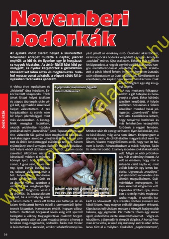 16%u00f6n%u00f6k %u00edrt%u00e1kNovemberi bodork%u00e1kAz %u00e9jszaka most cser%u00e9lt helyet a sz%u00fcrk%u00fclettel. November k%u00f6zep%u00e9t mutatta a napt%u00e1r, j%u00f3kor%u00e1t enyh%u00fclt az id%u0151 %u00e9s %u00e9n ilyenkor egy j%u00f3 horg%u00e1szat- ra vagyok hivatalos. Az %u00e1rt%u00e9r f%u0171zf%u00e1i k%u00f6zt k%u00f6d go- molygott, %u00e9s nyulak kerget%u0151ztek a g%u00e1toldalban. Id%u0151nk%u00e9nt k%u00e9t l%u00e1bra %u00e1lltak %u00e9s megb%u00e1multak. Vala- hol messze vonat zakatolt, a v%u00edzpart s%u00f6t%u00e9t f%u00e1i %u00e1r- ny%u00e9k%u00e1ban f%u00e1c%u00e1nkakas ijedezett.A v%u00edzhez %u00e9rve lepakoltam %u00e9s %u201efelder%u00edt%u0151%u201d %u00fatra indultam. Ekkor kezdett vil%u00e1gosodni. T%u00f6bb j%u00f3nak l%u00e1tsz%u00f3 helyet tal%u00e1ltam %u00e9s alapos t%u00f6preng%u00e9s ut%u00e1n v%u00e9g%u00fcl k%u00e9t, egym%u00e1shoz k%u00f6zel l%u00e9v%u0151 helyet v%u00e1lasztottam. A t%u00e9li horg%u00e1szatban az etet%u00e9s nem b%u00edr olyan jelent%u0151s%u00e9ggel, mint m%u00e1s %u00e9vszakokban. A keszegf%u00e9l%u00e9k mozg%u00e1sa lecs%u00f6kken, akad%u00f3k v%u00e9delm%u00e9be h%u00faz%u00f3dva pr%u00f3b%u00e1lnak n%u00e9mi %u201ebetev%u0151h%u00f6z%u201d jutni. Tapasztalatom szerint, v%u00edzbed%u0151lt f%u00e1k gallyai k%u00f6zt megh%u00faz%u00f3d%u00f3 bodork%u00e1k, karikakeszegek azonban %u201emegh%u00e1l%u00e1lj%u00e1k%u201d a frissen pir%u00edtott %u00e9s %u0151r%u00f6lt kendermaggal cs%u00e1b%u00edt%u00f3v%u00e1 tett k%u00e9t, h%u00e1rom ty%u00faktoj%u00e1snyi etet%u0151 anyagot. Ez%u00e9rt %u00e9n mind k%u00e9t kiv%u00e1lasztott helyre ebb%u0151l dobtam kett%u0151t, kett%u0151t. Finom %u00fasz%u00f3s szerel%u00e9st %u00e1ll%u00edtottam %u00f6ssze a k%u00f6vetkez%u0151 m%u00f3don: 6 m%u00e9teres k%u00f6nny%u0171 spicc bot, 0,10 mm zsin%u00f3r, 1 g-os %u00fasz%u00f3, 16-os horog. Igen bev%u00e1lt %u00f6ssze%u00e1ll%u00edt%u00e1s ez, sokszor vizsg%u00e1zott m%u00e1r a t%u00e9li foly%u00f3v%u00edzben. R%u00e1n%u00e9z%u00e9sre tal%u00e1n t%u00fal finomnak t%u0171nik ez az %u00e1raml%u00f3 v%u00edzhez, azonban a v%u00edzbed%u0151lt f%u00e1k megtorpantj%u00e1k a sodr%u00e1st. M%u00f6g%u00f6tt%u00fck lecsitul az %u00e1raml%u00e1s, %u00e9s tapasztalatom szerint, ha a v%u00edzm%u00e9lys%u00e9g el%u00e9ri a h%u00e1rom m%u00e9tert, szinte ott biztos van haltanya. Az %u00e1ltalam kiv%u00e1lasztott helyek ebb%u0151l a szempontb%u00f3l %u00edg%u00e9retesnek l%u00e1tszottak. Hamarosan elv%u00e1lik, hogyan v%u00e1lasztottam. Partk%u00f6zeli horg%u00e1szat l%u00e9v%u00e9n el%u00e9g volt spiccr%u0151l bel%u00f3gatni a v%u00e9kony tr%u00e1gyagiliszt%u00e1val csalizott horgot. N%u00e9h%u00e1ny pr%u00f3ba ut%u00e1n az %u00fasz%u00f3 mozg%u00e1sa jelezte a horog a fen%u00e9ken meg-megakadva, sodr%u00f3dik. Tal%u00e1n m%u00e1r t%u00edzszer is le%u00fasztattam a szerel%u00e9st, amikor leheletfinomnyi kap%u00e1st jelzett az %u00e9rz%u00e9keny %u00fasz%u00f3. %u00d3vatosan akasztottam, %u00e9s l%u00e1m apr%u00f3cska bodorka verg%u0151d%u00f6tt a horgon. Amolyan %u201ecsuk%u00e1z%u00f3%u201d m%u00e9ret. %u00dajra csaliztam. Ekkorra m%u00e1r teljesen kivil%u00e1gosodott, a reggelt egy felrep%u00fcl%u0151 f%u00e1c%u00e1nkakas hangos m%u00e9ltatlankod%u00e1ssal jelentette be, amint %u00e1tsikl%u00f3zott a p%u00e1r%u00e1t lehel%u0151 foly%u00f3n. N%u00e9h%u00e1ny sikertelen %u00fasztat%u00e1s ut%u00e1n v%u00e1ltoztattam az %u00fasz%u00f3 be%u00e1ll%u00edt%u00e1s%u00e1n. R%u00f6vid%u00edtettem az ereszt%u00e9ken, de kap%u00e1st nem siker%u00fclt kicsikarnom. Csak k%u00e9s%u0151bb fogtam egy alig kisujjnyi s%u00fcg%u00e9rt. A nap mostanra felkapaszkodott a g%u00e1t tetej%u00e9re %u00e9s beragyogta a vizet. Ekkor k%u00fcl%u00f6n%u00f6s sz%u00ednj%u00e1t%u00e9k kezd%u0151d%u00f6tt. A foly%u00f3n sz%u00e9lt%u00e9ben hossz%u00e1ban a felsz%u00edn k%u00f6zel%u00e9ben mozdul%u00f3 halak jellegzetes %u201eburv%u00e1nyait%u201d lehetett l%u00e1tni. Csod%u00e1lkozva l%u00e1ttam, hogy teny%u00e9rnyi bodork%u00e1k %u00e9s m%u00e1s feltehet%u0151en keszegf%u00e9l%u00e9k f%u00fcr%u00f6dnek a reggeli f%u00e9nyben. Mindez tal%u00e1n t%u00edz percig tarthatott. Ilyen lubickol%u00e1st, pl%u00e1ne k%u00e9s%u0151 %u0151sszel, m%u00e9g soha nem l%u00e1ttam. Elt%u00f6prengtem a jelens%u00e9g ok%u00e1n, de c%u00e1folhatatlan magyar%u00e1zatot nem tal%u00e1ltam. Viszont meggy%u0151z%u0151dtem arr%u00f3l, hogy van itt hal, nem is kev%u00e9s. %u00c1thurcolkodtam a m%u00e1sik helyhez. Tal%u00e1n t%u00edz m%u00e9terrel od%u00e9bb. Ez a hely azonban sokkal akad%u00f3sabb volt. M%u00e9gis az els%u0151 pr%u00f3b%u00e1lkoz%u00e1s m%u00e1r eredm%u00e9nyt hozott. Az volt az %u00e9rz%u00e9sem, hogy m%u00e1r a s%u00fcllyed%u0151 csalit kapta el, mint ut%u00f3bb kider%u00fclt egy izmos bodorka. Ugyancsak %u201evesz%u00e9lyes%u201d gallyak k%u00f6z%u00f6tti m%u0171veletek ut%u00e1n siker%u00fclt megsz%u00e1kolnom. Gy%u00f6ny%u00f6rk%u00f6dve m%u00e9regettem, hiszen k%u00f6zel f%u00e9l kilogramm volt. Kapkodva dobtam %u00fajra, azonban a siets%u00e9g m%u00e1ris megboszszulta mag%u00e1t. A szerel%u00e9s leakadt %u00e9s odaveszett. %u00dajra szerel%u00e9s, k%u00f6zben szemem sark%u00e1b%u00f3l l%u00e1tom, hogy nagyon el%u0151kel%u0151 l%u00e1togat%u00f3m %u00e9rkezett. K%u00e1pr%u00e1zatos tollruh%u00e1ban, messze a k%u00f6rny%u00e9k leg%u00fcgyesebb hal%u00e1sza, egy j%u00e9gmad%u00e1r. P%u00e1r m%u00e9terre t%u0151lem egy sz%u00e1raz %u00e1gr%u00f3l, %u00e9rdekl%u0151dve n%u00e9zte sz%u00f6szm%u00f6t%u00f6l%u00e9semet. V%u00e9gre elk%u00e9sz%u00fcltem, a j%u00e9gmad%u00e1r is elrep%u00fclt dolg%u00e1ra. A horog finoman %u00e9rt a v%u00edzbe, az %u00fasz%u00f3 alig m%u00e9ternyi sodr%u00e1s ut%u00e1n oldalazva t%u0171nt el a m%u00e9lyben. Csukl%u00f3b%u00f3l %u201ebep%u00f6ccintettem%u201d, A j%u00e9gmad%u00e1r k%u00edv%u00e1ncsian figyeltesz%u00f6szm%u00f6t%u00f6l%u00e9semetH%u00e1rom-n%u00e9gy %u00fcres %u00fasztat%u00e1s ut%u00e1n mindig volt egy-egy %u00f6nk%u00e9nt jelentkez%u0151 bodorkawww