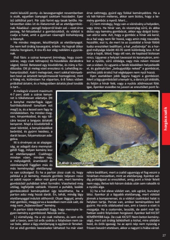 27 horg%u00e1szcsalikmelni k%u00e9sz%u00fcl%u0151 ponty- %u00e9s keszegsereglet novemberben is eszik, egyetlen %u00edzanyagot szoktam hozz%u00e1adni. Eper %u00edz%u0171 %u00fcd%u00edt%u0151ital port. P%u00e1r sz%u00e1z forint egy tasak bel%u0151le. Hat%u00e1rozottan %u00e9des %u00edzt %u00e9s illatarom%u00e1t ad az etet%u0151gomb%u00f3cnak. R%u00e1ad%u00e1sul %u2013 pezsg%u0151 italporr%u00f3l l%u00e9v%u00e9n sz%u00f3 %u2013 vizet %u00e9rve pezseg, fel-felszabadul a gomb%u00f3cokb%u00f3l, %u00e9s v%u00edzk%u00f6zt is csalja a halat, amit a gyorsan r%u00e1seregl%u0151 kishaln%u00e9ps%u00e9g is bizony%u00edt.Ha mindez megvan, k%u00e9sz%u00edthetj%u00fck az etet%u0151anyagot. De nem kell %u00f3r%u00e1kig kavargatni, %u00e9rlelni. Ha hajnali %u00f6tkor indulsz horg%u00e1szni, 4 %u00f3ra 45-kor el%u00e9g nekil%u00e1tni a gy%u00far%u00e1snak. Els%u0151 f%u00e1zis: a sz%u00e1raz kenyeret (mindegy, hogy csontsz%u00e1raz, vagy csak k%u00e9tnapos) t%u00edz-h%u00faszdek%u00e1s darabokra v%u00e1god, t%u00f6r%u00f6d. Beteszed egy kisv%u00f6d%u00f6rbe, %u00e9s ir%u00e1ny a f%u00fcrd%u0151szoba. Ott j%u00f3 meleg vizet eresztesz r%u00e1. Lehet%u0151leg zuhanyr%u00f3zs%u00e1b%u00f3l. Az%u00e9rt melegvizet, mert sokkal k%u00f6nnyebben teszi az %u00e1ztatott keny%u00e9rmassz%u00e1t homog%u00e9nn%u00e9, mint a hideg v%u00edz, k%u00fcl%u00f6n%u00f6sen ha v%u00edzparton, 6-8 fokos v%u00edzben pr%u00f3b%u00e1lod %u00e1ztatni, %u00e9s a hidegv%u00edzben %u00e1ztat%u00e1s j%u00f3val tov%u00e1bb is tart%u2026A melegv%u00edz viszont maximum 4-7 perc alatt a sz%u00e1raz kenyeret is t%u00f6k%u00e9letesen el%u00e1ztatja. (Itt a konyhai mesterfog%u00e1s %u00fcgye: fas%u00edrtk%u00e9sz%u00edt%u00e9sn%u00e9l tanultam ezt meg!) Ja, %u00e9s a kezed sem fagy le mindek%u00f6zben. Ha mindez megvan, kinyomkodod, %u00e9s egy t%u00e1lc%u00e1ra teszed a langyos %u00e1ztatott kenyeret. Majd a kisv%u00f6d%u00f6rb%u0151l a vizet ki%u00f6nt%u00f6d, a keny%u00e9r%u00e1zal%u00e9kot be%u00f6nt%u00f6d, %u00e9s gy%u00farni kezdesz, a dar%u00e1t lassan, folyamatosan adagolva.Itt is %u00e9rv%u00e9nyes az az alapigazs%u00e1g, az adagolt dara mennyis%u00e9g%u00e9t%u0151l f%u00fcgg, milyen kem%u00e9ny lesz az etet%u0151anyagod. Csakhogy: minden v%u00edzen, minden nap, a m%u00e9lys%u00e9g%u00e9t%u0151l, %u00e1raml%u00e1st%u00f3l %u00e9s v%u00edzin%u00f6v%u00e9nyt%u0151l f%u00fcgg%u0151en m%u00e1s %u00e9s m%u00e1s kem%u00e9nys%u00e9g%u0171 etet%u0151anyagra van sz%u00fcks%u00e9ged. %u00c9s ha a parton j%u00f6ssz csak r%u00e1, hogy p%u00e9ld%u00e1ul a j%u00f3 kem%u00e9ny, massz%u00edv gomb%u00f3c teljesen rossz az adott napon %u2013 akkor m%u00e1r gond van, mert kem%u00e9ny gomb%u00f3cb%u00f3l puh%u00e1bbat lehet form%u00e1lni. Vizezheted m%u00e9g ut%u00f3lag, legfeljebb sz%u00e9t%u00e1zik. Viszont a puh%u00e1bb, laz%u00e1bb gomb%u00f3cokb%u00f3l kem%u00e9nyebbet %u00fagy k%u00e9sz%u00edthetsz, ha a parton adsz m%u00e9g hozz%u00e1 dar%u00e1t. %u00c9n, teh%u00e1t, mindig l%u00e1gy etet%u0151anyaggal indulok otthonr%u00f3l. Olyan l%u00e1ggyal, amely m%u00e1r gomb%u00f3c, meggy%u00farva a kezedben nem esik sz%u00e9t, de m%u00e9g nem %u201efejbever%u0151sen%u201d kem%u00e9ny.A parton t%u00f6bb t%u00e9nyez%u0151t%u0151l f%u00fcgg, hogy mennyire legyen kem%u00e9ny a gomb%u00f3cod. N%u00e9zz%u00fck sorra%u2026 1.) v%u00edzm%u00e9lys%u00e9g. Ha a v%u00edz csak m%u00e9teres, %u00e9s sem er%u0151s sz%u00e9l a tavon, sem t%u00fal er%u0151s sodr%u00e1s a foly%u00f3v%u00edzen nem zavar bele, akkor a l%u00e1gy etet%u0151anyag is egyben %u00e9r feneket. Ezt az els%u0151 gomb%u00f3c bees%u00e9sekor l%u00e1thatod: ha m%u00e1r vizet %u00e9rve sz%u00e9tmegy, gy%u00fard egy fokkal kem%u00e9nyebbre. Ha a v%u00edz k%u00e9t-h%u00e1rom m%u00e9teres, akkor sem biztos, hogy a kem%u00e9ny gomb%u00f3c a nyer%u0151. Mert%u20262.) nem mindegy, hogy van-e v%u00edzin%u00f6v%u00e9ny a helyeden, vagy nincs. Ha h%u00edn%u00e1r van, %u00e9s viszonylag s%u0171r%u0171, %u00e9s abba dobsz egy kem%u00e9ny gomb%u00f3cot, akkor egy dolgot biztosan el%u00e9rsz vele. Azt, hogy a gomb%u00f3c a h%u00edn%u00e1r al%u00e1 ker%u00fcl, %u00e9s a hal vagy nem f%u00e9r hozz%u00e1, vagy amin m%u00e9g rosszabb, hozz%u00e1f%u00e9r, eszi is, de mert te az %u00fasz%u00f3ddal a h%u00edn%u00e1r f%u00f6l%u00f6tt tudsz ereszt%u00e9ket be%u00e1ll%u00edtani, a hal %u201eev%u0151z%u00f3n%u00e1ja%u201d %u00e9s a horgod m%u00e9lys%u00e9ge k%u00f6z%u00f6tt 40-70 centi k%u00fcl%u00f6nbs%u00e9g lesz. A hal t%u00farja a kaj%u00e1t, l%u00e1tod, hogy ott van, de kap%u00e1sod biztosan nincs. Ugyanez a helyzet tavasszal %u00e9s korany%u00e1ron, amikor a ny%u00fal%u00f3s, s%u0171r%u0171 z%u00f6ldalga, vagy m%u00e1s n%u00e9ven moszat van a v%u00edzben. Ez ugyanis a fen%u00e9k k%u00f6zel%u00e9ben helyezkedik el, %u00e9s gy%u00f6ny%u00f6r%u0171en %u201ebebugyol%u00e1lja neked%u201d a gomb%u00f3cot, amihez jobb %u00e9rz%u00e9s%u0171 hal v%u00e9gk%u00e9ppen nem ny%u00fal hozz%u00e1.Ilyen esetekben jobb l%u00e1gyra hagyni a gomb%u00f3cot. Mert a l%u00e1gy gomb%u00f3cb%u00f3l a keny%u00e9r is, a dara is j%u00f3l old%u00f3dik, %u00e9s felj%u00f6n a h%u00edn%u00e1r fel%u00e9, vagy a ny%u00fal%u00f3s z%u00f6ldmoszat f%u00f6l%u00e9. Igaz, ilyenkor eszedbe ne jusson az ereszt%u00e9ket pont fen%u00e9kre be%u00e1ll%u00edtani, mert a csalid ugyan%u00fagy el fog veszni a h%u00edn%u00e1rban-moszatban, mint az etet%u0151anyag. Ilyenkor addig pr%u00f3b%u00e1lgasd az ereszt%u00e9ket, am%u00edg pont a h%u00edn%u00e1r felett nem vagy, illetve k%u00e9t-h%u00e1rom dob%u00e1s ut%u00e1n sem rakodik r%u00e1 a ny%u00fal%u00f3s alga.3.) ha a hal eleve v%u00edzk%u00f6zt van, sok ugr%u00e1st, burv%u00e1nyt l%u00e1tsz. Ilyenkor j%u00f3 a l%u00e1gyabb etet%u0151anyag, mert v%u00edzk%u00f6z%u00e9 j%u00f6nnek a komponensei, %u00e9s a v%u00edzk%u00f6zt csalink%u00e1z%u00f3 halat is helyben tartja. Persze van, amikor kem%u00e9nyebbre kell gy%u00farni. Ha er%u0151s oldalszeled van, ami a tavon a vizet is mozgatja. Ha a csatorn%u00e1n, lass%u00fabb, de az%u