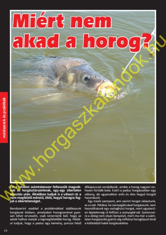 14m%u00f3dszerek %u00e9s praktik%u00e1kEzt a k%u00e9rd%u00e9st sz%u00e1mtalanszor feltessz%u00fck magunk- nak %u00e9s horg%u00e1szt%u00e1rsainknak, egy-egy sikertelen akaszt%u00e1s ut%u00e1n. %u00c1ltal%u00e1ban tudjuk is a v%u00e1laszt r%u00e1: a nem megfelel%u0151 m%u00e9ret%u0171, %u00f6bl%u0171, hegy%u0171 horogra fog- juk a sikertelens%u00e9get. Rendszerint ezekkel a probl%u00e9m%u00e1kkal tal%u00e1lkozunk horg%u00e1szat k%u00f6zben, amelyeket horogcser%u00e9vel gyorsan lehet orvosolni, csak ismern%u00fcnk kell, hogy az adott halhoz melyik a legmegfelel%u0151bb horog. P%u00e9ld%u00e1ul tudjuk, hogy a paduc egy kem%u00e9ny, porcos fels%u0151 %u00e1llkapoccsal rendelkezik, amibe a horog nagyon nehezen f%u00far%u00f3dik bele. Ez%u00e9rt a paduc horg%u00e1szatkor egy v%u00e9kony, de ugyanakkor er%u0151s %u00e9s %u00e9les hegy%u0171 horgot haszn%u00e1lunk. Egy m%u00e1sik szempont, ami szerint horgot v%u00e1lasztunk, az a csali. P%u00e9ld%u00e1ul, ha sz%u00fanyogl%u00e1rv%u00e1val horg%u00e1szunk, nem haszn%u00e1lhatunk egy vastagh%u00fas%u00fa horgot, mert egyszer%u0171en k%u00e9ptelens%u00e9g r%u00e1 felf%u0171zni a sz%u00fanyogl%u00e1rv%u00e1t. Szerencs%u00e9re a dolog nem olyan bonyolult, mert ma m%u00e1r a sz%u00e1mtalan horg%u00e1szcikk gy%u00e1rt%u00f3 c%u00e9g milli%u00f3nyi horogt%u00edpust k%u00edn%u00e1l a k%u00fcl%u00f6nb%u00f6z%u0151 halak horg%u00e1szat%u00e1hoz.Mi%u00e9rt nem akad a horog?www.horgaszkalandok.hu
