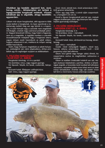 finomszerel%u00e9kes horg%u00e1szat23%u00c1ltal%u00e1ban %u00edgy kezdj%u00fck: egyszer%u0171 bot, %u00fasz%u00f3, horog, zsin%u00f3r... Mindannyian ezt tartjuk a legegyszer%u0171bb horg%u00e1szati m%u00f3dnak. Viszont sokaknak %u00edgy is v%u00e9gz%u0151dik, ahogy kezd%u0151dik: egyszer%u0171en. L%u00e1ttam m%u00e1r olyan horg%u00e1szokat, akik egyszerre t%u00f6bb %u00fasz%u00f3s bottal is horg%u00e1sztak. Az ilyen sporiknak a tudatlans%u00e1g mellett m%u00e9g van egy b%u0171n%u00fck is: a kapzsis%u00e1g. A csali hi%u00e1ny%u00e1t vagy a szerel%u00e9k nem megfelel%u0151 min%u0151s%u00e9g%u00e9t, a botok nagy sz%u00e1m%u00e1val pr%u00f3b%u00e1lj%u00e1k p%u00f3tolni. Nagyot t%u00e9vednek! Ahhoz, hogy halat is fogjanak, nem ez a megold%u00e1s. A legt%u00f6bb esetben a szerel%u00e9k %u00f6ssze%u00e1ll%u00edt%u00e1s%u00e1nak m%u00f3dj%u00e1t%u00f3l f%u00fcgg a horg%u00e1szat sikere, vagyis milyen %u00fasz%u00f3t haszn%u00e1lunk az adott v%u00edzben, hogyan s%u00falyozzuk ki azt, mekkora %u00e9s milyen vastag el%u0151k%u00e9t haszn%u00e1lunk.Az%u00e9rt, hogy helyesen meg%u00edt%u00e9lj%u00fck az adott helyzetet, sz%u00fcks%u00e9g%u00fcnk van n%u00e9mi alaptud%u00e1sra, ehhez pr%u00f3b%u00e1lok egy kis seg%u00edts%u00e9get ny%u00fajtani az al%u00e1bbiakban:1. FELSZ%u00cdNI HORG%u00c1SZAT%u2013 ELS%u0150 ESET (1. %u00c1BRA)Horg%u00e1sz%u00e1si t%u00e1vols%u00e1g: 1-5 m a partt%u00f3l.V%u00edz %u00e1raml%u00e1sa: nincs, vagy nagyon gyenge.V%u00edz t%u00edpusok: foly%u00f3k, kis tavak, csatorn%u00e1k, b%u00e1nyatavak.Keresett halak: f%u0151k%u00e9ppen sz%u00e9lhajt%u00f3 k%u00fcsz.Sz%u00e9l: nincs, vagy nagyon gyenge.%u00dasz%u00f3: r%u00f6vid, z%u00f6m%u00f6k test, r%u00f6vid antenn%u00e1val, 0,03 - 0,05 gramm teherb%u00edr%u00e1s.%u00d3lom: egy vagy t%u00f6bb, a zsin%u00f3r alj%u00e1n csoportos%u00edtva, a horogt%u00f3l 5-15 cm-re.Enn%u00e9l a t%u00edpus%u00fa horg%u00e1szatn%u00e1l sok hal van, melyek nagyon %u00e9rz%u00e9kenyek, ez%u00e9rt egy bizonyos fok%u00fa v%u00e9grehajt%u00e1si gyorsas%u00e1g sz%u00fcks%u00e9ges. 2. FELSZ%u00cdNI HORG%u00c1SZAT%u2013 M%u00c1SODIK ESET (2., 4. %u00c1BRA)Horg%u00e1sz%u00e1si t%u00e1vols%u00e1g: 3 mV%u00edz %u00e1raml%u00e1sa: nincs %u2013 m%u00e9rs%u00e9kelt.V%u00edz t%u00edpusok: foly%u00f3k, kis tavak, csatorn%u00e1k, b%u00e1nyatavak.Keresett halak: k%u00fcsz, v%u00f6r%u00f6ssz%u00e1rny%u00fa keszeg, d%u00e9v%u00e9rkeszeg.Sz%u00e9l: nincs %u2013 m%u00e9rs%u00e9kelt.%u00dasz%u00f3k: r%u00f6vid m%u00e9lys%u00e9gt%u0151l f%u00fcgg%u0151en, r%u00f6vid test, hossz%u00fa, v%u00e9kony antenn%u00e1val, aminek 0,10 %u2013 0,50 grammnyi s%u00falyt kell elb%u00edrnia.%u00d3lom: kicsi g%u00f6mb vagy henger alak%u00fa %u00f3lmok, kis csoportokra osztva %u00e9s megfelel%u0151en sz%u00e9tosztva a zsin%u00f3ron.Ebben az esetben %u00f3vatosabb halakr%u00f3l van sz%u00f3, melyek %u00f3vatosan k%u00f6zelednek a parthoz. Amikor a lehet%u0151s%u00e9gek engedik, a hossz%u00fak%u00e1s test%u0171 %u00fasz%u00f3kat kell el%u0151nyben r%u00e9szes%u00edteni, melyekkel jobban %u00e9szre lehet venni az oldal ir%u00e1ny%u00fa t%u00e1mad%u00e1sokat. %u00c1ramlat vagy sz%u00e9l eset%u00e9n vissza kell t%u00e9rni a r%u00f6vid test%u0171, hossz%u00fa antenn%u00e1j%u00fa %u00fasz%u00f3khoz.
