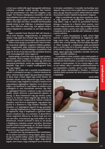 27 pontyhorg%u00e1szata chod rig az ut%u00f3bbi id%u0151k egyik legnagyobb tal%u00e1lm%u00e1nya. Val%u00f3j%u00e1ban a szerel%u00e9k eredeti verzi%u00f3ja, Rod Hutchinson-nak k%u00f6sz%u00f6nhet%u0151en m%u00e1r 1983-ban megl%u00e1tta a napvil%u00e1got. Tim Paisley is %u00e1tdolgozta a szerel%u00e9ket, %u0151 volt aki r%u00f6vid el%u0151k%u00e9kkel haszn%u00e1lta %u00e9s leadcore-val. Tim abban az id%u0151ben egy nagyon iszapos v%u00edzen horg%u00e1szott %u00e9s itt haszn%u00e1lta a chod riget els%u0151 %u00edzben, amelyr%u0151l els%u0151 k%u00f6nyv%u00e9ben b%u0151vebb le%u00edr%u00e1st is tesz 1988-ban. A k%u00f6vetkez%u0151 k%u00f6nyv%u00e9ben, mely 1990-ben jelent meg, m%u00e1r eg%u00e9szen m%u00e9lyrehat%u00f3an foglalkozik a szerel%u00e9kkel, %u00e9s m%u00e1r t%u00f6bb t%u00edpus%u00e1t is le%u00edrja.V%u00e9g%u00fcl a szerel%u00e9k Frank Warwick %u00e1ltal v%u00e1lt h%u00edress%u00e9, a %u201990-es %u00e9vek k%u00f6zep%u00e9n. Megeml%u00edten%u00e9m, %u00e9s %u00e9rdekesnek tal%u00e1lom, hogy egyik fent eml%u00edtett nagy horg%u00e1sz sem tal%u00e1lt szebb nevet a cs%u00faf chod helyett%u2026%u00edgy maradt a chod.Teh%u00e1t a chod rig egy %u00faj szerel%u00e9k lenne? Nem hinn%u00e9m. Ha olvasn%u00e1nak r%u00e9gebben megjelent k%u00fclf%u00f6ldi publik%u00e1ci%u00f3kat, magazinokat, akkor bizony%u00e1ra tal%u00e1ln%u00e1nak benne %u00f6n%u00f6k is %u00edr%u00e1sokat a k%u00fcl%u00f6nb%u00f6z%u0151k%u00e9ppen %u00f6ssze%u00e1ll%u00edtott chod rigek-r%u0151l. %u00c9n itt a Frank Warwick f%u00e9le szerel%u00e9kre t%u00e9rek ki, az %u00e9n szemsz%u00f6gemb%u0151l n%u00e9zve nagyon j%u00f3.Gyakorlatilag a Frank f%u00e9le chod rig egy igazi %u00f6nakaszt%u00f3s szerel%u00e9k, mivel a horgot a hal sz%u00e1j%u00e1ba az %u00f3lom %u00e9s a leadcore egy%u00fcttes s%u00falya h%u00fazza. A kap%u00e1s egy vehemens akaszt%u00e1ssal jelentkezik, amely %u00fagy megsz%u00f3laltatja a kap%u00e1sjelz%u0151t, hogy att%u00f3l a horg%u00e1sz majdhogynem fr%u00e1szt kap, %u00fagy megijed.N%u00e9zz%u00fck, mi minden kell a szerel%u00e9k %u00f6ssze%u00e1ll%u00edt%u00e1s%u00e1hoz: el%u0151sz%u00f6r is sz%u00fcks%u00e9g%u00fcnk van egy 1, 5 m%u00e9teres leadcore darabra, melynek egyik v%u00e9g%u00e9re egy gyorskapcsot k%u00f6t%u00fcnk, (1 %u00e1bra) majd a m%u00e1sik v%u00e9g%u00e9re egy hurkot k%u00f6t%u00fcnk. Ezt k%u00f6vet%u0151en tetsz%u00e9s szerint v%u00e1lasszunk egy %u00f3lmot, melyre azt mondjuk, hogy megfelel %u00e9s csatoljuk a leadcore-hoz a gyorskapocs seg%u00edts%u00e9g%u00e9vel. Figyelem, ha az %u00f3lmon van forg%u00f3 is, azt t%u00e1vol%u00edtsuk el, mert ebben az esetben nincs sz%u00fcks%u00e9g%u00fcnk r%u00e1, nem haszn%u00e1lhat%u00f3 semmire. Egy f%u0171z%u0151t%u0171 seg%u00edts%u00e9g%u00e9vel f%u0171zz%u00fcnk a leadcore-ra egy csom%u00f3v%u00e9d%u0151 sapk%u00e1t, melyet r%u00e1h%u00fazunk a gyorskapocsra eg%u00e9szen az %u00f3lomig. (2 %u00e1bra) Feltehet%u00fcnk m%u00e9g egy k%u00f3nikus csatlakoz%u00f3t is, ha akarunk. Most vegy%u00fcnk egy darab kis %u00e1tm%u00e9r%u0151j%u0171 shrink tube-t (zsugorcs%u0151) %u00e9s h%u00fazzuk a leadcore k%u00f6zep%u00e9re, majd forr%u00f3 v%u00edz seg%u00edts%u00e9g%u00e9vel, vagy g%u0151zzel dolgozzuk r%u00e1 a leadcore-ra, hogy helyben maradjon. Ezt k%u00f6vet%u0151en a t%u0171 seg%u00edts%u00e9g%u00e9vel tegy%u00fcnk fel egy gumi%u00fctk%u00f6z%u0151t, majd egy forg%u00f3kapcsot %u00e9s megint egy gumi%u00fctk%u00f6z%u0151t, de vigy%u00e1zzunk, hogy a forg%u00f3kapocs a gy%u0171r%u0171vel csatlakozzon a leadcore-hoz, ne a szem%u00e9vel. (3 %u00e1bra) Mind a h%u00e1rom szegmenst %u00e1ll%u00edtsuk be, (4 %u00e1bra) majd nem marad m%u00e1s h%u00e1tra, mint k%u00f6ss%u00fcnk egy r%u00f6vid el%u0151k%u00e9t 5-6 centim%u00e9tereset, monofil zsin%u00f3rb%u00f3l (5 %u00e1bra) %u00e9s ezt k%u00f6ss%u00fck a forg%u00f3kapocs szabadon maradt szem%u00e9hez. B%u00e1rmilyen monofil zsin%u00f3rt haszn%u00e1lhatnak, %u00e9n 18 libr%u00e1s fluorocarbont szoktam haszn%u00e1lni. Legv%u00e9g%u00fcl a leadcore-t k%u00f6ss%u00fck a f%u0151zsin%u00f3rhoz egy dupla Blood csom%u00f3val.A szerel%u00e9k nem fog %u00f6sszegubancol%u00f3dni bedob%u00e1skor, de ha v%u00e9deni szeretn%u00e9nk a horog hegy%u00e9t, akkor vonjuk be egy kis old%u00f3d%u00f3 habbal. L%u00e1ttam m%u00e1r t%u00f6bbf%u00e9le t%u00edpus%u00fa k%u00f6t%u00e9ssel felt%u00e9ve a horgot, f%u0151leg D riggel. Hogy %u0151szinte legyek, nem hiszem, hogy sz%u00fcks%u00e9g%u00fcnk lenne mindenf%u00e9le komplex szerel%u00e9kekre. A szerel%u00e9k mechanik%u00e1ja azon alapszik, hogy amint a hal a sz%u00e1j%u00e1t r%u00e1teszi a csalira m%u00e1ris akad, %u00edgy egy klasszikus csom%u00f3 n%u00e9lk%u00fcli k%u00f6t%u00e9ssel ell%u00e1tott hossz%u00fasz%u00e1r%u00fa enyh%u00e9n hajl%u00edtott horog b%u0151ven megteszi.M%u00e9gis a szerel%u00e9knek van egy olyan aspektusa, melyre nagy figyelmet kell ford%u00edtanunk. Bizonyosodjunk meg abban, hogy az utols%u00f3 kis gumi%u00fctk%u00f6z%u0151 k%u00f6nnyen %u00e1tmegy a leadcore %u00e9s a f%u0151zsin%u00f3r k%u00f6zti csom%u00f3n, mert ha nem megy %u00e1t k%u00f6nnyen, akkor egy esetleges f%u0151zsin%u00f3r szakad%u00e1sa eset%u00e9n a ponty nem tudja az el%u0151k%u00e9t leh%u00fazni a leadcore-r%u00f3l %u00e9s %u00edgy a szerel%u00e9k ak%u00e1r hal%u00e1loss%u00e1 is v%u00e1lhat a ponty sz%u00e1m%u00e1ra.Amint a ponty beszippantja a csalit, %u00e9rezni fogja azonnal a leadcore ellen%u00e1ll%u00e1s%u00e1t %u00e9s f%u00fcggetlen%u00fcl att%u00f3l, hogy merre indul, jobbra vagy balra, part fel%u00e9 vagy ny%u00edltv%u00edz fel%u00e9, a horog mindig a hal als%u00f3 ajk%u00e1ba fog akadni. Mikor bev%u00e1gunk, a forg%u00f3kapocs alatti gumi%u00fctk%u00f6z%u0151 lej%u00f6n a shrink tube-r%u00f3l %u00e9s lecs%u00faszik eg%u00e9szen az %u00f3lomig. Ez t%u00f6rt%u00e9nik a forg%u00f3kapoccsal is, amelyhez k%u00f6tve van az el%u0151ke, vagyis ugyan%u00fagy viselkedik a szerel%u00e9k, mint a helikopter szerel%u00e9k eset%u00e9ben is.A szerel%u00e9ket ki lehet pr%u00f3b%u