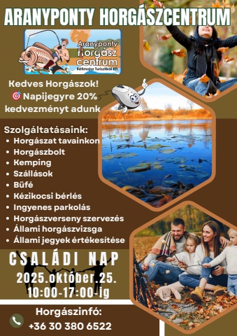 Kedves Horg%u00e1szok!%u00a0 Napijegyre 20%kedvezm%u00e9nyt adunk Horg%u00e1szat tavainkonHorg%u00e1szboltKempingSz%u00e1ll%u00e1sokB%u00fcf%u00e9K%u00e9zikocsi b%u00e9rl%u00e9sIngyenes parkol%u00e1sHorg%u00e1szverseny szervez%u00e9s%u00c1llami horg%u00e1szvizsga%u00c1llami jegyek %u00e9rt%u00e9kes%u00edt%u00e9seC S A L %u00c1 D I N A P 2025.okt%u00f3ber.25. 10:00-17:00-igARANYPONTY HORG%u00c1SZCENTRUMSzolg%u00e1ltat%u00e1saink: +36 30 380 6522Horg%u00e1szinf%u00f3: