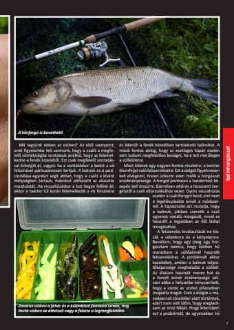 balinhorg%u00e1szat7Mit tegy%u00fcnk ebben az estben? Az els%u0151 szempont, amit figyelembe kell venn%u00fcnk, hogy a csalit a megfelel%u0151 v%u00edzm%u00e9lys%u00e9gbe vontassuk an%u00e9lk%u00fcl, hogy az felemelkedne a fen%u00e9k k%u00f6zel%u00e9b%u0151l. Ezt csak megfelel%u0151 vontat%u00e1ssal %u00e9rhetj%u00fck el, vagyis: ha a vontat%u00e1skor a botot a v%u00edz felsz%u00edn%u00e9vel p%u00e1rhuzamosan tartjuk. A botnak ez a pozicion%u00e1l%u00e1sa egyr%u00e9szt seg%u00edt abban, hogy a csalit a k%u00edv%u00e1nt m%u00e9lys%u00e9gben tartsuk, m%u00e1sr%u00e9szt el%u0151k%u00e9sz%u00edti az akaszt%u00e1s mozdulat%u00e1t. Ha visszah%u00faz%u00e1skor a bot hegye felfel%u00e9 %u00e1ll, akkor a twister t%u00fal kor%u00e1n felemelkedik a v%u00edz felsz%u00edn%u00e9re %u00e9s kiker%u00fcli a fen%u00e9k k%u00f6zel%u00e9ben tart%u00f3zkod%u00f3 balinokat. A m%u00e1sik fontos dolog, hogy az esetleges kap%u00e1s eset%u00e9n sem tudunk megfelel%u0151en bev%u00e1gni, ha a bot mer%u0151leges a v%u00edzfel%u00fcletre.Most kit%u00e9rek egy nagyon fontos r%u00e9szletre: a twister %u00f3lomfejjel val%u00f3 felszerel%u00e9s%u00e9re. Ezt a dolgot figyelmesen kell elv%u00e9gezni, hiszen sokszor ezen m%u00falik a horg%u00e1szat eredm%u00e9nyess%u00e9ge. A horgot pontosan a twistertest k%u00f6zep%u00e9n kell %u00e1tsz%u00farni. B%u00e1rmilyen elt%u00e9r%u00e9s a hosszanti tengelyt%u0151l a csali eltorzul%u00e1s%u00e1hoz vezet. Gyors visszah%u00faz%u00e1s eset%u00e9n a csali forogni kezd, ami nem a legel%u0151ny%u00f6sebb enn%u00e9l a m%u00f3dszern%u00e9l. A tapasztalat azt mutatja, hogy a balinok, jobban szeretik a csali egyenes vonal%u00fa mozg%u00e1s%u00e1t, mivel ez hasonl%u00edt a legjobban az %u00e9l%u0151 kishal mozg%u00e1s%u00e1hoz. A felszerel%u00e9s kiv%u00e1laszt%u00e1s%u00e1t ne b%u00edzz%u00e1k a v%u00e9letlenre %u00e9s a k%u00e9nyelemre. Bevallom, hogy egy ideig %u00fagy horg%u00e1sztam balinra, hogy k%u00f6zben h%u0171 maradtam a s%u00fcll%u0151z%u00e9sn%u00e9l haszn%u00e1lt felszerel%u00e9shez. A probl%u00e9m%u00e1k akkor kezd%u0151dtek, amikor a balinok teljes%u00edt%u0151k%u00e9pess%u00e9ge meghaladta a s%u00fcll%u0151%u00e9t. Az %u00e1ltalam haszn%u00e1lt merev bot %u00e9s a fonott zsin%u00f3r %u00e9rz%u00e9kenys%u00e9ge sokszor abba a helyzetbe k%u00e9nyszer%u00edtett, hogy a zsin%u00f3r az utols%u00f3 pillanatban megadta mag%u00e1t. Ezek a dolgok a m%u00e1sodpercek t%u00f6red%u00e9kei alatt t%u00f6rt%u00e9ntek, ez%u00e9rt nem volt id%u0151m, hogy meglaz%u00edtsam az ors%u00f3 f%u00e9kj%u00e9t. Hogy kiker%u00fcljem ezt a probl%u00e9m%u00e1t, de ugyanakkor h%u0171 A k%u00f6rforg%u00f3 is bevethet%u0151Zavaros v%u00edzben a feh%u00e9r %u00e9s a k%u00fcl%u00f6nb%u00f6z%u0151 fant%u00e1zia sz%u00ednek, m%u00edg tiszta v%u00edzben az %u00e1ttetsz%u0151 vagy a fekete a legmegfelel%u0151bb
