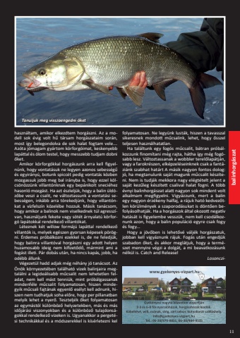 11 balinhorg%u00e1szat haszn%u00e1ltam, amikor elkezdtem horg%u00e1szni. Az a modell sok %u00e9vig volt h%u0171 t%u00e1rsam horg%u00e1szataim sor%u00e1n, most %u00edgy belegondolva de sok halat fogtam vele%u2026. Az%u00f3ta j%u00f3magam gy%u00e1rtom k%u00f6rforg%u00f3imat, keskenyebb lap%u00e1ttal %u00e9s %u00f3lom testel, hogy messzebb tudjam dobni %u0151ket.Amikor k%u00f6rforg%u00f3kkal horg%u00e1szunk arra kell figyeln%u00fcnk, hogy vontat%u00e1suk ne legyen azonos sebess%u00e9g%u0171 %u00e9s egyir%u00e1ny%u00fa, botunk spicc%u00e9t pedig vontat%u00e1s k%u00f6zben mozgassuk jobb meg bal ir%u00e1nyba is, hogy ezzel k%u00f6lcs%u00f6n%u00f6zz%u00fcnk villant%u00f3nknak egy bep%u00e1nikolt sneci%u00e9hez hasonl%u00f3 mozg%u00e1st. Ha azt %u00e9szlelj%u00fck, hogy a balin %u00fcld%u00f6z%u0151be veszi a csalit, ne v%u00e1ltoztassunk a vontat%u00e1si sebess%u00e9gen, ink%u00e1bb arra t%u00f6rekedj%u00fcnk, hogy villant%u00f3nkat a v%u00edzfelsz%u00edn k%u00f6zel%u00e9be hozzuk. M%u00e1sik tan%u00e1csom, hogy amikor a balinok nem viselkednek t%u00fal agressz%u00edvan, haszn%u00e1ljunk fekete vagy s%u00f6t%u00e9t %u00e1rnyalat%u00fa k%u00f6rforg%u00f3 lap%u00e1tokkal rendelkez%u0151 villant%u00f3kat.L%u00e9teznek k%u00e9t willow form%u00e1j%u00fa lap%u00e1ttal rendelkez%u0151 villant%u00f3k is, melyek eg%u00e9szen gyorsan k%u00e9pesek p%u00f6r%u00f6gni. %u00c9rdemes pr%u00f3b%u00e1lkozni ezekkel is, de ne feledj%u00fck, hogy balinra villant%u00f3val horg%u00e1szni egy adott helyen huzamosabb ideig nem kifizet%u0151d%u0151, m%u00e1rmint ami a fog%u00e1st illeti. P%u00e1r dob%u00e1s ut%u00e1n, ha nincs kap%u00e1s, jobb, ha od%u00e9bb %u00e1llunk.V%u00e9gezet%u00fcl hadd adjak m%u00e9g n%u00e9h%u00e1ny j%u00f3 tan%u00e1csot. Az %u00d6n%u00f6k k%u00f6rnyezet%u00e9ben tal%u00e1lhat%u00f3 vizek balinjaira megtal%u00e1lni a legide%u00e1lisabb m%u0171csalit nem lehetetlen feladat, nem kell m%u00e1st tenni%u00fck, mint pr%u00f3b%u00e1lgassanak mindenf%u00e9le m%u0171csalit folyamatosan, hiszen mindegyik m%u0171csali fajt%u00e1nak egyenl%u0151 es%u00e9lyt kell adnunk, hiszen nem tudhatjuk soha el%u0151re, hogy per pillanatban melyik lehet a nyer%u0151. Tesztelj%u00e9k %u0151ket folyamatosan az egym%u00e1st%u00f3l k%u00fcl%u00f6nb%u00f6z%u0151 helyzetekben, m%u00e1s %u00e9s m%u00e1s id%u0151j%u00e1r%u00e1si viszonyokban %u00e9s a k%u00fcl%u00f6nb%u00f6z%u0151 tulajdons%u00e1gokkal rendelkez%u0151 vizeken is. Ugyanakkor a perget%u00e9si technik%u00e1kkal %u00e9s a m%u00f3dszerekkel is k%u00eds%u00e9rletezni kel folyamatosan. Ne legy%u00fcnk lust%u00e1k, hiszen a tavasszal sikeresnek mondott m%u0171csalink, lehet, hogy %u0151sszel teljesen haszn%u00e1lhatatlan. Ha tal%u00e1ltunk egy fog%u00f3s m%u0171csalit, b%u00e1tran pr%u00f3b%u00e1lkozzunk finom%u00edtani m%u00e9g rajta, h%u00e1tha %u00edgy m%u00e9g fog%u00f3sabb lesz. V%u00e1ltoztassanak a wobbler terel%u0151lap%u00e1tj%u00e1n, vagy a farokr%u00e9szen, elk%u00e9pzel%u00e9seinknek csak a fant%u00e1zi%u00e1nk szabhat hat%u00e1rt A m%u00e1sik nagyon fontos dolog: j%u00f3, ha megtanulunk saj%u00e1t magunk m%u0171csalit k%u00e9sz%u00edteni. Nem is tudj%u00e1k mekkora nagy el%u00e9gt%u00e9telt jelent a saj%u00e1t kez%u0171leg k%u00e9sz%u00edtett csalival halat fogni. A t%u00f6bb %u00e9vnyi balinhorg%u00e1szat alatt nagyon sok mindent volt alkalmam megfigyelni. Vigy%u00e1zzunk, mert a balin egy nagyon %u00e9rz%u00e9keny halfaj, a r%u00e1juk hat%u00f3 kedvez%u0151tlen k%u00f6r%u00fclm%u00e9nyek a szaporod%u00e1sukat is d%u00f6nt%u0151en befoly%u00e1solhatj%u00e1k. Ha a horg%u00e1szok %u00e1ltal okozott negat%u00edv hat%u00e1s%u00e1t is figyelembe vessz%u00fck, nem kell csod%u00e1lkoznunk azon, hogy a balin popul%u00e1ci%u00f3 egyre csak fogy %u00e9s fogy%u2026Hogy a j%u00f6v%u0151ben is lehet%u0151v%u00e9 v%u00e1lj%u00e9k horg%u00e1szatuk, jobban kell vigy%u00e1znunk r%u00e1juk. Fog%u00e1s ut%u00e1n engedj%u00fck szabadon %u0151ket, %u00e9s akkor megl%u00e1tjuk, hogy a term%u00e9szet mennyire v%u00e9gzi a dolg%u00e1t, a mi beavatkoz%u00e1sunk n%u00e9lk%u00fcl is. Catch and Release!LosoncziTanuljuk meg visszaengedni %u0151ket