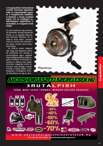 horg%u00e1szkell%u00e9kek13A horg%u00e1szcikkek t%u00f6rt%u00e9net%u00e9nek minden bizonnyal leg%u00e9rdekesebb %u00e9s legsokr%u00e9t%u0171bb fejezete a horg%u00e1szors%u00f3k fejl%u0151d%u00e9se. A t%u00f6rt%u00e9net a t%u00e1rol%u00f3 ors%u00f3kkal indult. Ezt az ors%u00f3t%u00edpust tulajdonk%u00e9ppen napjainkban is haszn%u00e1ljuk, ez a legyez%u0151 ors%u00f3k alapja. Az els%u0151 multiors%u00f3t egy %u00f3r%u00e1smester k%u00e9sz%u00edtette. George Snydernek h%u00edvt%u00e1k, %u00e9s az Egyes%u00fclt %u00c1llamokbeli Kentucky %u00e1llamban %u00e9lt az 1800-as %u00e9vek elej%u00e9n. Azonban ezzel az ors%u00f3val sem lehetett a kor akkori szintj%u00e9n t%u00e1voli dob%u00e1sokat el%u00e9rni. Az 1900-as %u00e9vekre vil%u00e1goss%u00e1 v%u00e1lt, hogy m%u00e1s alapelven m%u0171k%u00f6d%u0151 szerkezetre van sz%u00fcks%u00e9g. A sporthorg%u00e1szat egyre nagyobb n%u00e9pszer%u0171s%u00e9ge azonban megmozgatta a fant%u00e1zi%u00e1t. Az els%u0151 ilyen k%u00eds%u00e9rletek az 1800-as %u00e9vek v%u00e9g%u00e9n t%u00f6rt%u00e9ntek, m%u00e9gpedig szint%u00e9n az USA-ban. Ezek l%u00e9nyege a t%u00e1rol%u00f3 ors%u00f3nak a dob%u00e1s idej%u00e9n a bot tengely%u00e9re mer%u0151legesen t%u00f6rt%u00e9n%u0151 elford%u00edt%u00e1sa, ezt egy az ors%u00f3Illingworth ors%u00f3