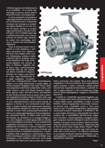 horg%u00e1szkell%u00e9kek15a Mitchell egym%u00e1s ut%u00e1n dobt%u00e1k piacra az %u00faj modelleket. Az %u00faj eszk%u00f6z n%u00e9pszer%u0171s%u00e9ge a hatvanas %u00e9vekre elker%u00fclhetetlenn%u00e9 tette a sorozatgy%u00e1rt%u00e1st.Az olcs%u00f3 munkaer%u0151 rem%u00e9ny%u00e9ben a nagy c%u00e9gek kivitt%u00e9k a termel%u00e9st %u00c1zsi%u00e1ba. Az eredm%u00e9ny ismert. A koppint%u00e1s m%u0171v%u00e9szei m%u00e1r m%u00e1snapra az eredetin%u00e9l jobbat alkottak, %u00e9s ma m%u00e1r minden ott k%u00e9sz%u00fcl, ker%u00fclj%u00f6n az eur%u00f3pai vagy amerikai piacra. Ezt az%u00e9rt emelem %u00edgy ki, mert a fejl%u0151d%u00e9s egyik %u00e1ga a z%u00e1rth%u00e1z%u00fa peremfut%u00f3 ors%u00f3, mely az USA-ban %u00e9s %u00e9szakon igen elterjedt, de n%u00e1lunk nincs jelent%u0151s%u00e9ge, ez%u00e9rt nem is k%u00edv%u00e1nok vele k%u00fcl%u00f6n%u00f6sebben foglalkozni.Teh%u00e1t az %u00f6tvenes %u00e9vekre m%u00e1r kialakult az ors%u00f3k alapt%u00edpusa, a z%u00e1rtdob%u00fa peremfut%u00f3 ors%u00f3. Eg%u00e9szen a hetvenes %u00e9vek v%u00e9g%u00e9ig uralta a piacot. Mindenk%u00e9pp eml%u00edt%u00e9sre m%u00e9lt%u00f3 a Mitchell 300-as modellje, mely a kor%u00e1t megel%u0151zve m%u00e1r forg%u00f3 zsin%u00f3rvezet%u0151 g%u00f6rg%u0151vel volt szerelve, %u00e9s f%u00e9kje is t%u00f6k%u00e9letes megold%u00e1s volt. Itt jelent meg a gombnyom%u00e1ssal cser%u00e9lhet%u0151 dob, %u00edgy m%u00e1r p%u00f3tdobbal ell%u00e1tva mehett%u00fcnk horg%u00e1szni. D%u00f6nt%u0151en k%u00e9t hajt%u00e1si m%u00f3d alakult ki, a k%u00fap- vagy t%u00e1ny%u00e9rkerekes %u00e9s a csig%u00e1s meghajt%u00e1s. Forradalmi %u00faj%u00edt%u00e1s volt a k%u00fapfogaskerekes hajt%u00e1s har%u00e1ntfogaz%u00e1sa, melyet a mai napig alkalmaznak a vezet%u0151 c%u00e9gek. Az %u00e9vtized k%u00f6zep%u00e9re megjelent k%u00e9t m%u00e1sik fontos %u00faj%u00edt%u00e1s, mely alapvet%u0151en %u00e1tform%u00e1lta eszk%u00f6z%u00fcnket: a dob %u201eszokny%u00e1ja%u201d kiker%u00fcl a rotor k%u00f6r%u00e9 (Ryobi Powerful, Shakespeare Sigma), majd a f%u00e9k h%u00e1tra ker%u00fclt, els%u0151 l%u00e9p%u00e9sben az ABU Cardinal ors%u00f3n%u00e1l h%u00e1tra %u00e9s alulra. Ezek a szerkezeti megold%u00e1sok lehet%u0151v%u00e9 tett%u00e9k a hajt%u00f3kar jobb vagy bal oldali %u00e1tszerelhet%u0151s%u00e9g%u00e9t. Teh%u00e1t a nyolcvanas %u00e9vekre m%u00e1r a v%u00e1laszt%u00e9k b%u0151v%u00fclt, a forma viszont maradt. Az eg%u00e9szen %u00faj form%u00e1t az ors%u00f3 szerkezet%u00e9n bel%u00fcli v%u00e1ltoztat%u00e1s, a ny%u00fajtott t%u00e1vdob%u00f3 dob alkalmaz%u00e1sa jelentette. %u00dajabb probl%u00e9ma vet%u0151d%u00f6tt fel, mely m%u00e1r a kezdetekt%u0151l k%u00eds%u00e9rtett: a zsin%u00f3r min%u00e9l szab%u00e1lyosabb felcs%u00e9v%u00e9l%u00e9se. Ez mind a mai napig csigatengelyes %u00e9s kulissza fogaskerekes v%u00e1ltozatban l%u00e9tezik. Az el%u0151bbi szebb zsin%u00f3rcs%u00e9v%u00e9l%u00e9st biztos%u00edt, de s%u00e9r%u00fcl%u00e9keny %u00e9s j%u00f3 anyagmin%u0151s%u00e9get k%u00edv%u00e1n, ez%u00e9rt dr%u00e1g%u00e1bb, az ut%u00f3bbi egyszer%u0171bb %u00e9s olcs%u00f3bb, a mai sz%u00e1m%u00edt%u00f3g%u00e9pes tervez%u00e9ssel m%u00e1r j%u00f3l modellezhet%u0151, megfelel%u0151en perselyezve tart%u00f3s. A bels%u0151 szerkezetek fejl%u0151d%u00e9s%u00e9vel %u00faj kih%u00edv%u00e1snak is siker%u00fclt megfelelni, mely lehet%u0151v%u00e9 tette a gyan%u00fatlan hal sz%u00e1m%u00e1ra felk%u00edn%u00e1lt csali szabadonfut%u00e1s%u00e1t, a nyelet%u0151f%u00e9k kialak%u00edt%u00e1s%u00e1t is. A kezdeti id%u0151kben t%u00f6bb megold%u00e1ssal is k%u00eds%u00e9rleteztek. A Silstar GXB mindenk%u00e9ppen eml%u00edt%u00e9sre m%u00e9lt%u00f3 m%u00e9rf%u00f6ldk%u0151, tulajdonk%u00e9ppen a mai els%u0151f%u00e9kes baitrunner ors%u00f3k alapja (SHIMANO USA Baitrunner, Okuma, Spro stb.), a Ryobi (Zebco, Browning, stb.) kezdeti, %u201980-as %u00e9vek v%u00e9g%u00e9nek megold%u00e1sai a Cormoran (Kettner stb.) megold%u00e1sokkal egy%u00fctt kim%u00faltak. A DAM, a Mitchell a dobba %u00e9p%u00edtett benyomhat%u00f3 megold%u00e1ssal biztos%u00edtotta a szabadon fut%u00e1st. A v%u00e9g%u00e9re hagytam, a %u201980-as %u00e9vekt%u0151l egy %u00faj fogalommal lett%u00fcnk gazdagabbak: megjelent a SHIMANO baitrunner.A DAIWA %u00e9s a SHIMANO egym%u00e1st%u00f3l f%u00fcggetlen utakon, n%u00e9mik%u00e9pp elt%u00e9r%u0151 bels%u0151 szerkezettel piacra dobt%u00e1k a h%u00e1ts%u00f3 f%u00e9kkel szerelt nyelet%u0151f%u00e9kes ors%u00f3kat. Az els%u0151 DAIW%u00c1-k kulissza fogaskerekes zsin%u00f3rszed%u0151 rendszerrel jelentek meg, a SHIMANO viszont a %u201970-es %u00e9vek kudarcai ut%u00e1n a dr%u00e1g%u00e1bb kateg%u00f3ri%u00e1ban csigatengelyes zsin%u00f3rszed%u0151 rendszert alkalmazott. A SHIMANO a %u201990-es %u00e9vek elej%u00e9re elismerten a vil%u00e1g legjobb ilyen t%u00edpus%u00fa ors%u00f3j%u00e1v%u00e1 v%u00e1lt. A nyelet%u0151f%u00e9kkel p%u00e1rhuzamosan megjelent a harcif%u00e9k is, melyet legink%u00e1bb a tapogat%u00f3-m%u00e1rtogat%u00f3 horg%u00e1szat nyelet%u0151 taktik%u00e1j%u00e1n%u00e1l tudunk %u00e9rt%u00e9kelni, tov%u00e1bb%u00e1 a f%u00e1raszt%u00e1s sor%u00e1n v%u00e1ratlanul kit%u00f6r%u0151 hal k%u00f6vethet%u0151 vele p%u00e1ratlanul eredm%u00e9nyesen. %u00c9rdekess%u00e9g m%u00e9g az ABU Suveran ors%u00f3ja a maga %u201ek%u00f6z%u00e9p%u201d f%u00e9kj%u00e9vel. N%u00e9mi cinizmussal mondva, ha annyira nagy sz%u00e1m lenne, k%u00f6vette volna a konkurencia is%u2026 %u00e9s m%u00e9g nem eml%u00edtettem az ors%u00f3 egy%u00e9b szerkezeti r%u00e9szeinek kialak%u00edt%u00e1sait, a vis -szaforg%u00e1sg%u00e1tl%u00f3k, zsin%u00f3rvezet%u0151 g%u00f6rg%u0151k, a f%u00e9klamell%u00e1k, a felkap%u00f3karok v%u00e1ltozatait.  Nagy -Modern ors%u00f3