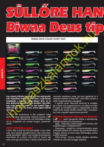 16damil.huVan valami k%u00fcl%u00f6n%u00f6s hangulata az %u0151sz eleji pec%u00e1k- nak. Hajnalban m%u00e9g p%u00e1ra %u00fcl a v%u00edzen, a nap lassan emelkedik, a k%u00f6vez%u00e9s hideg k%u00f6vein %u00e1llsz, %u00e9s az els%u0151 dob%u00e1sn%u00e1l koppan a jig a fen%u00e9ken. Egy pilla- nat, majd apr%u00f3 koccan%u00e1s %u2013 %u00e9s m%u00e1r tudod, hogy a s%u00fcll%u0151 ott van. Ez az az %u00e9rz%u00e9s, amire eg%u00e9sz ny%u00e1ron v%u00e1rtunk.De mit%u0151l lesz eredm%u00e9nyes az %u0151szi perget%u00e9s? Sokak szerint az egyik legbiztosabb v%u00e1laszt%u00e1s ilyenkor a Biwaa Deus, egy plasztikcsali, ami k%u00fcl%u00f6nleges anyag%u00e1val %u00e9s mozg%u00e1s%u00e1val sok eur%u00f3pai horg%u00e1sz %u201ejoker%u00e9nek%u201d sz%u00e1m%u00edt.MI%u00c9RT M%u0170K%u00d6DIK A DEUS?A Deus titka a Dual Density technol%u00f3gia: a hasa nehezebb, s%u00f3val d%u00fas%u00edtott anyagb%u00f3l k%u00e9sz%u00fcl, m%u00edg a h%u00e1ta k%u00f6n -nyebb plasztikb%u00f3l. Ett%u0151l a csali mindig term%u00e9szetesen, v%u00edzszintesen %u00e1ll a v%u00edzben, nem billen el, hanem %u00fagy %u00faszik, mint egy s%u00e9r%u00fclt kishal. A l%u00e1ndzsa alak%u00fa farok m%u00e1r minim%u00e1lis mozd%u00edt%u00e1sra rezeg, %u00edgy lass%u00fa jigel%u00e9sn%u00e9l %u00e9s a s%u00fcllyed%u00e9si f%u00e1zisban is %u00e9letre kel %u2013 pont akkor, amikor a s%u00fcll%u0151k a legsz%u00edvesebben odav%u00e1gnak.A gy%u00e1rt%u00e1s sor%u00e1n r%u00e1karom%u00e1t kevernek az anyagba, %u00edgy a v%u00edzben er%u0151s szagnyomot h%u00faz, ami elfedi az emberi szagot %u00e9s t%u00e1mad%u00e1sra ingerli a ragadoz%u00f3kat. A puha, m%u00e9gis tart%u00f3s anyag r%u00e1ad%u00e1sul jobban b%u00edrja a harap%u00e1sokat, mint a legt%u00f6bb hagyom%u00e1nyos gumihal.HOGYAN %u00c9RDEMES SZERELNI %u00c9S VEZETNI?A Deus egyik legnagyobb el%u0151nye a sokoldal%u00fas%u00e1g. T%u00f6bbf%u00e9le m%u00f3dszerrel is bevetheted:Jigfej %u2013 a klasszikus, fen%u00e9k-kopogtat%u00f3s technika, ahol a legt%u00f6bb kap%u00e1s a s%u00fcllyed%u00e9sn%u00e9l j%u00f6n.Cseburaska %u2013 mozg%u00f3 fej + horog kombin%u00e1ci%u00f3, amely szabadabb j%u00e1t%u00e9kot ad a csalinak, %u00edgy term%u00e9szetesebb a mozg%u00e1sa. Sokszor ez hozza meg a k%u00fcl%u00f6nbs%u00e9get, amikor a s%u00fcll%u0151k %u00f3vatosak.Offset horog %u2013 h%u00ednaras, akad%u00f3s p%u00e1ly%u00e1kon weedless m%u00f3dszerrel, ahol m%u00e1s horoggal elakadna.S%u00dcLL%u00d4RE HANGBiwaa Deus tiphorgaszkalandok.hu
