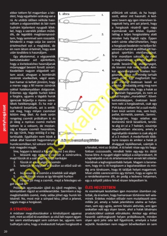20pontyhorg%u00e1szatekkor tettem fel magamban a k%u00e9rd%u00e9st, hogy egy%u00e1ltal%u00e1n sz%u00fcks%u00e9g van e r%u00e1. Az ut%u00f3bbi id%u0151ben n%u00e9lk%u00fcle haszn%u00e1ltam a v%u00e9gszerel%u00e9ket %u00e9s b%u00e1r nem tudn%u00e1m kijelenteni nyugodt l%u00e9lekkel, hogy a szerel%u00e9k jobban m%u0171k%u00f6dik, de legal%u00e1bb megbizonyosodtam, hogy semmivel sem rosszabb. Mindenki a maga sz%u00e1ja %u00edze szerint %u00e9rtelmezheti ezt a megl%u00e1t%u00e1st, de %u00e9n nem l%u00e1tom %u00e9rtelm%u00e9t, hogy ezek ut%u00e1n tov%u00e1bbra is haszn%u00e1ljam.Egy alkalommal, a v%u00e9gszerel%u00e9k bemutat%u00e1sakor azt aj%u00e1nlottam, hogy a kivitelez%u00e9shez haszn%u00e1ljanak m%u0171anyaggal bevont fonott zsin%u00f3rt. Kezdetben nagyon el%u00e9gedett voltam azzal, ahogyan a kombin%u00e1lt zsin%u00f3rok viselkedtek, v%u00e9g%u00fcl azonban hamar r%u00e1 kellett j%u00f6nn%u00f6m, hogy a merev vagy a f%u00e9l merev zsin%u00f3rok sokkal hat%u00e9konyabban dolgoznak. %u00c9rdemes egy t%u00e1gabb hurkot k%u00f6tni a forg%u00f3ra, ugyanis a t%u00e1gabb hurok igencsak feljav%u00edtja a merev szerel%u00e9kek hat%u00e9konys%u00e1g%u00e1t. %u00c9s ha m%u00e1r a hurkokr%u00f3l besz%u00e9l%u00fcnk, azt is eml%u00edts%u00fck meg, hogy milyen csom%u00f3val k%u00f6t%u00f6m meg %u0151ket. Az %u00e9vek sor%u00e1n rengeteg csom%u00f3t pr%u00f3b%u00e1ltam ki %u00e9s j%u00f3 ideig a nyolcas csom%u00f3 mellett tettem le a voksom, de mostans%u00e1g a Rapala csom%u00f3t haszn%u00e1lom, %u00e9s %u00fagy t%u0171nik, hogy ezid%u00e1ig %u0151 a legtart%u00f3sabb. Egy%u00e1ltal%u00e1n nem b%u00edzok a sokak %u00e1ltal haszn%u00e1lt hagyom%u00e1nyos hurokcsom%u00f3ban, t%u00fal sokszor l%u00e1ttam m%u00e1r megadni mag%u00e1t.%u00cdme, hogyan is k%u00e9sz%u00fcl a Rapala csom%u00f3 1-es %u00e1bra:1. k%u00f6ss%u00fcnk egy egyszer%u0171 csom%u00f3t a zsin%u00f3runkra,majd f%u0171zz%u00fck %u00e1t a sz%u00e1l v%u00e9get a forg%u00f3 karik%u00e1j%u00e1n2. f%u0171zz%u00fck %u00e1t a sz%u00e1l v%u00e9g%u00e9t a csom%u00f3n3. tekerj%u00fck %u00e1t n%u00e9gyszer a f%u0151sz%u00e1lon az el%u0151z%u0151 sz%u00e1l v%u00e9g%u00e9t4. b%u00fajtassuk %u00e1t a csom%u00f3n a kisebbik sz%u00e1l v%u00e9g%u00e9t5. majd f%u0171zz%u00fck vissza az %u00edgy l%u00e9trej%u00f6tt hurkon6. h%u00fazzuk j%u00f3l meg a csom%u00f3t, majd a felesleges v%u00e9get v%u00e1gjuk lePr%u00f3b%u00e1lj%u00e1k egym%u00e1sut%u00e1n %u00fajb%u00f3l %u00e9s %u00fajb%u00f3l megk%u00f6tni, %u00edgy k%u00f6nnyebben r%u00f6gz%u00fcl az eml%u00e9kezet%u00fckbe. Szerintem a legmegb%u00edzhat%u00f3bb csom%u00f3, mely sz%u00f3ba j%u00f6het egy hurok k%u00f6t%u00e9s%u00e9n%u00e9l. No, most m%u00e1r a sz%u00ednpad k%u00e9sz, j%u00f6het a jelenet, vagyis maga a horg%u00e1szat. A STRAT%u00c9GIAA m%u00f3dszer megv%u00e1laszt%u00e1sakor a kiindul%u00f3pont ugyanaz volt, mint az el%u0151z%u0151 t%u00f3 eset%u00e9ben: az els%u0151 k%u00e9t napon egyetlen szem etet%u0151anyagot sem sz%u00f3rtam be, ugyanis nem tudhatjuk soha, hogy a kiv%u00e1lasztott helyen horg%u00e1szott-e el%u0151tt%u00fcnk ott valaki, %u00e9s ha horg%u00e1szott, akkor mit haszn%u00e1lt. A kedvenc tavam egy igen intenz%u00edven l%u00e1togatott hely, ami azt jelenti, hogy a horg%u00e1szok r%u00e9sz%u00e9r%u0151l igen nagy nyom%u00e1snak van kit%u00e9ve. Gyakorlatilag a teljes horg%u00e1szid%u00e9ny alatt minden hely foglalt rajta. %u00c9ppen ez%u00e9rt szinte elker%u00fclhetetlen, hogy a horg%u00e1szat kezdet%u00e9n ne kelljen felvenned a harcot az el%u0151tted ott horg%u00e1sz%u00f3 sportt%u00e1rs etet%u0151anyag%u00e1val. M%u00e1r mondtam sokszor, de most is megism%u00e9tlem: a lehet%u0151 legk%u00f6n -nyebb besz%u00f3rni az etet%u0151anyagot, de kivenni m%u00e1r nem tudjuk. Amikor agyonhorg%u00e1szott vizeken horg%u00e1sznak, akkor ezt mindig tarts%u00e1k szem el%u0151tt. Egy megfontolt horg%u00e1sz mindig %u00f3vatosan kezeli az etet%u00e9st, mindaddig am%u00edg meg nem bizonyosodik r%u00f3la, hogy a halak az %u0151 etet%u00e9s%u00e9t fogyasztj%u00e1k, %u00e9s nem az el%u0151z%u0151 horg%u00e1sz %u201emarad%u00e9k%u00e1t%u201d. K%u00f6vetkeztet%u00e9sk%u00e9ppen, %u00f3vatosan kezdtem neki a horg%u00e1szatnak, csak egy PVA batyut tettem fel a csali mell%u00e9. Ezen k%u00edv%u00fcl semmi m%u00e1s, sem bojli, pellet, t%u00f6rmel%u00e9k, szemek...Semmi.Megs%u00fagn%u00e1m, hogy relat%u00edve egy kism%u00e9ret%u0171 t%u00f3r%u00f3l besz%u00e9l%u00fcnk, ter%u00fclete alig %u00e9ri el a 7 hekt%u00e1rt, v%u00edzszintje meglehet%u0151sen alacsony, amely a legm%u00e9lyebb r%u00e9szeken is csak alig %u00e9ri el a 3 m%u00e9tert. A mederfen%u00e9k t%u00f6bbnyire iszapos %u00e9s amikor a halak j%u00f3 %u00e9tv%u00e1ggyal t%u00e1pl%u00e1lkoznak, sz%u00e1ntj%u00e1k is a feneket, mint az %u0151r%u00fcltek. A t%u00f3 keleti r%u00e9sze egy kis hegyfokban cs%u00facsosodik, mindk%u00e9t fel%u00e9n egy-egy kis %u00f6bl%u00f6t hozva l%u00e9tre. A nyugati v%u00e9g%u00e9n tal%u00e1ljuk a zsiliprendszert, itt a legm%u00e9lyebb a v%u00edz %u00e9s %u00e9rtelemszer%u0171en ennek k%u00e9t oldal%u00e1n h%u00faz%u00f3dnak a leghorg%u00e1szottabb helyek. Magam is beismerem, hogy %u00e9n is itt horg%u00e1szom a legsz%u00edvesebben %u00e9s mindig arra t%u00f6rekszem, hogy itt tal%u00e1ljak helyet magamnak. Most ut%u00f3bb szerencs%u00e9mre %u00fagy t%u00f6rt%u00e9nt, hogy az eg%u00e9sz t%u00f3 a rendelkez%u00e9semre %u00e1llt, %u00e9n pedig a kedvenc helyemen, egy a zsilipt%u0151l jobbra fekv%u0151 r%u00e9szen telepedtem le. %u00c9LES HELYZETBEN Az esem%u00e9nyek kezdetben igen monoton %u00fctemben zajlottak, de %u00e9reztem, hogy hamarosan t%u00f6rt%u00e9nnie kell valaminek. %u00c9rdekes m%u00f3don el%u0151sz%u00f6r nem mutatkozott semmif%u00e9le jel, amely a halak jelenl%u00e9t%u00e9re utalna az helyemen, sem egy ugr%u00e1s, semmi felsz%u00edni aktivit%u00e1s, ami igen szokatlan volt egy olyan tavon, ahol a halak l%u00e1tv%u00e1nyos produkci%u00f3kkal szoktak el%u0151rukkolni. Amikor egy ehhez hasonl%u00f3 sz%u00e9th