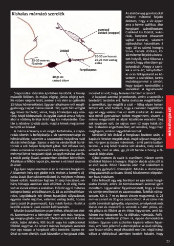 m%u00e1rnahorg%u00e1szat23Szaporod%u00e1si id%u0151szaka %u00e1prilisban kezd%u0151dik, a h%u00f3nap m%u00e1sodik fel%u00e9ben, %u00e9s m%u00e1jus v%u00e9g%u00e9ig, j%u00fanius elej%u00e9ig tart. Kis v%u00edzben rakja le ikr%u00e1it, amikor a v%u00edz el%u00e9ri az optim%u00e1lis 13 fokos h%u0151m%u00e9rs%u00e9kletet. Egyszer alkalmam ny%u00edlt megfigyelni egy csapat m%u00e1rna n%u00e1sz%u00e1t. H%u00e9t, nyolc h%u00edm elfoglal egy k%u00f6ves ter%u00fcletet, v%u00e1rva, hogy k%u00f6zeledjen egy n%u0151st%u00e9ny. Majd k%u00f6rbeveszik, %u00e9s egy%u00fctt %u00fasznak arra a helyre, ahol a n%u0151st%u00e9ny lerakja ikr%u00e1it egy kis m%u00e9lyed%u00e9sbe. Ezut%u00e1n a n%u0151st%u00e9ny tov%u00e1bb %u00faszik, majd a h%u00edmek megterm%u00e9keny%u00edtik az ikr%u00e1kat. A m%u00e1rna %u00e9rz%u00e9keny a v%u00edz oxig%u00e9n tartalm%u00e1ra, a szaporod%u00e1s siker%u00e9t is befoly%u00e1solja a v%u00edz szennyezetts%u00e9ge %u00e9s h%u0151m%u00e9rs%u00e9klete, valamint a szaporod%u00e1si helyekhez val%u00f3 eljut%u00e1s lehet%u0151s%u00e9ge. Sajnos a m%u00e1rna v%u00e1ndorl%u00e1s%u00e1t korl%u00e1tozz%u00e1k a sok helyen fel%u00e9p%u00edtett g%u00e1tak. K%u00e9t id%u0151szak van, mikor a m%u00e1rn%u00e1n%u00e1l intenz%u00edvebb a t%u00e1pl%u00e1lkoz%u00e1s, %u00e9s j%u00f3 eredm%u00e9nnyel lehet horg%u00e1szni r%u00e1juk: az egyik m%u00e1rcius-%u00e1prilis, a m%u00e1sik pedig %u0151sszel, szeptember-okt%u00f3ber k%u00f6rny%u00e9k%u00e9n. %u00c1ltal%u00e1ban a felh%u0151s napok j%u00f3k, amikor a v%u00edz kiss%u00e9 zavaros %u00e9s %u00e1rad. Egy ilyen napon mentem el %u00e9n is m%u00e1rn%u00e1ra horg%u00e1szni. A kiszemelt hely egy g%u00f6d%u00f6r volt, melyet a kem%u00e9ny aljzatba %u00e1stak (kavicskitermel%u00e9skor) %u00e9s melyben m%u00e9retes k%u00f6vek voltak. Kor%u00e1bban fogtam itt sz%u00e9p harcs%u00e1kat, n%u00e9h%u00e1ny h%u00f3napja azonban ezek elt%u0171ntek. A v%u00edz el%u00e9g tiszta volt az %u00e9vnek ebben a szak%u00e1ban. El%u0151sz%u00f6r egy 6 m%u00e9teres bolognai bottal pr%u00f3b%u00e1lkoztam, 0, 18-as zsin%u00f3rral felszerelve. Legt%u00f6bbsz%u00f6r k%u00e9t %u00f3lmot haszn%u00e1lok s%u00falyoz%u00e1snak, egym%u00e1s mell%u00e9 r%u00f6gz%u00edtve, valamint vastag test%u0171, hossz%u00fa sz%u00e1r%u00fa %u00fasz%u00f3t (4 grammosat). Egy m%u00e1sik fontos r%u00e9szlet a kezd%u0151k sz%u00e1m%u00e1ra: %u00fasz%u00f3 zsin%u00f3rt kell haszn%u00e1lni. Miut%u00e1n %u00f6ssze%u00e1ll%u00edtottam a szerel%u00e9ket, elkezdtem etetni. Szerencs%u00e9mre a k%u00f6rny%u00e9ken nem volt m%u00e1s horg%u00e1sz, %u00edgy megnyugtat%u00f3 csend volt. Etet%u00e9shez kukoric%u00e1t haszn%u00e1lok, tejbe %u00e1ztatva, f%u0151tt b%u00faz%u00e1t vagy kis sajtkock%u00e1kat f%u00f6lddel vegy%u00edtve. Az ismert m%u00e1rn%u00e1s helyeken szeretek m%u00e1r egy nappal a horg%u00e1szat el%u0151tt beetetni. Sajnos ez%u00fattal ez nem siker%u00fclt, csak k%u00f6zvetlen a horg%u00e1szat el%u0151tt. Az etet%u0151anyag gomb%u00f3cokat n%u00e9h%u00e1ny m%u00e9terrel feljebb dobtam, hogy a v%u00edz %u00e9ppen arra a helyre sz%u00e1ll%u00edtsa, ahol horg%u00e1szni sz%u00e1nd%u00e9koztam. Csalik%u00e9nt kis l%u00f3tet%u0171t, kukoric%u00e1t, kenyeret olvasztott sajttal keverve, valamint sajtkock%u00e1kat haszn%u00e1ltam, 8 vagy 10-es sz%u00e1m%u00fa horogra t%u0171zve. Felfel%u00e9 dobtam, kb. 10 m%u00e9terrel feljebb a beetetett helyt%u0151l, kiss%u00e9 f%u00e9kezve a zsin%u00f3rt, hogy elker%u00fcljem gabalyod%u00e1s%u00e1t. Ahogy a szerel%u00e9k a v%u00edzre %u00e9rt, felnyitottam az ors%u00f3 felkap%u00f3kar%u00e1t %u00e9s k%u00f6vettem a szerel%u00e9ket, tartva mutat%u00f3ujjammal a zsin%u00f3rt, hogy tudjam kontroll%u00e1lni a szerel%u00e9ket. A legnehezebb m%u0171velet az volt, hogy feszesen tartsam a zsin%u00f3rt. A kap%u00e1sok azonnal jelentkeztek, amint a szerel%u00e9k a beetetett ter%u00fcletre %u00e9rt. N%u00e9ha %u00f3vatosan meg%u00e1ll%u00edtottam a szerel%u00e9ket, %u00edgy meg%u00e1llt a csali %u2013 f%u0151leg olyan helyen tettem ezt, ahol tudtam, hogy a csalimat meg%u00e1ll%u00edtotta egy k%u0151 vagy valami m%u00e1s v%u00edz alatti szerkezet. Az akaszt%u00e1st min%u00e9l gyorsabban kellett megtennem, viszont a m%u00e1rna megpr%u00f3b%u00e1lt az aljzat k%u00f6zel%u00e9ben maradni. El%u00e9g sok kap%u00e1som volt, de sajnos nem t%u00fal nagy halak j%u00f6ttek. Szabadon engedtem %u0151ket, azt rem%u00e9lve, hogy majd megfogom, amikor nagyobbak lesznek.K%u00f6r%u00fclbel%u00fcl k%u00e9t %u00f3r%u00e1val a horg%u00e1szat kezdete ut%u00e1n, a kap%u00e1sok hirtelen megritkultak, majd teljesen megsz%u0171ntek. Horgom az %u00f6sszes m%u00e1rn%u00e1nak, - amit partra tudtam terelni -, a sz%u00e1j fels%u0151 r%u00e9sz%u00e9be volt akadva, mely sokkal er%u0151sebb, mint az als%u00f3, %u00edgy j%u00f3l %u00fclt benne a horog a f%u00e1raszt%u00e1s ideje alatt. %u00dajb%u00f3l etettem %u00e9s csalit is cser%u00e9ltem. H%u00e1rom centis l%u00f3tet%u0171ket f%u0171ztem a horogra. R%u00f6gt%u00f6n dob%u00e1s ut%u00e1n j%u00f6tt is az els%u0151 kap%u00e1s. R%u00f6vid f%u00e1raszt%u00e1s ut%u00e1n m%u00e1r sz%u00e1koltam is meg egy gy%u00f6ny%u00f6r%u0171 domolyk%u00f3t. Miut%u00e1n a domolyk%u00f3k elfogyasztott%u00e1k az %u00f6sszes l%u00f3tet%u0171 k%u00e9szletemet el%u00e9gedetten haza indultam.Este felh%u00edvott egy r%u00e9gi bar%u00e1tom %u00e9s egy k%u00f6z%u00f6s horg%u00e1szatra invit%u00e1lt, amire %u00e9n term%u00e9szetesen azonnal igent mondtam. Ugyanakkor figyelmeztetett, hogy a Duna v%u00edz szintje emelkedett %u00e9s zavarosodott. Taktik%u00e1t v%u00e1ltoztattam. K%u00e9t 2, 7 m-es botot vittem magammal, 0, 25 mm-es zsin%u00f3rt %u00e9s 35 g-os cs%u00fasz%u00f3 %u00f3lmot. A v%u00edz sz%u00edne m%u00e1s csalik bevet%u00e9s%u00e9t ig%u00e9nyelte, olyanokat, amelyeknek er%u0151s illatuk van %u00e9s messzir%u0151l is vonzz%u00e1k a halat: pi%u00f3ca, v%u00f6r%u00f6s giliszta %u00e9s f%u0151k%u00e9nt az %u00e9n titkos fegyverem, amit kb. h%u00e1rom %u00e9ve fedeztem fel. Az %u00e9