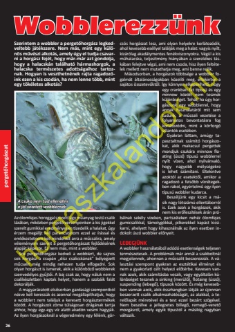 26perget%u0151horg%u00e1szatSzerintem a wobbler a perget%u0151horg%u00e1sz legkedveltebb j%u00e1t%u00e9kszere. Nem m%u00e1s, mint egy k%u00fcl%u00f6n%u00f6s m%u0171v%u00e9szi alkot%u00e1s, amely %u00fagy el tudja csavarni a horg%u00e1sz fej%u00e9t, hogy m%u00e1r-m%u00e1r azt gondolja, hogy a halacsk%u00e1n tal%u00e1lhat%u00f3 h%u00e1rmashorgok, a halacska term%u00e9szetes adotts%u00e1gaihoz tartoznak. Hogyan is veszthetn%u00e9nek rajta ragadoz%u00f3ink ezen a kis csod%u00e1n, ha nem lenne t%u00f6bb, mint egy t%u00f6k%u00e9letes alkot%u00e1s?Az %u00f3lomfejes horoggal szerelt l%u00e1gy m%u0171anyag test%u0171 csalik l%u00e1z%u00e1ban, mik%u00f6zben perget%u0151 versenyeinken a kis jigekkel szerelt gumikkal eredm%u00e9nyesen tizedelik a halakat, %u00fagy %u00e9rzem meg%u00e1lljt kell parancsolnom ezzel az %u00edr%u00e1ssal %u00e9s eml%u00e9keztetnem kell mindenkit arra a m%u0171csalira, amely v%u00e9lem%u00e9nyem szerint a perget%u0151horg%u00e1szat fejl%u0151d%u00e9s%u00e9nek alapj%u00e1t k%u00e9pezte. Ez nem m%u00e1s, mint a wobbler.Sok perget%u0151horg%u00e1sz kedveli a wobblert, de sajnos sok horg%u00e1sz a csup%u00e1n %u201ed%u00edsz csalicsk%u00e1nak%u201d b%u00e9lyegzett m%u0171csalit m%u00e9g mindig nehezen tudja elfogadni. Sok olyan horg%u00e1szt is ismerek, akik a k%u00fcl%u00f6nb%u00f6z%u0151 wobblerek szenved%u00e9lyes gy%u0171jt%u0151i. A baj csak az, hogy n%u00e1luk nem a csalik%u00e9szletben kaptak helyet, hanem a szob%u00e1ik fal%u00e1t dekor%u00e1lj%u00e1k. A magyar%u00e1zatott els%u0151sorban gazdas%u00e1gi szempontb%u00f3l n%u00e9zve kell keress%u00fck %u00e9s azonnal meg%u00e1llap%u00edthatjuk, hogy a wobblert nem tal%u00e1ljuk a keresett horg%u00e1szterm%u00e9kek k%u00f6z%u00f6tt. A horg%u00e1szok z%u00f6me t%u00fals%u00e1gosan dr%u00e1g%u00e1nak tartja ahhoz, hogy egy-egy v%u00edz alatti akad%u00f3n veszni hagyj%u00e1k. Az ilyen horg%u00e1szokn%u00e1l a v%u00e9geredm%u00e9ny egy f%u00e9l%u00e9nk, g%u00f6rcs%u00f6s horg%u00e1szat lesz, ami olyan helyekre korl%u00e1toz%u00f3dik, ahol kevesebb es%u00e9llyel tal%u00e1lj%u00e1k meg a halat: vagyis ny%u00edlt, kiz%u00e1r%u00f3lag akad%u00e1lymentes fen%u00e9kviszonyokra. V%u00e9g%u00fcl a kis m%u0171halacska, teljes%u00edtm%u00e9ny hi%u00e1ny%u00e1ban a szerel%u00e9kes t%u00e1sk%u00e1ban felejtve v%u00e9gzi, ami nem csoda, hisz ilyen felt%u00e9telek mellett nem mutathatja meg, ami benne rejlik. M%u00e1sodsorban, a horg%u00e1szok t%u00f6bbs%u00e9ge a wobbler fogalm%u00e1t %u00e1ltal%u00e1noss%u00e1gokban k%u00f6zel%u00edti meg, eltekintve a saj%u00e1tos %u00f6sszetev%u0151kt%u0151l. %u00cdgy k%u00f6nnyen elk%u00e9pzelhet%u0151, hogy egy crankbait fat t%u00edpus%u00fa %u00e9s egy minnow k%u00f6z%u00f6tt nem tesznek k%u00fcl%u00f6nbs%u00e9get. Teh%u00e1t, ha %u00fagy horg%u00e1szunk egy wobblerrel, hogy annak haszn%u00e1lat%u00e1r%u00f3l mit sem tudunk, a m%u0171csali vezet%u00e9se a folyamatos bevontat%u00e1sra fog korl%u00e1toz%u00f3dni, mint a k%u00f6rforg%u00f3 villant%u00f3k eset%u00e9ben.Gyakran l%u00e1ttam, am%u00fagy tapasztaltnak sz%u00e1m%u00edt%u00f3 horg%u00e1szokat, akik makacsul pergettek mondjuk csuk%u00e1ra minnow floating (%u00fasz%u00f3) t%u00edpus%u00fa wobblerrel ny%u00edlt v%u00edzen, ahol nyilv%u00e1nval%u00f3, hogy nagyobb m%u00e9lys%u00e9gekre is lehet sz%u00e1m%u00edtani. Eltekintve azokt%u00f3l az esetekt%u0151l, amikor a ragadoz%u00f3 a fels%u0151bb v%u00edzr%u00e9tegekben rabol, egy%u00e9rtelm%u0171 egy ilyen t%u00edpus%u00fa wobbler kudarca. Besz%u00e9lj%u00fcnk egy kicsit a m%u00e1sik nagy l%u00e9tsz%u00e1m%u00fa ellent%u00e1borr%u00f3l is. Ezek azok a horg%u00e1szok, akik nem kis er%u0151fesz%u00edt%u00e9sek %u00e1r%u00e1n pr%u00f3b%u00e1lnak sek%u00e9ly vizeken, partsz%u00e9leken neh%u00e9z %u00f3lomfejes gumicsalikkal, t%u00e1molyg%u00f3kkal, pilkerekkel kap%u00e1st kicsikarni, ahelyett hogy kihaszn%u00e1ln%u00e1k az ilyen esetben indokolt %u00fasz%u00f3 wobbler el%u0151nyeit.LEBEGJ%u00dcNKA wobbler haszn%u00e1lat%u00e1b%u00f3l ad%u00f3d%u00f3 esetlens%u00e9gek teljesen term%u00e9szetesek. A probl%u00e9m%u00e1k m%u00e1r ann%u00e1l a szakboltn%u00e1l megjelennek, ahonnan a m%u0171csalit beszerezz%u00fck. A v%u00e1laszt%u00e1si szempont gyakran az eszt%u00e9tikai %u00e9lm%u00e9nyt %u00e9s nem a gyakorlati c%u00e9lt helyezi el%u0151t%u00e9rbe. Kevesen vannak azok, akik sz%u00e1m%u00edt%u00e1sba veszik, vagy egy%u00e1ltal%u00e1n k%u00fcl%u00f6nbs%u00e9get tesznek a sinking (mer%u00fcl%u0151), flotaing (%u00fasz%u00f3), suspending (lebeg%u0151), t%u00edpusok k%u00f6z%u00f6tt. %u00c9s m%u00e9g kevesebben vannak azok, akik %u00f6sszhangban l%u00e1tj%u00e1k az %u00fajonnan beszerzett csalik alkalmazhat%u00f3s%u00e1g%u00e1t, az alakkal, a terel%u0151lap%u00e1t m%u00e9ret%u00e9vel %u00e9s a test ezzel bez%u00e1rt sz%u00f6g%u00e9vel. Nem besz%u00e9lve a jellegzetes billeg%u0151, remeg%u0151-veret%u0151 mozg%u00e1sr%u00f3l, amely egyik t%u00edpust%u00f3l a m%u00e1sikig nagyban v%u00e1ltozik. Wobblerezz%u00fcnkA csuka nem tud ellen%u00e1llni a j%u00f3l vezetett wobblernekhorgaszkalandok.hu