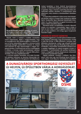 27A DUNA%u00daJV%u00c1ROSI SPORTHORG%u00c1SZ EGYES%u00dcLET perget%u0151horg%u00e1szat%u00daJ HELYEN, %u00daJ %u00c9P%u00dcLETBEN V%u00c1RJA A HORG%u00c1SZOKAT.DSHEN%u00e9zz%u00fck, mi%u00e9rt is indokolt a wobbler r%u00e9szletekbe men%u0151 megismer%u00e9se. Abb%u00f3l a meggondol%u00e1sb%u00f3l, hogy ne vesztegess%u00fcnk id%u0151t %u00e1ltal%u00e1noss%u00e1gokra a hatalmas t%u00edpus %u00e9s forma v%u00e1laszt%u00e9kb%u00f3l, egyel%u0151re a minnow (cselle) suspendig (lebeg%u0151) wobblereket emeln%u00e9m ki, melyek nem %u00e9lveznek t%u00fal nagy n%u00e9pszer%u0171s%u00e9get a magyar horg%u00e1szok k%u00f6r%u00e9ben. %u00c9rtelmetlennek tartom a helyfoglal%u00e1st e cikkben a minnow csal%u00e1d bemutat%u00e1s%u00e1val, azonban mindenk%u00e9ppen el kell id%u0151zn%u00f6m e t%u00edpusok f%u0151bb jellemz%u0151i f%u00f6l%u00f6tt, m%u00e1r ami a fejl%u0151d%u00e9s%u00fcket illeti.A minnow wobbler hossz%u00fak%u00e1s, ors%u00f3 alak%u00fa form%u00e1j%u00e1b%u00f3l ad%u00f3d%u00f3an k%u00fcl%u00f6n%u00f6sen az alacsony frekvenci%u00e1j%u00fa rezg%u00e9sekre, sz%u00e9les j%u00e1t%u00e9k%u00fa kis kileng%u00e9sekre lett kifejlesztve, melyet kezdetben a lass%u00fa, diszkr%u00e9t bevontat%u00e1sokra sz%u00e1ntak. A k%u00fcl%u00f6nb%u00f6z%u0151 perget%u00e9si technik%u00e1k elk%u00fcl%u00f6n%u00fcl%u00e9se igazolta, hogy a minnow suspending t%u00edpusokat er%u0151szakosabb vezet%u00e9si st%u00edlusban is eredm%u00e9nyesen lehet alkalmazni, mely r%u00e9szletre a k%u00f6vetkez%u0151kben b%u0151vebben kit%u00e9rek.A suspending wobblerek a kilencvenes %u00e9vek k%u00f6zep%u00e9t%u0151l jelentek meg %u00e9s a Suspen Dots rendszerrel ell%u00e1tott Storm Tunderstick t%u00edpus siker%u00e9nek k%u00f6sz%u00f6nhetik h%u00edrnev%u00fcket. Ez a t%u00edpus hihetetlen %u00e9s egyedi brav%u00farokra volt k%u00e9pes a t%u00f6bbi m%u0171csalihoz k%u00e9pest.Maradunk teh%u00e1t a tov%u00e1bbiakban is enn%u00e9l a t%u00edpusn%u00e1l, amely a mi vizeinken is bizony%u00edtotta, hogy a csuka, a balin %u00e9s nem ritk%u00e1n a s%u00fcll%u0151 is nagyobb rutinnal t%u00e1madj%u00e1k az e fajta wobblert, mint ahogy egyes horg%u00e1szaink haszn%u00e1lni tudj%u00e1k.GYAKORI %u00c9S HOSSZ%u00da SZ%u00dcNETEKFajt%u00e1jukt%u00f3l f%u00fcggetlen%u00fcl, a terel%u0151 lapk%u00e1val ell%u00e1tott wobblerek %u00e1ltal%u00e1nos jellemz%u0151je, hogy bevontat%u00e1skor mindig a m%u00e9ly fele t%u00f6rnek. A f%u0151bb elt%u00e9r%u00e9sek a vontat%u00e1s meg%u00e1ll%u00edt%u00e1sakor jelentkeznek, amikor egy s%u00fcllyed%u0151 (sinking) t%u00edpus mer%u00fclni kezd, egy %u00fasz%u00f3 (floating) pedig a felsz%u00ednre emelkedik. A bevontat%u00e1s sz%u00fcneteltet%u00e9se lehet%u0151v%u00e9 teszi a wobbler f%u00fcgg%u0151leges %u00e9s szabad mozg%u00e1s%u00e1t a k%u00edv%u00e1nt v%u00edzoszlopban. A sz%u00fcneteltet%u00e9si id%u0151 azonban korl%u00e1tozott, hiszen a meg%u00e1ll%u00edtott m%u0171csali folyamatosan elt%u00e1volodik a hal pontos tart%u00f3zkod%u00e1si hely%u00e9t%u0151l.Vegy%u00fck p%u00e9ld%u00e1nak, mondjuk a s%u00fcll%u0151z%u00e9st. Egy k%u00f6zepesen m%u00e9ly v%u00edzen egy %u00fasz%u00f3 (floating) t%u00edpus%u00fa wobblert csak nagyon r%u00f6vid ideig lesz lehet%u0151s%u00e9g%u00fcnk meg%u00e1ll%u00edtani Sok perget%u0151horg%u00e1sz kedveli a wobblert, de sajnos sok horg%u00e1sz a csup%u00e1n %u201ed%u00edsz csalicsk%u00e1nak%u201d b%u00e9lyegzett m%u0171csalit m%u00e9g mindig nehezen tudja elfogadni