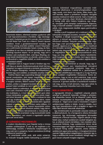perget%u0151horg%u00e1szat28bevontat%u00e1s k%u00f6zben, ellenkez%u0151 esetben gyakoriv%u00e1 v%u00e1lik a csali kapcsolatveszt%u00e9se a fen%u00e9kkel, nagy t%u00e1vols%u00e1gokon bel%u00fcl. Kiv%u00e9telek persze itt is vannak, mint a hirtelen mer%u00fcl%u0151 Rebel Fast Track %u00e9s a Mann%u2019s Stretch t%u00edpusok eset%u00e9ben. Enn%u00e9l a gondolatmenetn%u00e9l maradva, egy minnow sinking (mer%u00fcl%u0151) wobbler viszont folyamatosan a s%u00fcll%u0151 k%u00edv%u00e1nt tart%u00f3zkod%u00e1si hely%u00e9n mozog, de fokozottabban ki van t%u00e9ve az elakad%u00e1s vesz%u00e9ly%u00e9nek az %u00fasz%u00f3 (floating) t%u00edpushoz k%u00e9pest. Az az igazs%u00e1g, hogy ami a fen%u00e9ken val%u00f3 viselked%u00e9st illeti, a k%u00e9t t%u00edpus (floating, sinking) k%u00f6z%u00f6tt kib%u00e9k%u00edthetetlen az ellent%u00e9t, amely a mer%u00fcl%u0151 t%u00edpusokn%u00e1l a meg%u00e1ll%u00edt%u00e1si id%u0151b%u0151l, az %u00fasz%u00f3k eset%u00e9ben a vontat%u00e1sb%u00f3l ad%u00f3dik. K%u00e9pzelj%u00fck csak el, hogyan landol a fen%u00e9ken egy mer%u00fcl%u0151 t%u00edpus az akad%u00f3s fen%u00e9kviszonyoknak kitett h%u00e1rmashorgaival, ha nagyon kih%u00fazzuk a vontat%u00e1s sz%u00fcneteltet%u00e9s%u00e9t, %u00e9s hogyan kopogtatja, m%u00e9retes terel%u0151lap%u00e1tj%u00e1val a feneket egy %u00fasz%u00f3 wobbler, az elakad%u00e1s vesz%u00e9lye n%u00e9lk%u00fcl.Ezekhez k%u00e9pest egy suspending (lebeg%u0151) modell ott marad mozdulatlan, ahol %u00e9ppen meg%u00e1ll%u00edtottuk, megdermedve a k%u00edv%u00e1nt m%u00e9lys%u00e9gen. Ez egy %u00f3ri%u00e1si el%u0151ny lehet a horg%u00e1sz sz%u00e1m%u00e1ra, f%u0151k%u00e9nt r%u00e9szben leh%u0171lt 10-12 fokos vizeken, amikor a r%u00e1v%u00e1g%u00e1sok kev%u00e9sb%u00e9 agressz%u00edvak, a ragadoz%u00f3 halak lust%u00e1bbak %u00e9s nem hajland%u00f3ak nagy ter%u00fcleteken %u00fcld%u00f6zni a zs%u00e1km%u00e1nyt. A wobbler meg%u00e1ll%u00edt%u00e1s%u00e1val nem csak a kiv%u00e1r%u00e1sra ny%u00edlik lehet%u0151s%u00e9g, hanem a t%u00e1mad%u00e1s kiv%u00e1lt%u00e1s%u00e1ra is. A bot hegy%u00e9b%u0151l leadott apr%u00f3 oldalir%u00e1ny%u00fa r%u00e1nt%u00e1sokkal, a ragadoz%u00f3k sz%u00e1m%u00e1ra vonz%u00f3, megriadt kishal l%u00e1tszat%u00e1t kelthetj%u00fck. Ezzel a m%u00f3dszerrel nem csak egy %u00e9rz%u00e9keny csalivezet%u00e9st tudunk el%u00e9rni, relat%u00edv sz%u0171k helyen, hanem az ilyenkor kev%u00e9sb%u00e9 akt%u00edv ragadoz%u00f3 halakat is kap%u00e1sra b%u00edrhatjuk. Er%u0151sen szeles id%u0151ben, 2-3 m%u00e9teres v%u00edzen horg%u00e1szva, hossz%u00fa bevontat%u00e1si sz%u00fcnetekkel is eredm%u00e9nyesek lehet%u00fcnk an%u00e9lk%u00fcl, hogy b%u00e1rmilyen mozg%u00e1st kellene k%u00f6lcs%u00f6n%u00f6zn%u00fcnk a m%u0171csalinak. A hull%u00e1mok keltette %u00e1ramlatok is alig %u00e9szrevehet%u0151n keltik %u00e9letre a wobblert, ami viszont a ragadoz%u00f3k sz%u00e1m%u00e1ra igencsak vonz%u00f3 lehet.J%u00d3 SZ%u00c1ND%u00c9K%u00da MEGTERHEL%u00c9SA modern k%u00f6zv%u00e9lem%u00e9ny Lauri Rapalat tartja a minow wobbler sz%u00fcl%u0151atyj%u00e1nak. %u0150 volt az, aki majdnem a t%u00f6k%u00e9letess%u00e9gig csiszolta a fahalacska tulajdons%u00e1gait %u00e9s m%u00e9g csak nem is pergetve, hanem vontat%u00e1sos (trolling) m%u00f3dszerrel tesztelve azt. Az amerikaiak voltak azok, akik azt%u00e1n univerz%u00e1lis m%u0171csalit faragtak bel%u0151le baitcasting (%u201ecsalivet%u0151%u201d) ors%u00f3val, k%u00fcl%u00f6nb%u00f6z%u0151 megszak%u00edt%u00e1sos vontat%u00e1si m%u00f3dszerekkel alkalmazva. A versenyhorg%u00e1szatban olyan nagy nevek, mint Kevin Van Dame, Mike Auten, Gerald Swindle, %u00e9ppen a jerkel%u00e9ses (r%u00e1ngat%u00f3, r%u00e1ncig%u00e1l%u00f3 vezet%u00e9s) m%u00f3dszerrel v%u00e1ltak ismert%u00e9. Ezek a horg%u00e1szok, meglep%u0151en gyorsan, olyan l%u00e1tv%u00e1nyos sikereket %u00e9rtek el meleg vizek akt%u00edv halaira horg%u00e1szva, egy r%u00e1ngat%u00f3, r%u00e1ncig%u00e1l%u00f3 (jerk) temp%u00f3j%u00fa csalivezet%u00e9sre alapozva, hogy a haszn%u00e1lt wobbler csal%u00e1dnak is a jerkbait nevet adt%u00e1k, mely megnevez%u00e9s k%u00e9s%u0151bb egyes gumicsalikra is %u00e1tragadt. K%u00e9s%u0151bb a profi horg%u00e1szok ezt a m%u00f3dszert sikerrel alkalmazt%u00e1k a hidegebb %u00e9vszakok, zordabb felt%u00e9telei k%u00f6zt is. R%u00e1j%u00f6ttek, a lebeg%u0151 (suspending) wobblerben rejl%u0151 el%u0151nyre: a m%u0171csali egy helyben tart%u00e1s%u00e1ra. Ez az igen kifinomult m%u00f3dszer, melynek eredm%u00e9nyess%u00e9ge nagyban f%u00fcgg a bot spicc%u00e9b%u0151l leadott mozd%u00edt%u00e1sokt%u00f3l, r%u00e1nt%u00e1sokt%u00f3l, vigy%u00e1zva arra, hogy a wobblert ne mozd%u00edtsuk ki a t%u00e1mad%u00e1si ter%u00fcletr%u0151l. A m%u00f3dszer halradar haszn%u00e1lat%u00e1val m%u00e9g sikeresebb%u00e9 %u00e9s pontosabb%u00e1 v%u00e1lt. Ez ut%u00f3bbi meg%u00e1llap%u00edt%u00e1s ok%u00e1n is megbizonyosodhatunk arr%u00f3l, hogy van m%u00e9g mit kezden%u00fcnk a tudatos helyfelt%u00e9rk%u00e9pez%u0151 horg%u00e1szattal, ann%u00e1l is ink%u00e1bb, mert egyre n%u00e9pszer%u0171bb ir%u00e1nyzatk%u00e9nt jelentkezik a modern seg%u00e9deszk%u00f6z%u00f6k fejl%u0151d%u00e9s%u00e9vel p%u00e1rhuzamosan.Miel%u0151tt arra gondoln%u00e1nak az olvas%u00f3k, hogy egy titokzatos semmivel nem helyettes%u00edthet%u0151 m%u0171csalir%u00f3l besz%u00e9lek, megnyugtatn%u00e9k mindenkit, hogy nem a suspending wobblerek tal%u00e1lt%u00e1k fel a %u201espanyolviaszt.%u201d K%u00f6nnyed%u00e9n el%u0151%u00e1ll%u00edthatjuk mi magunk is, ha egy floating (%u00fasz%u00f3) wobblert megfelel%u0151en kis%u00falyozunk. Szinte term%u00e9szetes, hogy az lesz az els%u0151 reakci%u00f3nk, hogy lyukat f%u00farunk a wobbler has%u00fcregi r%u00e9sz%u00e9n %u00e9s s%u00f6r%u00e9t%u00f3lommal kis%u00falyozzuk. A gondok azonban a tesztel%u00e9sn%u00e9l mutatkoznak meg, amikor r%u00e1 kell j%u00f6nn%u00fcnk, hogy igen neh%u00e9z ily m%u00f3don egyens%u00falyi helyzetbe hozni a kis fahalat.NULLA GRAVIT%u00c1CI%u00d3A legnagyobb kih%u00edv