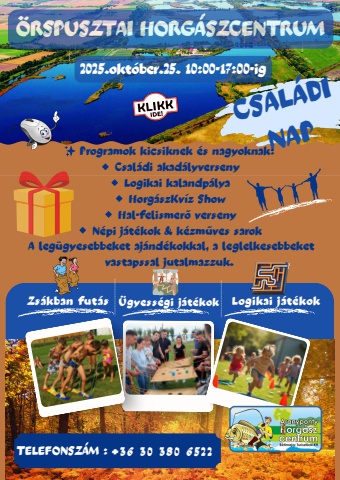CSAL%u00c1DI Programok kicsiknek %u00e9s nagyoknak:NAP Csal%u00e1di akad%u00e1lyverseny Logikai kalandp%u00e1lya Horg%u00e1szKv%u00edz Show Hal-felismer%u0151 verseny N%u00e9pi j%u00e1t%u00e9kok & k%u00e9zm%u0171ves sarok A leg%u00fcgyesebbeket aj%u00e1nd%u00e9kokkal, a leglelkesebbeketvastapssal jutalmazzuk.TELEFONSZ%u00c1M : +36 30 380 6522%u00d6RSPUSZTAI HORG%u00c1SZCENTRUM2025.okt%u00f3ber.25. 10:00-17:00-igZs%u00e1kban fut%u00e1s %u00dcgyess%u00e9gi j%u00e1t%u00e9kok Logikai j%u00e1t%u00e9kok