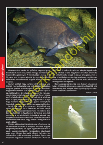 keszeghorg%u00e1szat6K%u00f6vetkezett az etet%u00e9s. Kis golflabda nagys%u00e1g%u00fa gomb%u00f3cokat dob%u00e1ltam be a partt%u00f3l mintegy 15 m%u00e9ternyire kiszemelt horg%u00e1szhelyre. A v%u00edz m%u00e9lys%u00e9ge 1 m%u00e9ter %u00e9s 1, 20 m%u00e9ter volt, homokos aljzattal, %u00edgy egyszer%u0171en elk%u00e9pzelhetetlen volt sz%u00e1momra, hogy ne jelenn%u00e9nek meg a d%u00e9v%u00e9rek.%u00cdgy h%u00e1t an%u00e9lk%u00fcl, hogy tudtam volna mi lesz a v%u00e9gkifejlet, megkock%u00e1ztattam az els%u0151 dob%u00e1st. Bedobtam m%u00e9g k%u00e9t gomb%u00f3c etet%u0151anyagot %u00e9s v%u00e1rtam. K%u00f6r%u00fclbel%u00fcl negyed%u00f3ra v%u00e1rakoz%u00e1s ut%u00e1n jelentkezett az els%u0151 kap%u00e1s %u00e9s az els%u0151 teny%u00e9rnyi d%u00e9v%u00e9rkeszeg. Figyelem! Ha nem szeretn%u00e9k hazavinni a halat, szerelkezzenek fel egy hossz%u00fa apr%u00f3 sz%u00f6v%u00e9s%u0171 sz%u00e1kkal, mert ez nem s%u00farolja le a hal test%u00e9r%u0151l az apr%u00f3 pikkelyeket %u00e9s %u00edgy megmarad az es%u00e9lye, hogy m%u00e1skor is kifogj%u00e1k. %u00c9n egy 7 gy%u0171r%u0171s versenyh%u00e1l%u00f3t haszn%u00e1lok, mellyel maxim%u00e1lisan meg vagyok el%u00e9gedve. De t%u00e9rj%u00fcnk vissza a horg%u00e1szathoz. Az els%u0151 hal ut%u00e1n sz%u00fcnet k%u00f6vetkezett. Ezt a beetettet ter%u00fcleten megfigyelhet%u0151 dulakod%u00e1s sz%u00e1ml%u00e1j%u00e1ra %u00edrtam. F%u00e9l m%u00e9terre dobtam az etet%u00e9st%u0151l, %u00e9s figyeltem mi t%u00f6rt%u00e9nik a beetetett ter%u00fcleten. A v%u00edz felsz%u00edn%u00e9n kis bubor%u00e9kok jelentek meg melyeket a v%u00edz fenek%u00e9n t%u00e1pl%u00e1lkoz%u00f3 halak bocs%u00e1tottak ki. Bebizonyosodott teh%u00e1t, hogy ebben a hideg v%u00edzben is eszik a d%u00e9v%u00e9r. Miut%u00e1n sz%u00e9tsz%u00f3r%u00f3dott az etet%u0151anyag a fen%u00e9ken, a halak elkezdt%u00e9k felkutatni a k%u00f6rnyez%u0151 ter%u00fcletet. Nagyon megk%u00f6nnyebb%u00fcltem, az egyik legeml%u00e9kezetesebb %u00e9s egyik legesem%u00e9nyd%u00fasabb horg%u00e1szatom k%u00f6vetkezett ezek ut%u00e1n. Minden harmadik kifogott hal ut%u00e1n, bedobtam h%u00e1rom kis etet%u0151anyag gomb%u00f3cot. %u00cdgy tudtam majdnem n%u00e9gy %u00f3r%u00e1n kereszt%u00fcl fenntartani a halak %u00e9rdekl%u0151d%u00e9s%u00e9t. Ezut%u00e1n m%u00e1r cs%u00f6kkent a kap%u00e1sok gyakoris%u00e1ga. Az lehetett az oka, hogy felh%u0151k %u00e9rkeztek, ami miatt 3-4 fokkal leh%u0171lt a leveg%u0151 %u00e9s ez %u00fagy a horg%u00e1szt, mint a halat is befoly%u00e1solta, ez%u00e9rt %u00fagy gondoltam tov%u00e1bbi marad%u00e1somnak m%u00e1r nem volt %u00e9rtelme, ez%u00e9rt elkezdtem %u00f6sszegy%u0171jteni a dolgaimat.%u0150szi horg%u00e1szat sor%u00e1n m%u00e9g nem fogtam soha ennyi halat. A legszebb %u00e9lm%u00e9nyem eredm%u00e9nye k%u00f6zel 11 kil%u00f3 d%u00e9v%u00e9rkeszeg lett, melyek mind egyt%u0151l egyig visszaker%u00fcltek s%u00e9rtetlen%u00fcl otthonukba. Kont%u00e1r Csaba horgaszkalandok.hu