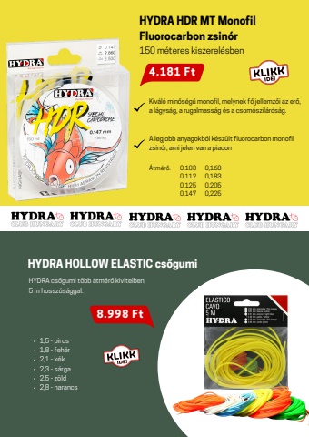 Kiv%u00e1l%u00f3 min%u0151s%u00e9g%u0171 monofil, melynek f%u0151 jellemz%u0151i az er%u0151,a l%u00e1gys%u00e1g, a rugalmass%u00e1g %u00e9s a csom%u00f3szil%u00e1rds%u00e1g.A legjobb anyagokb%u00f3l k%u00e9sz%u00fclt fluorocarbon monofilzsin%u00f3r, ami jelen van a piaconHYDRA HDR MT MonofilFluorocarbon zsin%u00f3r 150 m%u00e9teres kiszerel%u00e9sben0,1030,112 0,125 0,147 0,168 0,1830,2050,225%u00c1tm%u00e9r%u0151:HYDRA HOLLOW ELASTIC cs%u0151gumi1,5 - piros1,8 - feh%u00e9r2,1 - k%u00e9k2,3 - s%u00e1rga2,5 - z%u00f6ld2,8 - narancsHYDRA cs%u0151gumi t%u00f6bb %u00e1tm%u00e9r%u0151 kivitelben, 5 m hossz%u00fas%u00e1ggal. 4.181 Ft8.998 Ft