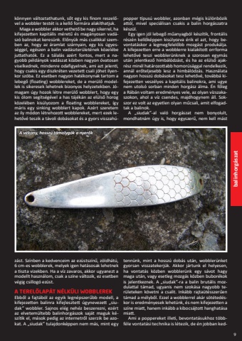 balinhorg%u00e1szat 9k%u00f6nnyen v%u00e1ltoztathatunk, s%u0151t egy kis finom reszel%u0151vel a wobbler test%u00e9t is a kell%u0151 form%u00e1ra alak%u00edthatjuk. Maga a wobbler akkor vethet%u0151 be nagy sikerrel, ha kifejezetten kapit%u00e1lis m%u00e9ret%u0171 %u00e9s mag%u00e1nyosan vad%u00e1sz%u00f3 balinokat keres%u00fcnk. El%u0151ny%u00fck m%u00e1s csalikkal szemben az, hogy az %u00e1ramlat sz%u00e1rnyain, egy kis %u00fcgyess%u00e9ggel, eg%u00e9szen a balin vad%u00e1szter%u00fclet%u00e9nek k%u00f6zel%u00e9be juttathat%u00f3k. Ez a t%u00e1lal%u00e1s az%u00e9rt fontos, mert a nagyobb p%u00e9ld%u00e1nyok vad%u00e1szat k%u00f6zben nagyon %u00f3vatosan viselkednek, mindenre odafigyelnek, ami azt jelenti, hogy csakis egy diszkr%u00e9ten vezetett csali j%u00f6het ilyenkor sz%u00f3ba. Ez esetben nagyon hat%u00e9konynak tartom a lebeg%u0151 (floating) wobblereket, de a mer%u00fcl%u0151 modellek is sikeresek lehetnek bizonyos helyzetekben. J%u00f3magam %u00fagy hozok l%u00e9tre mer%u00fcl%u0151 wobblert, hogy egy kis %u00f3lom seg%u00edts%u00e9g%u00e9vel a has t%u00e1j%u00e9k%u00e1n az el%u00fcls%u0151 horog k%u00f6zel%u00e9ben kis%u00falyozom a floating wobblereket, %u00edgy m%u00e1ris egy sinking wobblert kapok. Az%u00e9rt szeretem az ily m%u00f3don l%u00e9trehozott wobblereket, mert ezek lehet%u0151v%u00e9 teszik a t%u00e1voli dob%u00e1sokat %u00e9s a gyors visszah%u00faz%u00e1st. Sz%u00ednben a kedvenceim az ez%u00fcstsz%u00edn%u0171, z%u00f6ldh%u00e1t%u00fa, 6 cm-es wobblerek, melyek igen hat%u00e1sosak lehetnek a tiszta vizekben. Ha a v%u00edz zavaros, akkor ugyanezt a modellt haszn%u00e1lom, csak a sz%u00edne v%u00e1ltozik, ez esetben v%u00e9gig csillog%u00f3 ez%u00fcst. A TEREL%u0150LAP%u00c1T N%u00c9LK%u00dcLI WOBBLEREKEbb%u0151l a fajt%u00e1b%u00f3l az egyik legn%u00e9pszer%u0171bb modell, a kifejezetten balinra kifejlesztett %u00fagynevezett %u201esiudak%u201d wobbler. Sajnos el%u00e9g neh%u00e9z beszerezni, ez%u00e9rt az elvetem%u00fcltebb balinhorg%u00e1szok saj%u00e1t maguk k%u00e9sz%u00edtik el, m%u00e1sok pedig az internetr%u0151l szerzik be azokat. A %u201esiudak%u201d tulajdonk%u00e9ppen nem m%u00e1s, mint egy popper t%u00edpus%u00fa wobbler, azonban m%u00e9gis k%u00fcl%u00f6nb%u00f6zik att%u00f3l, mivel speci%u00e1lisan csakis a balin horg%u00e1szatra k%u00e9sz%u00fcl. Egy igen j%u00f3l lebeg%u0151 m%u0171anyagb%u00f3l k%u00e9sz%u00edtik, front%u00e1lis r%u00e9sz%u00e9n kell%u0151k%u00e9ppen kis%u00falyozva %u00e9rik el azt, hogy bevontat%u00e1skor a legmegfelel%u0151bb mozg%u00e1st produk%u00e1lja. A kifejezetten erre a wobblerre kialak%u00edtott orrforma lehet%u0151v%u00e9 teszi wobbler%u00fcnknek a szorosan egym%u00e1s ut%u00e1n jelentkez%u0151 himb%u00e1l%u00f3dz%u00e1st, %u00e9s ha az el%u00fcls%u0151 ajakr%u00e9sz min%u00e9l hat%u00e1rozottabb homor%u00fas%u00e1ggal rendelkezik, ann%u00e1l er%u0151teljesebb lesz a himb%u00e1l%u00f3dz%u00e1s. Haszn%u00e1lata nagyon hossz%u00fa dob%u00e1sokat tesz lehet%u0151v%u00e9, tov%u00e1bb%u00e1 kifejezetten vesz%u00e9lyes a kapit%u00e1lis balinokra, ami ugye nem utols%u00f3 sorban minden horg%u00e1sz %u00e1lma. %u00c9n f%u0151leg a R%u00e1b%u00e1n voltam eredm%u00e9nyes vele, az olyan v%u00edzszakaszokon, ahol a v%u00edz csendes, majdhogynem %u00e1ll. Sokszor ez volt az egyetlen olyan m%u0171csali, amit elfogadtak a balinok. A %u201esiudak%u201d-al val%u00f3 horg%u00e1szat nem bonyolult, mondhatn%u00e1m %u00fagy is, hogy egyszer%u0171, nem kell m%u00e1st tenn%u00fcnk, mint a hossz%u00fa dob%u00e1s ut%u00e1n, wobbler%u00fcnket gyorsan visszatekerj%u00fck. Akkor j%u00e1rtunk el helyesen, ha vontat%u00e1s k%u00f6zben wobbler%u00fcnk egy s%u00e1vot hagy maga ut%u00e1n, vagy esetleg mozg%u00e1s k%u00f6zben bubor%u00e9kok is jelentkeznek. A %u201esiudak%u201d-ra a balin brut%u00e1lis mozdulattal t%u00e1mad, ugyanis nem szok%u00e1sa nagyobb ter%u00fcleteken k%u00f6vetni a csalit. Ink%u00e1bb rajta%u00fct%u00e9sszer%u0171en t%u00e1mad a m%u00e9lyb%u0151l. Ezzel a wobblerrel ak%u00e1r s%u00f6t%u00e9ted%u00e9skor is eredm%u00e9nyesek lehet%u00fcnk, %u00e9s nem kifejezetten a sz%u00edne miatt, hanem ink%u00e1bb a kibocs%u00e1jtott hanghat%u00e1sa miatt. Ami a poppereket illeti, bevontat%u00e1sukhoz t%u00f6bbf%u00e9le vontat%u00e1si technika is l%u00e9tezik, de %u00e9n jobban kedA v%u00e9kony, hossz%u00fa t%u00e1molyg%u00f3k a nyer%u0151k