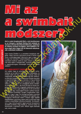 Mi az a swimbait m%u00f3dszer?perget%u0151horg%u00e1szat20Ami a csuka horg%u00e1szat%u00e1t illeti, a v%u00e9n kontinensen ez az ir%u00e1nyzat a jerkbait fishing fel%u00e9 tol%u00f3dott el, viszont az %u00c9szak-Amerikai kontinensen, Jap%u00e1nban %u00e9s n%u00e9h%u00e1ny eur%u00f3pai orsz%u00e1gban, ahol %u00fajabban a fe- kete s%u00fcg%u00e9r lett a sl%u00e1ger hal, itt sikeresen alkalmaz- z%u00e1k a swimbait m%u00f3dszert.Isten hozta %u00d6n%u00f6ket is a swimbait horg%u00e1szat vil%u00e1g%u00e1ba. Vajon honnan sz%u00e1rmazik ennek a neh%u00e9z csalinak a sz%u00fcks%u00e9gess%u00e9ge? Mennyire igaz a nagy csali-nagy hal mond%u00e1s? Tulajdonk%u00e9ppen mit %u00e9rt%u00fcnk a swimbait m%u00f3dszer alatt %u00e9s vajon milyen csalik illenek bele ebbe a kateg%u00f3ri%u00e1ba, amelyek elragadt%u00e1k a ragadoz%u00f3horg%u00e1sz fant%u00e1zi%u00e1j%u00e1t ihlett%u00e9k az ut%u00f3bbi id%u0151ben?EGY BEJELENTETT SIKER KR%u00d3NIK%u00c1JAAzt tudjuk, hogy az amerik%u00e1nusok %u00fagymond verhetetlenek az %u00faj csalik %u00e9s trendek piacra dob%u00e1s%u00e1ban, %u00e9s mindez az%u00e9rt van %u00edgy, mert %u00f3ri%u00e1si a piacuk, ahol ezt megtehetik. N%u00e9h%u00e1ny %u00e9vvel kor%u00e1bban egy D%u00e9l- Kaliforniai sz%u0171k k%u00f6r%u0171 horg%u00e1szcsoport sikeresen kezdte haszn%u00e1lni a nagym%u00e9ret%u0171 l%u00e1gy csalikat a m%u00e9retes, 3-4 kg-os fekete s%u00fcg%u00e9r kifog%u00e1s%u00e1ra. Mivel a j%u00f3 h%u00edr gyorsan terjed, - k%u00fcl%u00f6n%u00f6sen a %u201ev%u00edzben, mivel az a leveg%u0151n%u00e9l t%u00edzszer s%u0171r%u0171bb%u201d, de %u00fajabban a neten is %u2013 %u00edgy r%u00f6vid id%u0151 alatt az %u00f6sszes horg%u00e1sz tudom%u00e1st szerzett a leg%u00fajabb tal%u00e1lm%u00e1nyr%u00f3l. Ezek a horg%u00e1szok a fekete s%u00fcg%u00e9r kifog%u00e1s%u00e1n%u00e1l 15-20 centim%u00e9ter hossz%u00fas%u00e1g%u00fa l%u00e1gy m%u0171anyagb%u00f3l k%u00e9sz%u00fclt csalikat haszn%u00e1ltak, amelyet eredetileg a tengeri horg%u00e1szatban alkalmazott 1 vagy 2 vagy 3 oz t%u00f6meg%u0171 jig fejekre szereltek fel (1 oz=28,35 gramm,). A tengeren t%u00fali legt%u00f6bb mesters%u00e9gesen l%u00e9trehozott v%u00edzben a fekete s%u00fcg%u00e9r legf%u0151bb t%u00e1pl%u00e1l%u00e9k%u00e1llata a pisztr%u00e1ng, %u00e9ppen ez%u00e9rt az els%u0151 ilyen l%u00e1gy csalikat a lazacf%u00e9l%u00e9ket ut%u00e1nozva festett%u00e9k. Term%u00e9szetesen a nagy m%u0171csali-gy%u00e1rt%u00f3 c%u00e9gek azonnal r%u00e1csaptak %u00e9s %u00e1tvett%u00e9k az %u00f6tletet, m%u00e9g miel%u0151tt az %u201evizet %u00e9rt volna%u201d %u00e9s l%u00e9trehozt%u00e1k a swimbait csalit. %u00c1ll%u00edtom egyik %u00e9leth%u0171bb volt, mint a m%u00e1sik. www.horgaszkalandok.hu