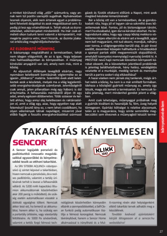 27 k%u00f6rnyezetv%u00e9delema minket k%u00f6r%u00fclvev%u0151 vil%u00e1g %u201eel%u0151%u00edr%u201d sz%u00e1munkra, vagy annak nem t%u00fal pozit%u00edv szerepl%u0151i sugallnak. Nyilv%u00e1nval%u00f3an lesznek olyanok, akik nem %u00e9rtenek egyet a probl%u00e9mak%u00e9nt felvetett dolgokkal %u00e9s azok megold%u00e1saival sem. Ez pedig j%u00f3 lesz egy vitaind%u00edt%u00f3nak is. Teh%u00e1t v%u00e1rjuk az %u00e9szrev%u00e9teleket, v%u00e9lem%u00e9nyeket mindenkit%u0151l. Ha m%u00e1r csak elm%u00e9leti s%u00edkon tudunk tenni valamit a k%u00f6rnyezet%u00e9rt, m%u00e1r meg%u00e9rte pap%u00edrra vetni, mert hissz%u00fck, az %u0151szinte j%u00f3akarat erk%u00f6lcsileg megk%u00e9rd%u0151jelezhetetlen.AZ ELDOBHAT%u00d3 M%u0170ANYAGA b%u00e1zisanyaga megtal%u00e1lhat%u00f3 a term%u00e9szetben, teh%u00e1t nem idegen vil%u00e1gunkt%u00f3l, de az is igaz, hogy teljesen m%u00e1s halmaz%u00e1llapotban %u00e9s k%u00f6rnyezetben. A m%u0171anyag kiindul%u00e1si anyag%u00e1r%u00f3l van sz%u00f3, amely nem m%u00e1s, mint a k%u0151olaj.Az elpusztult %u00e9l%u0151l%u00e9nyek leveg%u0151t%u0151l elz%u00e1rtan, nagy nyom%u00e1son keletkezett boml%u00e1s%u00e1nak v%u00e9gterm%u00e9ke ez az igaz%u00e1n %u201et%u00f6bbarc%u00fa%u201d mat%u00e9ria. Sz%u00e1zmilli%u00f3 %u00e9vek alatt keletkeztek azok a k%u00e9szletek, melyek ma a vil%u00e1g legjelent%u0151sebb energiahordoz%u00f3j%u00e1nak sz%u00e1m%u00edtanak. Jelent%u0151s%u00e9g%u00e9r%u0151l csak annyit, jelen pillanatban m%u00e9g egy h%u00e1bor%u00fa is d%u00fal %u00e9rte/miatta. A felhaszn%u00e1l%u00e1s m%u00e9rt%u00e9k%u00e9r%u0151l %u00e1lljon itt egy adat, amely eg%u00e9szen d%u00f6bbenetes. T%u00f6bb sz%u00e1zezer %u00e9v kellett ahhoz, hogy annyi olaj keletkezzen %u00e9s rakt%u00e1roz%u00f3djon el, amit a vil%u00e1g egy, azaz, hogy egyetlen nap alatt felem%u00e9szt! Ijeszt%u0151 t%u00e9ny ez, s nem lehet csod%u00e1lkozni, ha olyan v%u00e9lem%u00e9nyek l%u00e1tnak napvil%u00e1got, miszerint j%u00f3val el%u0151bb fogj%u00e1k a fosszilis energiahordoz%u00f3kkal sz%u00e1rmaz%u00f3 g%u00e1zok %u00e9s f%u00fcst%u00f6k eltakarni el%u0151l%u00fcnk a Napot, mint azok megl%u00e9v%u0151 k%u00e9szletei kimer%u00fcln%u00e9nek! B%u00e1r a k%u0151olaj ott van a term%u00e9szetben, de az gondoskodott r%u00f3la, hogy j%u00f3l el legyen z%u00e1rva sokmilli%u00f3 %u00e9ves k%u0151zetlemezek k%u00f6z%u00e9. Fontos, j%u00f3l %u00e9s biztons%u00e1gosan t%u00e1rolni, mert ha elszabadul, igen durva k%u00e1rokat okozhat. Ha belegondolunk abba, hogy egy csepp k%u0151olaj mekkora v%u00edzfel%u00fcleten k%u00e9pes elter%u00fclni %u00e9s elz%u00e1rni azt a leveg%u0151t%u0151l, ugye nem kell magyar%u00e1zni, mit tud okozni, mondjuk, n%u00e9h%u00e1ny ezer tonna, a vil%u00e1gtengerekbe ker%u00fcl%u0151 olaj. J%u00f3 p%u00e1r %u00e9vvel ezel%u0151tt, december k%u00f6zep%u00e9n hallhattunk a h%u00edrad%u00e1sokb%u00f3l a spanyol partok el%u0151tt megsemmis%u00fclt olajsz%u00e1ll%u00edt%u00f3r%u00f3l, amelyb%u0151l iszonyatos mennyis%u00e9g%u0171 nyersolaj %u00f6ml%u00f6tt ki. A PRESTIGE nev%u0171 haj%u00f3 nemcsak k%u00f6zvetlen k%u00f6rnyezeti k%u00e1rokat okozott, de a k%u00f6zvetetten jelentkez%u0151 probl%u00e9m%u00e1k is jelenleg bel%u00e1thatatlanok, h%u00e1ny hal%u00e1sz, vend%u00e9gl%u00e1t%u00f3s vesztette el a munk%u00e1j%u00e1t, meddig tartott %u00e9s mennyibe ker%u00fclt a partra sodort olaj elt%u00e1vol%u00edt%u00e1sa?A hazai vizeken nem j%u00e1rnak olaj tankerek, m%u00e9gis %u00e1rthat nekik a k%u0151olaj, ha nem is a m%u00e1r eml%u00edtett form%u00e1ban. Idehaza a k%u0151olajb%u00f3l gy%u00e1rtott m%u0171anyag az, amely %u00fagy l%u00e1tszik, maga al%u00e1 temeti a term%u00e9szetet. Ez nemcsak lok%u00e1lis jelens%u00e9g, mert mindenhol gondot jelent a vil%u00e1gban.Amit csak lehets%u00e9ges, m%u0171anyaggal pr%u00f3b%u00e1lnak meg a gy%u00e1rt%u00f3k kiv%u00e1ltani %u00e9s haszn%u00e1lj%u00e1k fa, f%u00e9m, %u00fcveg helyett t%u00f6megesen. Gy%u00e1rt%u00e1si k%u00f6lts%u00e9gei is relat%u00edve alacsonyak, tal%u00e1n ez is magyar%u00e1zza, hogy szinte semmif%u00e9le megbecs%u00fcl%u00e9st sem %u00e9lveznek a m%u0171anyagb%u00f3l k%u00e9sz%u00fclt term%u00e9TAKAR%u00cdT%u00c1S K%u00c9NYELMESEN A Sencor leg%u00fajabb porsz%u00edv%u00f3i %u00e9s padl%u00f3tiszt%u00edt%u00f3i innovat%u00edv megold%u00e1saikkal egyszer%u0171bb%u00e9 %u00e9s k%u00e9nyelmesebb%u00e9 teszik az otthoni takar%u00edt%u00e1st. Az SRV 9790BK AQUINO+ robotporsz%u00edv%u00f3 %u00faj szintet k%u00e9pvisel a takar%u00edt%u00e1sban, hiszen nemcsak a porsz%u00edv%u00f3z%u00e1s, de a nedves padl%u00f3t%u00f6rl%u00e9s, valamint a tart%u00e1ly %u00fcr%u00edt%u00e9s%u00e9nek terh%u00e9t is leveszi a felhaszn%u00e1l%u00f3k v%u00e1ll%u00e1r%u00f3l. Az 5200 mAh kapacit%u00e1s%u00fa l%u00edtiumion akkumul%u00e1tornak k%u00f6sz%u00f6nhet%u0151en ak%u00e1r 200 percig is m%u0171k%u00f6dtet%u0151, de sz%u00fcks%u00e9g eset%u00e9n automatikusan visszat%u00e9r a dokkol%u00f3 egys%u00e9ghez t%u00f6lteni. Nemcsak akkor teszi ezt, ha lemer%u00fcl az akkumul%u00e1tor, hanem akkor is, ha sz%u00fcks%u00e9g van a portart%u00e1ly %u00fcr%u00edt%u00e9s%u00e9re, vagy vizestart%u00e1ly felt%u00f6lt%u00e9s%u00e9re. Az 5000 Pa sz%u00edv%u00f3er%u0151nek, valamint a kett%u0151s forg%u00f3 felmos%u00f3 technol%u00f3gi%u00e1nak k%u00f6sz%u00f6nhet%u0151en k%u00f6nnyed%u00e9n elb%u00e1nik a szennyez%u0151d%u00e9sekkel, a Self-Clean funkci%u00f3 pedig automatikusan tiszt%u00edtja a felmos%u00f3 korongokat. Nemcsak t%u00e1vir%u00e1ny%u00edt%u00f3val, hanem a Sencor Home alkalmaz%u00e1ssal is ir%u00e1ny%u00edthat%u00f3 %u00e9s a Multi-rooming r%u00e9v%u00e9n ak%u00e1r helyis%u00e9genk%u00e9nt elt%u00e9r%u0151 takar%u00edt%u00e1si tervek adhat%u00f3k meg a k%u00e9sz%u00fcl%u00e9knek. Tov%u00e1bbi kedvez%u0151 aj%u00e1nlatok%u00e9rt k%u00e9rj%u00fck l%u00e1togasson el a sencor.hu weboldalra!