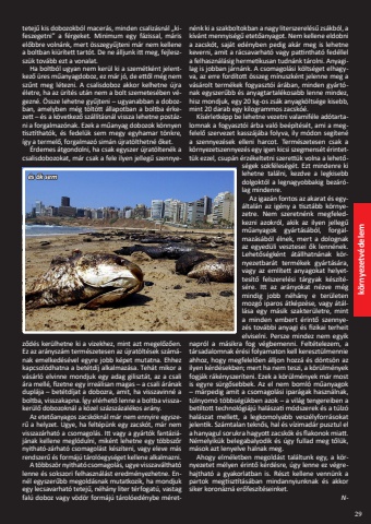29 k%u00f6rnyezetv%u00e9delemtetej%u0171 kis dobozokb%u00f3l macer%u00e1s, minden csaliz%u00e1sn%u00e1l %u201ekifeszegetni%u201d a f%u00e9rgeket. Minimum egy f%u00e1zissal, m%u00e1ris el%u0151bbre voln%u00e1nk, mert %u00f6sszegy%u0171jteni m%u00e1r nem kellene a boltban ki%u00fcr%u00edtett tart%u00f3t. De ne %u00e1lljunk itt meg, fejles -sz%u00fck tov%u00e1bb ezt a vonalat.Ha boltb%u00f3l ugyan nem ker%u00fcl ki a szem%u00e9tk%u00e9nt jelentkez%u0151 %u00fcres m%u0171anyagdoboz, ez m%u00e1r j%u00f3, de ett%u0151l m%u00e9g nem sz%u0171nt meg l%u00e9tezni. A csalisdoboz akkor kelhetne %u00fajra %u00e9letre, ha az %u00fcr%u00edt%u00e9s ut%u00e1n nem a bolt szemetes%u00e9ben v%u00e9gezn%u00e9. %u00d6ssze lehetne gy%u0171jteni %u2013 ugyanabban a dobozban, amelyben m%u00e9g t%u00f6lt%u00f6tt %u00e1llapotban a boltba %u00e9rkezett %u2013 %u00e9s a k%u00f6vetkez%u0151 sz%u00e1ll%u00edt%u00e1sn%u00e1l vissza lehetne post%u00e1zni a forgalmaz%u00f3nak. Ezek a m%u0171anyag dobozok k%u00f6nnyen tiszt%u00edthat%u00f3k, %u00e9s fedel%u00fck sem megy egyhamar t%u00f6nkre, %u00edgy a termel%u0151, forgalmaz%u00f3 sim%u00e1n %u00fajrat%u00f6lthetn%u00e9 %u0151ket.%u00c9rdemes %u00e1tgondolni, ha csak egyszer %u00fajrat%u00f6lten%u00e9k a csalisdobozokat, m%u00e1r csak a fele ilyen jelleg%u0171 szennyez%u0151d%u00e9s ker%u00fclhetne ki a vizekhez, mint azt megel%u0151z%u0151en. Ez az ar%u00e1nysz%u00e1m term%u00e9szetesen az %u00fajrat%u00f6lt%u00e9sek sz%u00e1m%u00e1nak emelked%u00e9s%u00e9vel egyre jobb k%u00e9pet mutatna. Ehhez kapcsol%u00f3dhatna a bet%u00e9td%u00edj alkalmaz%u00e1sa. Teh%u00e1t mikor a v%u00e1s%u00e1rl%u00f3 elvinne mondjuk egy adag giliszt%u00e1t, az a csali %u00e1ra mell%u00e9, fizetne egy irre%u00e1lisan magas %u2013 a csali %u00e1r%u00e1nak dupl%u00e1ja %u2013 bet%u00e9td%u00edjat a dobozra, amit, ha visszavinn%u00e9 a boltba, visszakapna. %u00cdgy el%u00e9rhet%u0151 lenne a boltba visszaker%u00fcl%u0151 dobozokn%u00e1l a k%u00f6zel sz%u00e1zsz%u00e1zal%u00e9kos ar%u00e1ny. Az etet%u0151anyagos zacsk%u00f3kn%u00e1l m%u00e1r nem ennyire egyszer%u0171 a helyzet. Ugye, ha felt%u00e9p%u00fcnk egy zacsk%u00f3t, m%u00e1r nem visszaz%u00e1rhat%u00f3 a csomagol%u00e1s. Itt vagy a gy%u00e1rt%u00f3k fant%u00e1zi%u00e1j%u00e1nak kellene megl%u00f3dulni, mik%u00e9nt lehetne egy t%u00f6bbsz%u0151r nyithat%u00f3-z%u00e1rhat%u00f3 csomagol%u00e1st k%u00e9sz%u00edteni, vagy eleve m%u00e1s rendszer%u0171 %u00e9s form%u00e1j%u00fa t%u00e1rol%u00f3egys%u00e9get kellene alkalmazni.A t%u00f6bbsz%u00f6r nyithat%u00f3 csomagol%u00e1s, ugye visszav%u00e1lthat%u00f3 lenne %u00e9s sokszori felhaszn%u00e1l%u00e1st eredm%u00e9nyezhetne. Enn%u00e9l egyszer%u0171bb megold%u00e1snak mutatkozik, ha mondjuk egy lecsavarhat%u00f3 tetej%u0171, n%u00e9h%u00e1ny liter t%u00e9rfogat%u00fa, vastag fal%u00fa doboz vagy v%u00f6d%u00f6r form%u00e1j%u00fa t%u00e1rol%u00f3ed%u00e9nybe m%u00e9retn%u00e9nk ki a szakboltokban a nagy literszerel%u00e9s%u0171 zs%u00e1kb%u00f3l, a k%u00edv%u00e1nt mennyis%u00e9g%u0171 etet%u0151anyagot. Nem kellene eldobni a zacsk%u00f3t, saj%u00e1t ed%u00e9nyben pedig ak%u00e1r meg is lehetne keverni, amit a r%u00e1csavarhat%u00f3 vagy pattinthat%u00f3 fed%u00e9llel a felhaszn%u00e1l%u00e1sig hermetikusan tudn%u00e1nk t%u00e1rolni. Anyagilag is jobban j%u00e1rn%u00e1nk. A csomagol%u00e1si k%u00f6lts%u00e9get elhagyva, az erre ford%u00edtott %u00f6sszeg m%u00ednuszk%u00e9nt jelenne meg a v%u00e1s%u00e1rolt term%u00e9kek fogyaszt%u00f3i %u00e1r%u00e1ban, minden gy%u00e1rt%u00f3nak egyszer%u0171bb %u00e9s anyagtartal%u00e9kosabb lenne mindez, hisz mondjuk, egy 20 kg-os zs%u00e1k anyagk%u00f6lts%u00e9ge kisebb, mint 20 darab egy kilogrammos zacsk%u00f3%u00e9. K%u00eds%u00e9rletk%u00e9pp be lehetne vezetni valamif%u00e9le ad%u00f3tartalomnak a fogyaszt%u00f3i %u00e1rba val%u00f3 be%u00e9p%u00edt%u00e9s%u00e9t, ami a megfelel%u0151 szervezet kassz%u00e1j%u00e1ba folyva, ily m%u00f3don seg%u00edten%u00e9 a szennyez%u00e9sek elleni harcot. Term%u00e9szetesen csak a k%u00f6rnyezetszennyez%u00e9s egy igen kicsi szegmens%u00e9t %u00e9rintett%u00fck ezzel, csup%u00e1n %u00e9rz%u00e9keltetni szerett%u00fck volna a lehet%u0151s%u00e9gek sokf%u00e9les%u00e9g%u00e9t. Ezt mindenre ki lehetne tal%u00e1lni, kezdve a legkisebb dolgokt%u00f3l a legnagyobbakig bez%u00e1r%u00f3lag mindenre.Az igaz%u00e1n fontos az akarat %u00e9s egy%u00e1ltal%u00e1n az ig%u00e9ny a tiszt%u00e1bb k%u00f6rnyezetre. Nem szeretn%u00e9nk megfeledkezni azokr%u00f3l, akik az ilyen jelleg%u0171 m%u0171anyagok gy%u00e1rt%u00e1s%u00e1b%u00f3l, forgalmaz%u00e1s%u00e1b%u00f3l %u00e9lnek, mert a dolognak az egyed%u00fcli vesztesei %u0151k lenn%u00e9nek. Lehet%u0151s%u00e9gk%u00e9nt %u00e1t%u00e1llhatn%u00e1nak k%u00f6rnyezetbar%u00e1t term%u00e9kek gy%u00e1rt%u00e1s%u00e1ra, vagy az eml%u00edtett anyagokat helyettes%u00edt%u0151 felszerel%u00e9si t%u00e1rgyak k%u00e9sz%u00edt%u00e9s%u00e9re. Itt az ar%u00e1nyokat n%u00e9zve m%u00e9g mindig jobb n%u00e9h%u00e1ny e ter%u00fcleten mozg%u00f3 iparos %u00e1tk%u00e9pz%u00e9se, vagy %u00e1t%u00e1ll%u00e1sa egy m%u00e1sik szakter%u00fcletre, mint a minden embert %u00e9rint%u0151 szennyez%u00e9s tov%u00e1bbi anyagi %u00e9s fizikai terheit elviselni. Persze mindez nem egyik napr%u00f3l a m%u00e1sikra fog v%u00e9gbemenni. Felt%u00e9telezem, a t%u00e1rsadalomnak %u00e9r%u00e9si folyamaton kell kereszt%u00fclmennie ahhoz, hogy megfelel%u0151en %u00e1lljon hozz%u00e1 %u00e9s d%u00f6nts%u00f6n az ilyen k%u00e9rd%u00e9sekben; mert ha nem teszi, a k%u00f6r%u00fclm%u00e9nyek fogj%u00e1k r%u00e1k%u00e9nyszer%u00edteni. Ezek a k%u00f6r%u00fclm%u00e9nyek m%u00e1r most is egyre s%u00fcrg%u0151sebbek. Az el nem boml%u00f3 m%u0171anyagok %u2013 m%u00e1rpedig amit a csomagol%u00e1si ipar%u00e1gak haszn%u00e1lnak, t%u00falnyom%u00f3 t%u00f6bbs%u00e9g%u00fckben azok %u2013 a vil%u00e1g tengereiben a betiltott technol%u00f3gi%u00e1j%u00fa hal%u00e1szati m%u00f3dszerek %u00e9s a t%u00falz%u00f3 hal%u00e1szat mellett, a legk