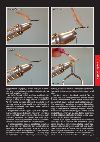 legyez%u0151horg%u00e1szat7legegyszer%u0171bb anyagb%u00f3l, a tollb%u00f3l k%u00e9sz%u00fcl, %u00e9s a kialak%u00edt%u00e1sa sem rejt mag%u00e1ban semmi bonyolults%u00e1got. De ez csak els%u0151 r%u00e1n%u00e9z%u00e9sre van %u00edgy.Az els%u0151 m%u0171legyek tollb%u00f3l k%u00e9sz%u00fcltek, legal%u00e1bb is t%u00f6rt%u00e9nelmi feljegyz%u00e9sek ezt eml%u00edtik, mint alapagyagot, amelyet a horog sz%u00e1r%u00e1n v%u00e9gig tekertek %u00e9s lek%u00f6t%u00f6tt%u00e9k. Az %u00f6tlet mind a mai napig sikeresnek mondhat%u00f3, mert rengeteg pisztr%u00e1ng %u00e9s domolyk%u00f3 nem tud ellen%u00e1llni a v%u00edztetej%u00e9n himb%u00e1l%u00f3dz%u00f3, vagy %u00e9ppen abban sodr%u00f3d%u00f3, herny%u00f3szer%u0171 valaminek.E l%u00e9gy csoport hat%u00e1rai nagyon t%u00e1gak. Nincs egy%u00e9rtelm%u0171 meghat%u00e1roz%u00e1suk, tal%u00e1n az%u00e9rt nem, mert egym%u00e1st%u00f3l f%u00fcggetlen%u00fcl t%u00f6bb helyen is megjelentek, %u00e9s nincs olyan k%u00f6vethet%u0151 fejl%u0151d%u00e9s%u00fck, mint p%u00e9ld%u00e1ul a l%u00e1rv%u00e1kat ut%u00e1nz%u00f3 legyeknek, amelyek %u00fajabb mint%u00e1i mind visszavezethet%u0151k Frank Sawyer els%u0151 Pheasant Tail nev%u0171 legy%u00e9ig.A legegyszer%u0171bbek csak egy sz%u00edn%u0171 tollb%u00f3l k%u00e9sz%u00fclnek, de vannak k%u00e9t- vagy h%u00e1romf%u00e9le sz%u00edn %u00f6sszet%u00e9tel%u0171ek is. N%u00e9ha egy kis kieg%u00e9sz%u00edt%u0151 anyag, %u00e1ltal%u00e1ban f%u00e9msz%u00e1l is megjelenhet rajtuk. Alaplegyek mind sz%u00e1raz, mind pedig nedves v%u00e1ltozatban k%u00e9sz%u00edthet%u0151k. Az igazs%u00e1g, hogy az eredend%u0151en nedves v%u00e1ltozat is j%u00f3l %u00faszik az els%u0151 p%u00e1r dob%u00e1sig, %u00e9s a sz%u00e1raz v%u00e1ltozat is k%u00f6nnyen s%u00fcllyed%u0151v%u00e9 v%u00e1lhat, vagyis gyakran neh%u00e9z eld%u00f6nteni hol a hat%u00e1r a kett%u0151 k%u00f6zt.Legink%u00e1bb palmersz legyeknek mondjuk %u0151ket, de igaz%u00e1b%u00f3l nem csak azokra gondolunk, amelyek val%u00f3ban e n%u00e9ven vannak sz%u00e1mon tartva, hanem minden olyan sz%u00e1rnyn%u00e9lk%u00fcli l%u00e9gyre. Ezeknek kialak%u00edt%u00e1s%u00e1ban csak egyf%u00e9le mad%u00e1rtollat haszn%u00e1lunk, az esetek t%u00f6bbs%u00e9g%u00e9ben kakas nyaktollakat, amelyeket a horog sz%u00e1r%u00e1n tekerj%u00fck v%u00e9gig. A csoport fontos jellemz%u0151je, hogy test nincs k%u00fcl%u00f6n kialak%u00edtva. %u00cdgy az ezekhez nagyon hasonl%u00f3, Grifith%u2019s Gnat p%u00e9ld%u00e1ul nem tartozik ide, de a Badger Spider sem, mert ez ut%u00f3bbinak a tollteste nem halad v%u00e9gig a horogsz%u00e1ron, csak annak els%u0151 fel%u00e9n tal%u00e1lhat%u00f3.Vannak olyan legyek, amelyeknek van valamilyen testalapjuk, de a palmerek k%u00f6z%u00e9 sorol%u00f3dnak. Ilyen a Soldier %u00e9s n%u00e9h%u00e1ny n%u00e9met minta, ahol az eredeti alapk%u00f6t%u00e9sre vastagabb c%u00e9rna test ker%u00fcl. Ezek m%u00e9g belef%u00e9rnek a csoportba, de az %u00c9szak-Amerikai Soldier %u00e9s Behm v%u00e1ltozatok javar%u00e9sze szerintem m%u00e1r nem, mert ezekn%u00e9l a tollon, c%u00e9rn%u00e1n %u00e9s f%u00e9msz%u00e1lon k%u00edv%u00fcl haszn%u00e1lnak m%u0171sz%u00e1lakat is a test %u00e9s a farok k%u00e9sz%u00edt%u00e9s%u00e9hez. (Mint ahogy a Hagyom%u00e1nyosan El%u00f6lr%u0151l h%u00e1traFord%u00edtvaBorzol%u00e1s