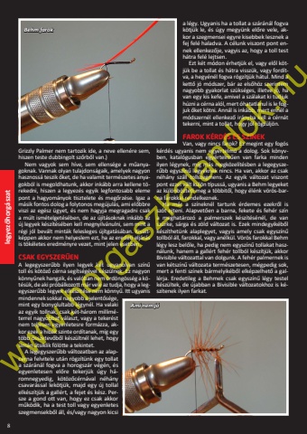 legyez%u0151horg%u00e1szat8Grizzly Palmer nem tartozik ide, a neve ellen%u00e9re sem, hiszen teste dubbingolt sz%u0151rb%u0151l van.)Nem vagyok sem h%u00edve, sem ellens%u00e9ge a m%u0171anyagoknak. Vannak olyan tulajdons%u00e1gaik, amelyek nagyon hasznoss%u00e1 teszik %u0151ket, de ha valamit term%u00e9szetes anyagokb%u00f3l is megoldhatunk, akkor ink%u00e1bb arra kellene t%u00f6rekedni, hiszen a legyez%u00e9s egyik legfontosabb eleme pont a hagyom%u00e1nyok tisztelete %u00e9s meg%u0151rz%u00e9se. Igaz a m%u00e1sik fontos dolog a folytonos meg%u00fajul%u00e1s, ami el%u0151bbre viszi az eg%u00e9sz %u00fcgyet, %u00e9s nem hagyja megragadni csak a m%u00falt ism%u00e9telget%u00e9s%u00e9ben, de az %u00faj%u00edt%u00e1soknak ink%u00e1bb az %u00faj legyek k%u00e9sz%u00edt%u00e9s%u00e9ben kell megnyilv%u00e1nulni, sem mint a r%u00e9gi j%u00f3l bev%u00e1lt mint%u00e1k felesleges %u00faj%u00edtgat%u00e1s%u00e1ban. Kiv%u00e1ltk%u00e9ppen akkor nem helyeslem ezt, ha az eredeti elj%u00e1r%u00e1s is t%u00f6k%u00e9letes eredm%u00e9nyre vezet, mint jelen esetben.CSAK EGYSZER%u0170ENA legegyszer%u0171bb ilyen legyek k%u00e9t ugyanolyan sz%u00edn%u0171 toll %u00e9s k%u00f6t%u00f6z%u0151 c%u00e9rna seg%u00edts%u00e9g%u00e9vel k%u00e9sz%u00fclnek. Ez nagyon k%u00f6nny%u0171nek hangzik, %u00e9s val%u00f3ban nem %u00f6rd%u00f6ng%u00f6ss%u00e9g a k%u00f6t%u00e9s%u00fck, de aki pr%u00f3b%u00e1lkozott m%u00e1r vele az tudja, hogy a legegyszer%u0171bb legyek elk%u00e9sz%u00edt%u00e9se nem k%u00f6nny%u0171. Itt ugyanis mindennek sokkal nagyobb a jelent%u0151s%u00e9ge, mint egy bonyolultabb l%u00e9gyn%u00e9l. Ha valaki az egyik tollnak, csak k%u00e9t-h%u00e1rom millim%u00e9terrel nagyobbat v%u00e1laszt, vagy a teker%u00e9st nem teljesen egyenletesre form%u00e1zza, akkor ezek a hib%u00e1k szinte ord%u00edtanak, m%u00edg egy t%u00f6bb %u00f6sszetev%u0151b%u0151l k%u00e9sz%u00fcltn%u00e9l lehet, hogy sim%u00e1n %u00e1tsiklik f%u00f6l%u00f6tte a tekintet.A legegyszer%u0171bb v%u00e1ltozatban az alapc%u00e9rna felvitele ut%u00e1n r%u00f6gz%u00edt%u00fcnk egy tollat a sz%u00e1r%u00e1n%u00e1l fogva a horogsz%u00e1r v%u00e9g%u00e9n, %u00e9s egyenletesen el%u0151re tekerj%u00fck %u00fagy h%u00e1romnegyedig, k%u00f6t%u00f6z%u0151c%u00e9rn%u00e1val n%u00e9h%u00e1ny csavar%u00e1ssal lek%u00f6tj%u00fck, majd egy %u00faj tollal elk%u00e9sz%u00edtj%u00fck a gall%u00e9rt, a fejet %u00e9s k%u00e9sz. Persze a gond ott van, hogy ez csak akkor m%u0171k%u00f6dik, ha a test toll vagy egyenletes szegmensekb%u0151l %u00e1ll, %u00e9s/vagy nagyon kicsi a l%u00e9gy. Ugyanis ha a tollat a sz%u00e1r%u00e1n%u00e1l fogva k%u00f6tj%u00fck le, %u00e9s %u00fagy megy%u00fcnk el%u0151re vele, akkor a szegmensei egyre kisebbek lesznek a fej fel%u00e9 haladva. A c%u00e9lunk viszont pont ennek ellenkez%u0151je, vagyis az, hogy a toll test h%u00e1tra fel%u00e9 lejtsen.Ezt k%u00e9t m%u00f3don %u00e9rhetj%u00fck el, vagy el%u0151l k%u00f6tj%u00fck be a tollat %u00e9s h%u00e1tra vissz%u00fck, vagy ford%u00edtva, a hegy%u00e9n%u00e9l fogva r%u00f6gz%u00edtj%u00fck h%u00e1tul. Mind a kett%u0151 j%u00f3 m%u00f3dszer, b%u00e1r az els%u0151h%u00f6z szerintem nagyobb gyakorlat sz%u00fcks%u00e9ges, illetve j%u00f3, ha van egy kis kefe, amivel a sz%u00e1lakat ki tudjuk h%u00fazni a c%u00e9rna al%u00f3l, mert %u00f3hatatlanul is le fogjuk %u0151ket k%u00f6tni. Ann%u00e1l is ink%u00e1bb, mert enn%u00e9l a m%u00f3dszern%u00e9l ellenkez%u0151 ir%u00e1nyba kell a c%u00e9rn%u00e1t tekerni, mint a tollat, hogy j%u00f3l r%u00f6gz%u00fclj%u00f6n.FAROK K%u00c9RD%u00c9S %u00c9S SZ%u00cdNEKVan, vagy nincs farok? Ez megint egy fog%u00f3s k%u00e9rd%u00e9s ugyanis nem egy%u00e9rtelm%u0171 a dolog. Sok k%u00f6nyvben, katal%u00f3gusban egy%u00e9rtelm%u0171en van farka minden ilyen l%u00e9gynek, m%u00edg m%u00e1s megk%u00f6zel%u00edt%u00e9sben a legegyszer%u0171bb egysz%u00edn%u0171 legyeknek nincs. Ha van, akkor az csak n%u00e9h%u00e1ny sz%u00e1ll tollszegmens. Az egyik v%u00e1ltozat viszont pont ezzel v%u00e1lt k%u00fcl%u00f6n t%u00edpuss%u00e1, ugyanis a Behm legyeket az k%u00fcl%u00f6nb%u00f6zteti meg a t%u00f6bbit%u0151l, hogy %u00e9l%u00e9nk v%u00f6r%u00f6s-barna farokkal rendelkeznek. Ha m%u00e1r a sz%u00ednekn%u00e9l tartunk %u00e9rdemes ezekr%u0151l is sz%u00f3t ejteni. Alapvet%u0151en a barna, fekete %u00e9s feh%u00e9r sz%u00edn a meghat%u00e1roz%u00f3 a palmerszek k%u00e9sz%u00edt%u00e9s%u00e9n%u00e9l, de van sz%u00fcrke, s%u00e1rga %u00e9s z%u00f6ld v%u00e1ltozat is. Ezek mindegyik%u00e9b%u0151l k%u00e9sz%u00edthet%u00fcnk alaplegyet, vagyis amely csak egysz%u00edn%u0171 tollb%u00f3l %u00e1ll, farokkal, vagy an%u00e9lk%u00fcl. V%u00f6r%u00f6s farokkal Behm l%u00e9gy lesz bel%u0151le, ha pedig nem egysz%u00edn%u0171 tollakat haszn%u00e1lunk, hanem a gall%u00e9rt feh%u00e9r tollb%u00f3l k%u00e9sz%u00edtj%u00fck, akkor Bivisible v%u00e1ltozattal van dolgunk. A feh%u00e9r palmernek is van k%u00e9tsz%u00edn%u0171 v%u00e1ltozata term%u00e9szetesen, m%u00e9gpedig sok, mert a fenti sz%u00ednek b%u00e1rmelyik%u00e9b%u0151l elk%u00e9pzelhet%u0151 a gall%u00e9rja. Eredetileg a Behmek csak egysz%u00edn%u0171 l%u00e9gy testel k%u00e9sz%u00fcltek, de %u00fajabban a Bivisible v%u00e1ltozatokhoz is k%u00e9sz%u00edtenek ilyen farkat.Behm farokAmi nem j%u00f3www.horgaszkalandok.hu