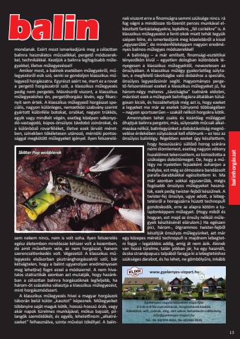 balinhorg%u00e1szat13Gy%u00e9k%u00e9nyesi nagyt%u00f3 k%u00f6zvetlen v%u00edzpartj%u00e1n2-3 %u00e9s 6-8 f%u0151s nyaral%u00f3h%u00e1zak, horg%u00e1szh%u00e1zak kiad%u00f3k.K%u00e1belt%u00e9v%u00e9, wifi, cs%u00f3nak, st%u00e9g, z%u00e1rt udvar, kutyabar%u00e1t sz%u00e1ll%u00e1shely.info@gyekenyes-vizpart.huTel.: 06-20/370-8851, 06-30/484-9535 www.gyekenyes-vizpart.humondanak. Ez%u00e9rt most ismerkedj%u00fcnk meg a c%u00e9lzottan balinra haszn%u00e1latos m%u0171csalikkal, perget%u0151 m%u00f3dszerekkel, technik%u00e1kkal. Kezdj%u00fck a balinra legfog%u00f3sabb m%u0171legyekkel, illetve m%u0171legyez%u00e9ssel!Amikor most, a balinok eset%u00e9ben m%u0171legyekr%u0151l, m%u0171legyez%u00e9sr%u0151l esik sz%u00f3, senki se gondoljon klasszikus m%u0171legyez%u0151 horg%u00e1szatra. Egyr%u00e9szt az%u00e9rt ne, mert ez a rovat a perget%u0151 horg%u00e1szatr%u00f3l sz%u00f3l, a klasszikus m%u0171legyez%u00e9s pedig nem perget%u00e9s. M%u00e1sr%u00e9szr%u0151l viszont, a klasszikus m%u0171legyez%u00e9shez %u00e9n, perget%u0151horg%u00e1sz l%u00e9v%u00e9n, egy fikarcnyit sem %u00e9rtek. A klasszikus m%u0171legyez%u0151 horg%u00e1szat speci%u00e1lis, nagyon k%u00fcl%u00f6nleges, nemzetk%u00f6zi szabv%u00e1ny szerint gy%u00e1rtott k%u00fcl%u00f6nf%u00e9le botokat, ors%u00f3kat, nagyon tr%u00fckk%u00f6s, egyik vagy mindk%u00e9t v%u00e9g%u00e9n, esetleg k%u00f6z%u00e9pen v%u00e9konyod%u00f3-vastagod%u00f3, k%u00fapos-%u00f6ns%u00falyos t%u00e1vdob%u00f3 zsin%u00f3rokat, %u00e9s a k%u00fcl%u00f6nb%u00f6z%u0151 rovarf%u00e9l%u00e9ket, illetve ezek l%u00e1rv%u00e1it m%u00e9retben, sz%u00ednekben t%u00f6k%u00e9letesen ut%u00e1noz%u00f3, m%u00e9rn%u00f6ki pontoss%u00e1ggal megk%u00f6t%u00f6tt m%u0171legyeket ig%u00e9nyel. Ilyen felszerel%u00e9sem nekem nincs, nem is volt soha. Ilyen felszerel%u00e9s eg%u00e9sz %u00e9letemben mind%u00f6ssze k%u00e9tszer volt a kezemben, de amit m%u0171veltem vele, az nem horg%u00e1szat, hanem szerencs%u00e9tlenked%u00e9s volt. V%u00e9gezet%u00fcl: A klasszikus m%u0171legyez%u00e9s els%u0151sorban pisztr%u00e1nghorg%u00e1szatr%u00f3l sz%u00f3l, b%u00e1r k%u00e9ts%u00e9gtelen, hogy a balint ugyanolyan eredm%u00e9nyesen meg lehet(ne) fogni ezzel a m%u00f3dszerrel. A nem hivatalos statisztik%u00e1k azonban azt mutatj%u00e1k, hogy haz%u00e1nkban a c%u00e9lzottan balinra horg%u00e1sz%u00f3knak legfeljebb, ha h%u00e1rom-%u00f6t sz%u00e1zal%u00e9ka v%u00e1lasztja a klasszikus m%u0171legyez%u00e9st, mint horg%u00e1szm%u00f3dszert. A klasszikus m%u0171legyez%u00e9s h%u00edvei a magyar horg%u00e1szok t%u00e1bor%u00e1n bel%u00fcl k%u00fcl%u00f6n %u201ekasztot%u201d k%u00e9peznek. M%u0171legyeiket t%u00f6bbnyire saj%u00e1t maguk k%u00f6tik, hossz%u00fa-hossz%u00fa %u00f3r%u00e1k, vagy ak%u00e1r napok t%u00fcrelmes munk%u00e1j%u00e1val, m%u00f3kus bajsz%u00e1t, pillang%u00f3k szem%u00f6ld%u00f6k%u00e9t, %u00e9s egy%u00e9b, leheletfinom %u201ealkatr%u00e9szeket%u201d felhaszn%u00e1lva, szinte m%u0171v%u00e9szi t%u00f6k%u00e9llyel. A balinnak viszont erre a finoms%u00e1gra semmi sz%u00fcks%u00e9ge nincs: r%u00e1 fog v%u00e1gni a mind%u00f6ssze t%u00edz-tizen%u00f6t perces munk%u00e1val elk%u00e9sz%u00edtett fant%u00e1zialegyekre, lepk%u00e9kre, %u201ef%u00e9l csirk%u00e9kre%u201d is. A klasszikus m%u0171legyez%u00e9st a fenti okok miatt teh%u00e1t tegy%u00fck sz%u00e9pen f%u00e9lre, %u00e9s ismerkedj%u00fcnk meg k%u00f6zelebbr%u0151l a kiss%u00e9 %u201eegyszer%u0171bb%u201d, de mindenf%u00e9lek%u00e9ppen nagyon eredm%u00e9nyes balinos-m%u0171legyes m%u00f3dszerekkel!A balinl%u00e9gy %u2013 a m%u00e1r eml%u00edtett, finoms%u00e1gi-eszt%u00e9tikai t%u00e9nyez%u0151k%u00f6n k%u00edv%u00fcl %u2013 egyetlen dologban k%u00fcl%u00f6nb%u00f6zik l%u00e9nyegesen a klasszikus m%u0171legyekt%u0151l, nevezetesen az %u00f6ns%u00faly%u00e1ban. A klasszikus m%u0171l%u00e9gy gyakorlatilag s%u00falytalan, a megfelel%u0151 t%u00e1vols%u00e1gba val%u00f3 dob%u00e1shoz a speci%u00e1lis, %u00f6ns%u00falyos legyez%u0151zsin%u00f3r seg%u00edti. Hagyom%u00e1nyos perget%u0151-felszerel%u00e9ssel ezeket a klasszikus m%u0171legyeket j%u00f3, ha h%u00e1rom-n%u00e9gy m%u00e9teres %u201et%u00e1vols%u00e1gba%u201d tudn%u00e1nk eldobni, m%u00e1sr%u00e9szt ezek a m%u0171legyek balinfog%u00e1sra %u00e1ltal%u00e1ban t%u00fals%u00e1gosan kicsik, %u00e9s hozz%u00e1tehetj%u00fck m%u00e9g azt is, hogy ezeket a legyeket ma m%u00e1r az esetek t%u00falnyom%u00f3 t%u00f6bbs%u00e9g%u00e9ben %u2013 nagyon sportszer%u0171en %u2013 szak%u00e1ll n%u00e9lk%u00fcli horgokra k%u00f6tik.Amennyiben teh%u00e1t csakis %u00e9s kiz%u00e1r%u00f3lag m%u0171l%u00e9ggyel%u00f3hajtjuk balinra pergetni, m%u00e1s, s%u00falyosabb m%u0171csali alkalmaz%u00e1sa n%u00e9lk%u00fcl, balinlegy%u00fcnket a dob%u00e1st%u00e1vols%u00e1g megn%u00f6vel%u00e9se %u00e9rdek%u00e9ben s%u00falyoz%u00e1ssal kell ell%u00e1tnunk %u2013 ez lesz az %u00f6ns%u00falyos balinl%u00e9gy. R%u00e9gebben ezeket %u00fagy k%u00e9sz%u00edtettem, hogy hossz%u00fasz%u00e1r%u00fa s%u00fcll%u0151z%u0151 horog sz%u00e1r%u00e1ra n%u00e9mi %u00f3lomlemezt, esetleg nagyon v%u00e9kony huzal%u00f3lmot tekercseltem, ez biztos%u00edtotta a sz%u00fcks%u00e9ges dob%u00f3t%u00f6meget. De, hogy a m%u0171l%u00e9gy ne nyeletlen fejszek%u00e9nt zuhanjon a m%u00e9lybe, ezt m%u00e9g az %u00f3lmoz%u00e1sra band%u00e1zsolt parafa-darabk%u00e1kkal eg%u00e9sz%u00edtettem ki. Ma m%u00e1r azonban sokkal egyszer%u0171bb, m%u00e9gis fog%u00f3sabb %u00f6ns%u00falyos m%u0171legyeket haszn%u00e1lok, ezek pedig twister-fejb%u0151l k%u00e9sz%u00fclnek. A twister-fej %u00f6ns%u00falya, ugye adott, a lebegtet%u00e9sr%u0151l a horogsz%u00e1rra h%u00fazott technopufi gondoskodik, erre az alapra k%u00f6t%u00f6m a tulajdonk%u00e9ppeni m%u0171legyet. (Hogy mib%u0151l %u00e9s hogyan, ezt majd az %u00f6ns%u00faly n%u00e9lk%u00fcli m%u0171legyek k%u00e9sz%u00edt%u00e9s%u00e9n%u00e9l el%u00e1rulom.) Ha eg%u00e9szen pici, h%u00e1rom-, %u00f6tgrammos twister-fejb%u0151l k%u00e9sz%u00edtj%u00fck %u00f6ns%u00falyos m%u0171legy%u00