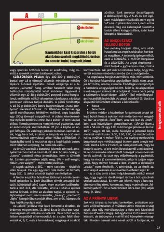 horg%u00e1szeszk%u00f6z%u00f6k 23vagy spont%u00e1n bott%u00f6r%u00e9s lenne az eredm%u00e9ny, m%u00e9g miel%u0151tt a szerel%u00e9k a v%u00edzzel tal%u00e1lkozott volna. SZ%u00c9LS%u0150S%u00c9GES P%u00c9LDA: Egy 100-300 g dob%u00f3s%u00faly%u00fa bottal egy 18 g t%u00f6meg%u0171 villant%u00f3t mind%u00f6ssze n%u00e9h%u00e1ny l%u00e9p%u00e9sre tudn%u00e1nk eljuttatni. Ennek velej%u00e1r%u00f3ja az a bizonyos %u201esuhant%u00f3%u201d hang, amihez hasonl%u00f3t tal%u00e1n m%u00e9g helikopter rotorlap%u00e1ttal lehet el%u0151id%u00e9zni. Ugyanezt a villant%u00f3t egy 10-30 g dob%u00f3s%u00faly%u00fa perget%u0151 bottal hangtalanul, er%u0151lk%u00f6d%u00e9s n%u00e9lk%u00fcl tekint%u00e9lyes t%u00e1vols%u00e1gra, r%u00e1ad%u00e1sul pontosan c%u00e9lozva tudjuk dob%u00e1lni. A p%u00e9lda ford%u00edtottja: A 10-30 g dob%u00f3s%u00faly%u00fa botra hagyom%u00e1nyos %u201ehazai pontyoz%u00f3%u201d szerel%u00e9st k%u00f6t%u00fcnk%u2026 Ez %u00e1ltal%u00e1ban tartalmaz egy spir%u00e1l etet%u0151kosarat f%u00e9l%u00f6k%u00f6lnyi m%u00e1l%u00e9val, vagy legal%u00e1bb egy 100 g t%u00f6meg%u0171 csepp%u00f3lmot. A dob%u00e1s k%u00f6vetkezm%u00e9nye nyilv%u00e1n bott%u00f6r%u00e9s lenne, ha a zsin%u00f3r el nem szakad el%u0151tte. Term%u00e9szetesen ez nem jellemz%u0151 gyakorlat, csak az er%u0151viszonyok szeml%u00e9ltet%u00e9se. Itt j%u00f6n a k%u00e9pbe az angol felfog%u00e1s. %u0150k valahogy jobban tiszt%u00e1ban vannak azzal, hogy ha a bot, a zsin%u00f3r, a s%u00falyoz%u00e1s %u00e9s az ors%u00f3 nem harmoniz%u00e1lnak egym%u00e1ssal, akkor hi%u00e1ba er%u0151lk%u00f6d%u00fcnk. A legdr%u00e1g%u00e1bb ors%u00f3 is mutathat %u00fagy a legdr%u00e1g%u00e1bb boton, mint teh%u00e9nen a nyereg, ha nem oda val%u00f3%u2026Az %u00f6ns%u00faly azokn%u00e1l a botokn%u00e1l jelent%u0151s t%u00e9nyez%u0151, amelyeket k%u00e9zben tartva haszn%u00e1lunk ak%u00e1r hossz%u00fa %u00f3r%u00e1kig is. %u201eLetett%u201d botokn%u00e1l nincs jelent%u0151s%u00e9ge, nem is t%u0171ntetik fel. Szint%u00e9n grammban adj%u00e1k meg, SW %u2013 self weight, ritk%u00e1n %u201enet weight%u201d %u2013 mint netto jelz%u00e9ssel.A tagok sz%u00e1m%u00e1t a SEC. %u2013 mint sections %u2013 r%u00f6vid%u00edt%u00e9s ut%u00e1n tal%u00e1ljuk. Ha egy egyszer%u0171 tele boton az l%u00e1that%u00f3, hogy SEC.: 5, akkor a bot %u00f6t tagb%u00f3l van fel%u00e9p%u00edtve. A feeder %u00e9s picker botokhoz t%u00f6bbnyire adnak cser%u00e9lhet%u0151 spicceket is. Ezek %u00e1ltal%u00e1ban t%u00f6m%u00f6r anyagb%u00f3l k%u00e9sz%u00fclt, k%u00fcl%u00f6nb%u00f6z%u0151 sz%u00edn%u0171 tagok. Ilyen esetben tal%u00e1lkozhatunk a 3+2, 2+3, stb. felirattal, ahol a + ut%u00e1n a spiccek sz%u00e1ma l%u00e1that%u00f3, el%u0151tte az alapbot tagjai. A spiccek tulajdons%u00e1gait nem sz%u00e1mszer%u0171s%u00edtik, %u201eheavy%u201d, %u201emedium%u201d, %u201elight%u201d kateg%u00f3ri%u00e1ba sorolj%u00e1k %u0151ket, ami er%u0151s, k%u00f6zepes %u00e9s l%u00e1gy hajl%u00e9konys%u00e1gra utal. Az %u201eakci%u00f3%u201d jel%u00f6l%u00e9se m%u00e1r kezd kimenni a divatb%u00f3l, de %u00e9rdemes megeml%u00edteni. (2. %u00e1bra) Ez az %u00e9rt%u00e9k a bot rugalmass%u00e1g%u00e1nak eloszl%u00e1s%u00e1ra vonatkozik. Ha a botot k%u00e9pzeletben nagyj%u00e1b%u00f3l elharmadoljuk %u00e9s a spicc fel%u0151l elnevezz%u00fck A, B, C, -nek a harmadokat, megkapjuk az akci%u00f3 z%u00f3n%u00e1kat. Ezek szorosan %u00f6sszef%u00fcggnek a dob%u00f3s%u00fallyal! Egy A 5-15-%u00f6s bot eg%u00e9szen m%u00e1sk%u00e9ppen viselkedik, mint egy B 5-15-%u00f6s. C jelz%u00e9s%u0171 bot nincs, nem volna %u00e9sszer%u0171. El%u00e9g sok kalamajk%u00e1t okozott a botok eff%u00e9le kategoriz%u00e1l%u00e1sa, ez%u00e9rt kezd kikopni a k%u00f6ztudatb%u00f3l. AZ ANGOLSZ%u00c1SZJELLEG%u0170 BOTOK Van n%u00e9h%u00e1ny horg%u00e1sz st%u00edlus, ami vitathatatlanul az angol szok%u00e1sokat hordozza mag%u00e1ban. A teljess%u00e9g ig%u00e9nye n%u00e9lk%u00fcl, ezek a BOJLIZ%u00c1S, a MATCH horg%u00e1szat %u00e9s a LEGYEZ%u00c9S. Az angol %u00e9rt%u00e9krend %u2013 mint tudjuk %u2013 gy%u00f6keresen m%u00e1s, mint a kontinent%u00e1lis. Aki j%u00e1rt m%u00e1r Londonban tudja, hogy Dovert%u0151l %u00e9szakra mindenki szembe j%u00f6n az aut%u00f3p%u00e1ly%u00e1n%u2026Az angolsz%u00e1sz horg%u00e1sz szeml%u00e9lete m%u00e1s, mint a mienk. %u0150k a horg%u00e1sz felszerel%u00e9st egys%u00e9g%u00e9ben l%u00e1tj%u00e1k, nem %u201eosztj%u00e1k le%u201d botra, ors%u00f3ra, zsin%u00f3rra. Els%u0151dleges szempontjuk a harm%u00f3nia az egys%u00e9gek k%u00f6z%u00f6tt. Ez%u00e9rt is, de alapvet%u0151en is m%u00e1sk%u00e9ppen sz%u00e1mozz%u00e1k a botjaikat. Erre a c%u00e9lra pedig a sz%u00e1munkra kiss%u00e9 idegen %u201eLIBRA%u201d (lbs) m%u00e9rt%u00e9kegys%u00e9get haszn%u00e1lj%u00e1k legink%u00e1bb. Az angol botokn%u00e1l (3. %u00e1bra) az alapvet%u0151 felt%u0171ntetett %u00e9rt%u00e9kek a k%u00f6vetkez%u0151k:%u2022 hossz%u2022 teherb%u00edr%u00e1s%u00c9rdekes m%u00f3don a haz%u00e1nkban forgalmazott angol jelleg%u0171 botok hossza sokszor m%u00e1r m%u00e9terben van megadva, b%u00e1r az angolok %u201efeet%u201d-ben, azaz l%u00e1b-ban %u00e9s %u201einch%u201d-ben, azaz h%u00fcvelykben gondolkodnak. (1ft=30.48cm,1 inch 2.54 cm. Pl. egy 3.05 m bot angol jelz%u00e9se ez lenne: 10%u20190%u201d, vagyis 10 l%u00e1b, nulla h%u00fcvelyk) A jellemz%u0151 bojlis m%u00e9retek metrikusan: 3.00, 3.60, 3.90, de match botokn%u00e1l ez ny%u00falhat 4 m%u00e9ter f%u00f6l%u00e9 is. Ha esetleg nekiesn%u00e9nk botunknak egy m%u00e9r%u0151szalaggal %u00e9s nem pont annyit m%u00e9r%u00fcnk, mint a botra %u00edrt sz%u00e1m, az nem jelenti azt, hogy be lett%u00fcnk csapva. A brit m%u00e9rt%u00e9krendszerr%u0151l a mi decim%u00e1lis rendszer%u00fcnkbe %u00e1tsz%u00e1m%u00edtott %u00f6sszegek sosem lesznek kerek sz%u00e1mok. Ez csak egy el%u0151z%u00e9kenys%u00e9g a gy%u00e1rt%u00f3t%u00f3l, hogy ha nincs j%u00f3 szemm%u00e9rt%u00e9k%u00fcnk, akkor is tudjuk nagyj%u00e1b%u00f3l, hogy milyen hossz%u00fa a bot. Viszont a dob%u00f3s%u00falyt %