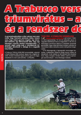 damil.hu4A versenyhorg%u00e1szatban a siker sokszor nem azon m%u00falik, hogy mennyire pontosan dobsz, hanem azon, hogy milyen gyorsan reag%u00e1lsz. Egy elmoz- dult bottart%u00f3, egy f%u00e9lrecs%u00faszott l%u00e1da, vagy egy felesleges csavar%u00e1s elvehet m%u00e1sodperceket %u2013 a verseny v%u00e9g%u00e9n pedig ezek a m%u00e1sodpercek k%u00fc- l%u00f6nbs%u00e9get jelentenek a dobog%u00f3 %u00e9s a negyedik hely k%u00f6z%u00f6tt.A Trabucco TX36 %u00e9s HX36 PRO versenyl%u00e1d%u00e1k, valamint a Quick Release (QR) rendszer %u00e9ppen ezt a logik%u00e1t k%u00f6vetik: minden mozdulat legyen prec%u00edz, gyors %u00e9s megism%u00e9telhet%u0151. Ez nem csak technika %u2013 ez filoz%u00f3fia.TX36 PRO %u2013 A STABILIT%u00c1S SZIMB%u00d3LUMAA Trabucco Match TX36 PRO a j%u00f3l ismert T-Match X36 %u00faj gener%u00e1ci%u00f3ja, 7,5 cm-rel sz%u00e9lesebb v%u00e1zzal %u00e9s nagyobb stabilit%u00e1ssal mint az megszokott. A 36 mm-es teleszk%u00f3pos alum%u00ednium l%u00e1bak %u00e9s a be%u00e9p%u00edtett v%u00edzm%u00e9rt%u00e9k garant%u00e1lj%u00e1k, hogy a l%u00e1da b%u00e1rmilyen terepen szil%u00e1rdan %u00e9s v%u00edzszintesen %u00e1lljon, biztos%u00edtva ezzel a k%u00e9nyelmes horg%u00e1szatot.A fix %u00fcl%u00e9smagass%u00e1g a legnagyobb merevs%u00e9get biztos%u00edtja, a g%u00e9lbet%u00e9tes %u00fcl%u0151p%u00e1rna pedig hossz%u00fa %u00f3r%u00e1kon %u00e1t k%u00e9nyelmes. A k%u00e9t oldals%u00f3 %u00e9s k%u00e9t felny%u00edl%u00f3 fi%u00f3k lehet%u0151v%u00e9 teszi, hogy a horg%u00e1sz minden el%u0151k%u00e9t, csalit %u00e9s apr%u00f3s%u00e1got azonnal el%u00e9rjen %u2013 nincs felesleges matat%u00e1s.A Trabucco verstriumvir%u00e1tus %u2013 a%u00e9s a rendszer d%u00f6