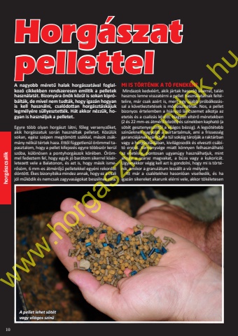 10horg%u00e1szcsalikA nagyobb m%u00e9ret%u0171 halak horg%u00e1szat%u00e1val foglal- koz%u00f3 cikkekben rendszeresen eml%u00edtik a pelletek haszn%u00e1lat%u00e1t. Bizony%u00e1ra %u00f6n%u00f6k k%u00f6z%u00fcl is sokan kipr%u00f3- b%u00e1lt%u00e1k, de mivel nem tudt%u00e1k, hogy igaz%u00e1n hogyan is kell haszn%u00e1lni, csal%u00f3dottan horg%u00e1szt%u00e1sk%u00e1juk legm%u00e9ly%u00e9re s%u00fcllyesztett%u00e9k. H%u00e1t akkor n%u00e9zz%u00fck, ho- gyan is haszn%u00e1ljuk a pelletet.Egyre t%u00f6bb olyan horg%u00e1szt l%u00e1tni, f%u0151leg versenyz%u0151ket, akik horg%u00e1szatuk sor%u00e1n haszn%u00e1ltak pelletet. K%u00f6z%u00fcl%u00fck sokan, eg%u00e9sz sz%u00e9pen megt%u00f6m%u00f6tt sz%u00e1kkal, m%u00e1sok zs%u00e1km%u00e1ny n%u00e9lk%u00fcl t%u00e9rtek haza. Ett%u0151l f%u00fcggetlen%u00fcl %u00f6r%u00f6mmel tapasztalom, hogy a pellet kifejez%u00e9s egyre t%u00f6bbsz%u00f6r ker%u00fcl sz%u00f3ba, k%u00fcl%u00f6n%u00f6sen a pontyhorg%u00e1szok k%u00f6r%u00e9ben. %u00d6r%u00f6mmel fedeztem fel, hogy egyik j%u00f3 bar%u00e1tom sikerrel k%u00eds%u00e9rletezett vele a Balatonon, %u00e9s azt is, hogy m%u00e1sik ismer%u0151s%u00f6m, 6 mm-es %u00e1tm%u00e9r%u0151j%u0171 pelletekkel egy%u00e9ni rekordot d%u00f6nt%u00f6tt. %u00c9kes bizony%u00edt%u00e9ka mindez annak, hogy ez a csali j%u00f3l m%u0171k%u00f6dik %u00e9s nemcsak zagyvas%u00e1gokat besz%u00e9lnek r%u00f3la.MI IS T%u00d6RT%u00c9NIK A T%u00d3 FENEK%u00c9N? Mindazok kedv%u00e9%u00e9rt, akik j%u00e1rtak hasonl%u00f3 sikerrel, tal%u00e1n hasznos lenne visszat%u00e9rni a pellet haszn%u00e1latainak felt%u00e9telire, m%u00e1r csak az%u00e9rt is, mert egy %u00fajabb pr%u00f3b%u00e1lkoz%u00e1ssal a k%u00f6vetkeztet%u00e9sek is m%u00f3dosulhatnak. Nos, a pellet bizonyos %u00e9rtelemben a hi%u00e1nyz%u00f3 l%u00e1ncszemet alkotja az etet%u00e9s %u00e9s a csaliz%u00e1s k%u00f6z%u00f6tt. Nagyon elt%u00e9r%u0151 m%u00e9retekben (2 %u00e9s 22 mm-es %u00e1tm%u00e9r%u0151 k%u00f6z%u00f6tt) %u00e9s sz%u00ednekben kaphat%u00f3 (a s%u00f6t%u00e9t gesztenyesz%u00ednt%u0151l a vil%u00e1gos b%u00e9zsig). A legs%u00f6t%u00e9tebb sz%u00edn%u0171eknek nagyobb a zs%u00edrtartalmuk, ami a frissess%u00e9g garanci%u00e1j%u00e1nak sz%u00e1m%u00edt. Ha t%u00fal sok%u00e1ig t%u00e1rolj%u00e1k a rakt%u00e1rban vagy a horg%u00e1szl%u00e1d%u00e1ban, kivil%u00e1gosodik %u00e9s elveszti cs%u00e1b%u00edt%u00f3 erej%u00e9t. Kem%u00e9nys%u00e9ge miatt k%u00f6nnyen felhaszn%u00e1lhat%u00f3 az etet%u00e9sre, pontosan ugyan%u00fagy haszn%u00e1lhatjuk, mint ahogy a sz%u00e1raz magvakat, a b%u00faza vagy a kukoric%u00e1t. Ugyanakkor v%u00e9gig kell azt is gondolni, hogy mi is t%u00f6rt%u00e9nik, amikor a granul%u00e1tum lesz%u00e1llt a v%u00edz m%u00e9ly%u00e9re. Itt m%u00e1r a csal%u00e9tekhez hasonl%u00f3an viselkedik, %u00e9s ha igaz%u00e1n sikereket akarunk el%u00e9rni vele, akkor t%u00f6k%u00e9letesen Horg%u00e1szat pellettelA pellet lehet s%u00f6t%u00e9tvagy vil%u00e1gos sz%u00edn%u0171www.horgaszkalandok.hu