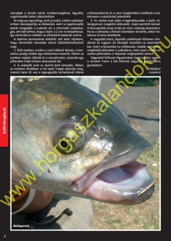 balinhorg%u00e1szat 8maradjak a fonott zsin%u00f3r %u00e9rz%u00e9kenys%u00e9g%u00e9hez, l%u00e1gyabb, rugalmasabb botot v%u00e1lasztottam. Itt m%u00e9g van egy dolog, amit j%u00f3 tudni: a balin rabl%u00e1skor er%u0151sen beszippantja az %u00e1ldozat%u00e1t, ez%u00e9rt a rugalmasabb botok megadj%u00e1k a csalinak azt a minim%u00e1lis szabads%u00e1got, ami kell ahhoz, hogy a balin 1-2 cm-re lenyelhesse. %u00cdgy minim%u00e1lisra cs%u00f6kken az elhib%u00e1zott kap%u00e1sok sz%u00e1ma.A balinok keres%u00e9s%u00e9vel elt%u00f6lt%u00f6tt id%u0151 alatt r%u00e1j%u00f6ttem, hogy h%u00e1romf%u00e9le t%u00e1mad%u00e1si st%u00edlust k%u00fcl%u00f6nb%u00f6ztethet%u00fcnk meg:1. Els%u0151 esetben a balin a csali h%u00e1t%u00e1n%u00e1l t%u00e1mad, a kontaktus pedig ink%u00e1bb egy %u00fctk%u00f6z%u00e9shez hasonl%u00edt. Ebben az esetben r%u00f6gt%u00f6n %u00e1ll%u00edts%u00e1k le a visszah%u00faz%u00e1st, v%u00e1rjanak egy pillanatot majd er%u0151sen akasszanak be.2. A m%u00e1sodik eset az alulr%u00f3l j%u00f6v%u0151 t%u00e1mad%u00e1s. Ebbenaz esetben %u00e1ltal%u00e1ban a hal saj%u00e1t mag%u00e1t akasztja meg, viszont tal%u00e1n itt van a legnagyobb terhel%u00e9snek kit%u00e9ve a felszerel%u00e9s%u00fcnk %u00e9s a nem megfelel%u0151en be%u00e1ll%u00edtott ors%u00f3, k%u00f6nnyen a veszt%u00fcnket jelentheti. 3. Az utols%u00f3 eset tal%u00e1n a leg%u00e9rdekesebb: a balin vill%u00e1mgyorsan megel%u0151zi %u00e1ldozat%u00e1t, majd szemb%u0151l t%u00e1mad. A becsap%u00f3d%u00e1s ereje %u00f3ri%u00e1si %u00e9s nincs sz%u00fcks%u00e9g akaszt%u00e1sra. Ha ez a t%u00e1mad%u00e1s a felsz%u00edn k%u00f6zel%u00e9ben t%u00f6rt%u00e9nik, akkor hatalmas %u00f6rv%u00e9ny keletkezik.A nagyobb test%u0171, kapit%u00e1lis p%u00e9ld%u00e1nyok h%u0151siesen k%u00fczdenek %u00e9s nagyon j%u00f3l kitudj%u00e1k haszn%u00e1lni az %u00e1ramlatokat. Ez%u00e9rt a f%u00e1raszt%u00e1st ne er%u0151ltess%u00fck, ink%u00e1bb v%u00e1rjuk ki a megfelel%u0151 pillanatot a sz%u00e1kol%u00e1sra, mert ezek a halak az utols%u00f3 pillanatban is k%u00e9pesek meglepet%u00e9st okozni. V%u00e9gezet%u00fcl felh%u00edvom figyelm%u00fcket, hogy amikor ezeket a sorokat %u00edrtam a k%u00e9t kil%u00f3sn%u00e1l nagyobb p%u00e9ld%u00e1nyokra gondoltam. G%u00f6rb%u00fclj%u00f6n!- LosoncziBalinportr%u00e9www.horgaszkalandok.hu